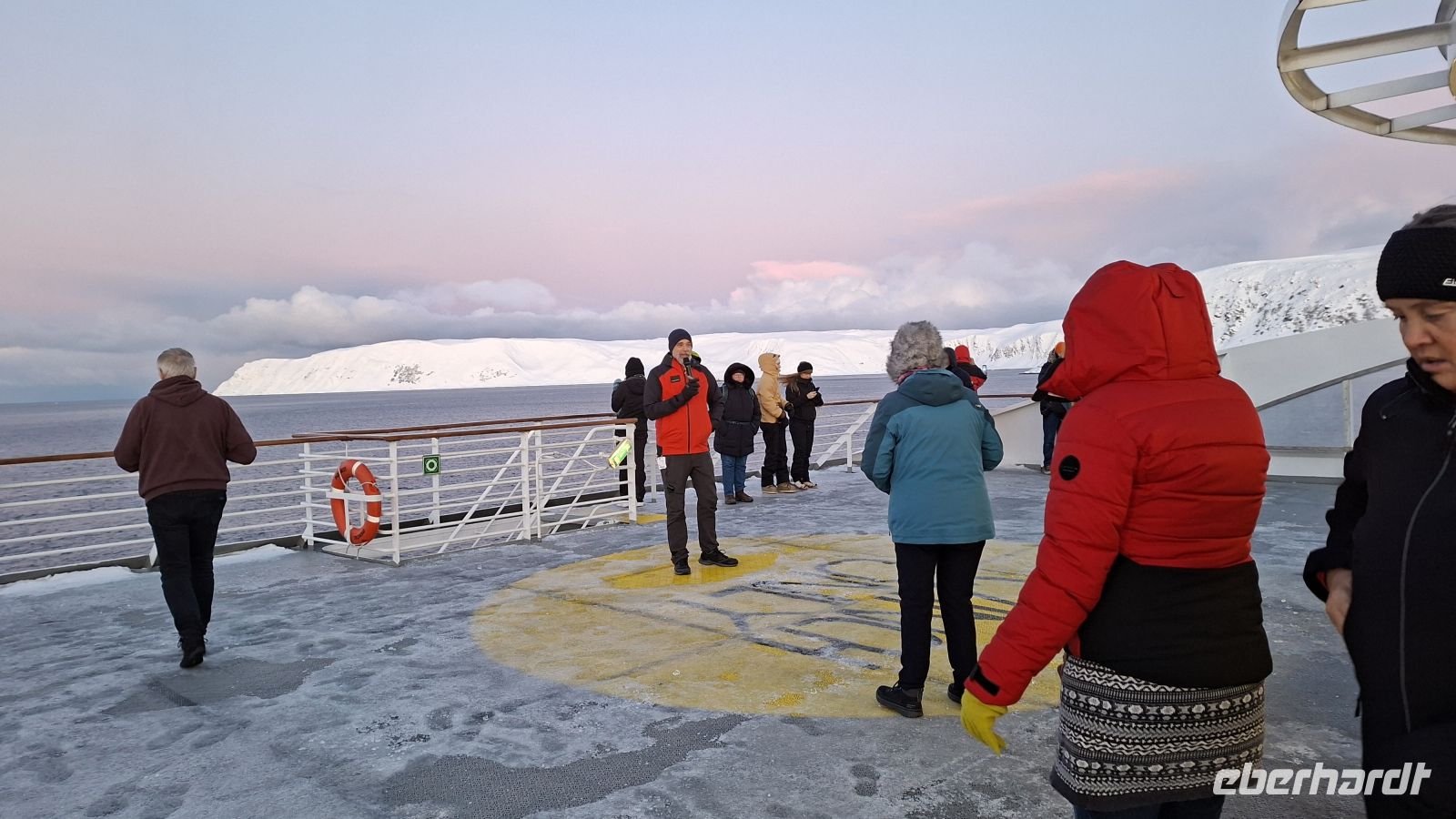 Am Morgen trafen wir uns wieder am Heck des Schiffes – gut eingepackt, die Nasen ein bisschen rot, aber bester Stimmung. Auf dem Programm stand der Interessenpunkt Magerøysundet. Diese Meerenge trennt die Insel Magerøya, auf der das berühmte Nordkap liegt, von der Halbinsel Porsanger auf dem norwegischen Festland. Es fühlte sich ein bisschen so an, als würden wir durch ein Tor ins „richtige“ Nordkapland fahren. Während wir über das Wasser blickten, ahnten wir schon: Heute würde ein ganz besonderer Tag werden.