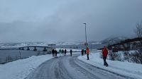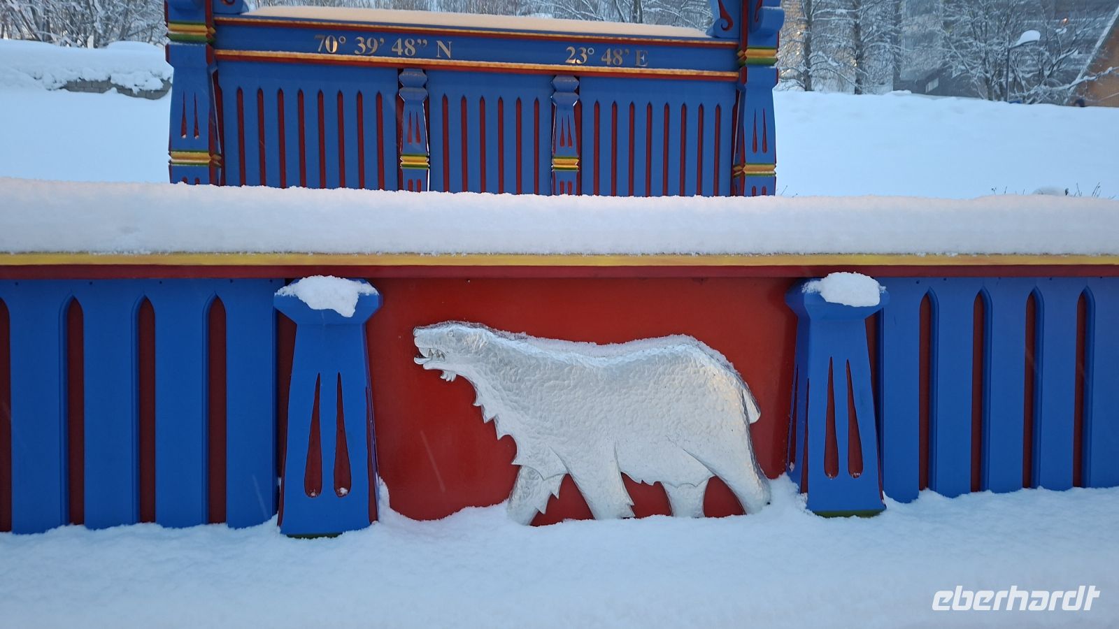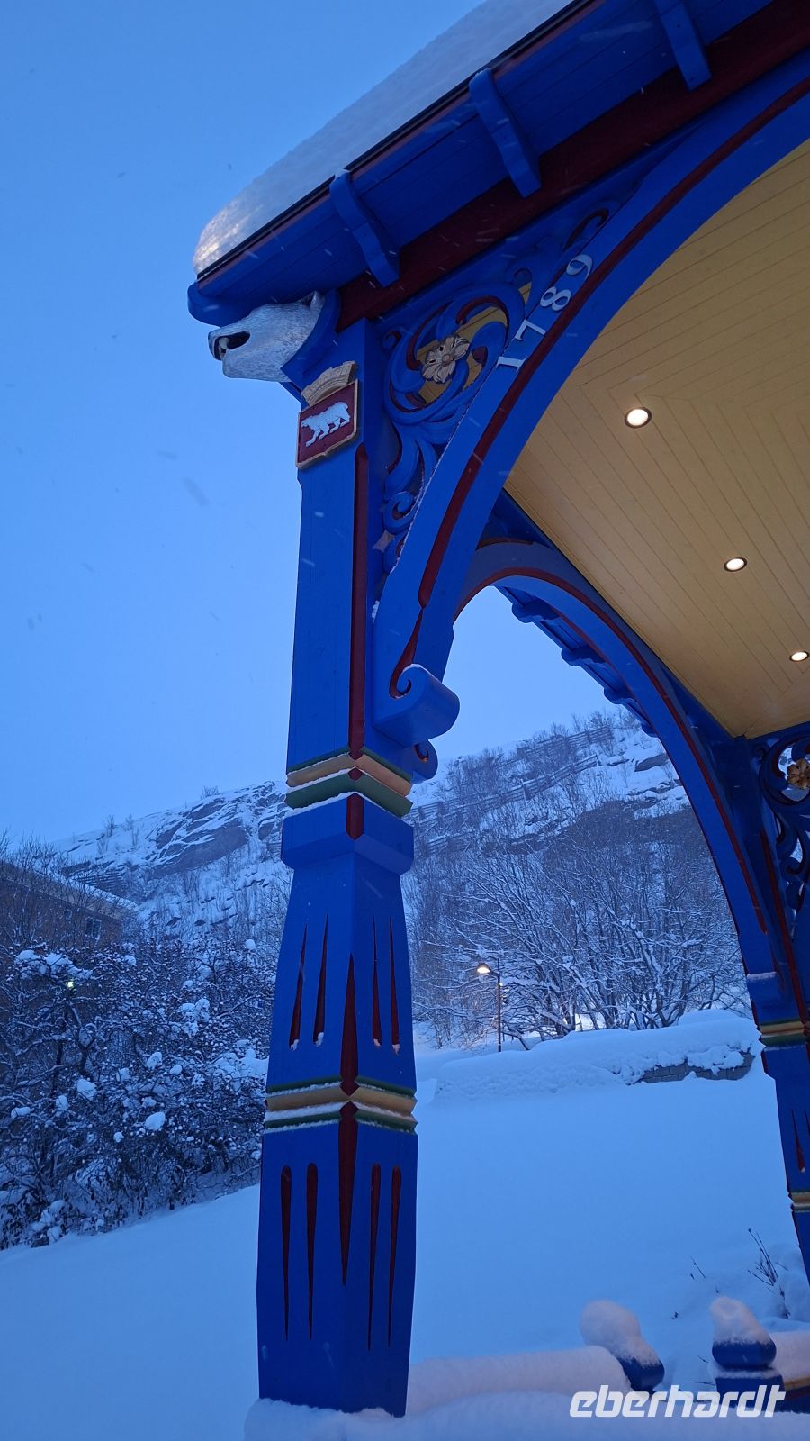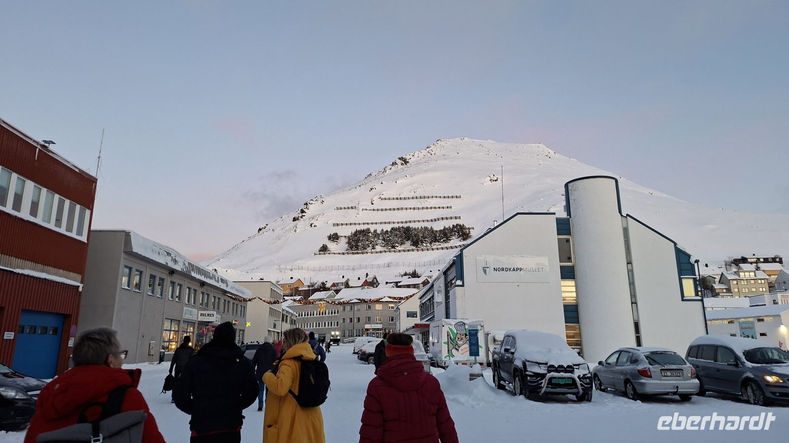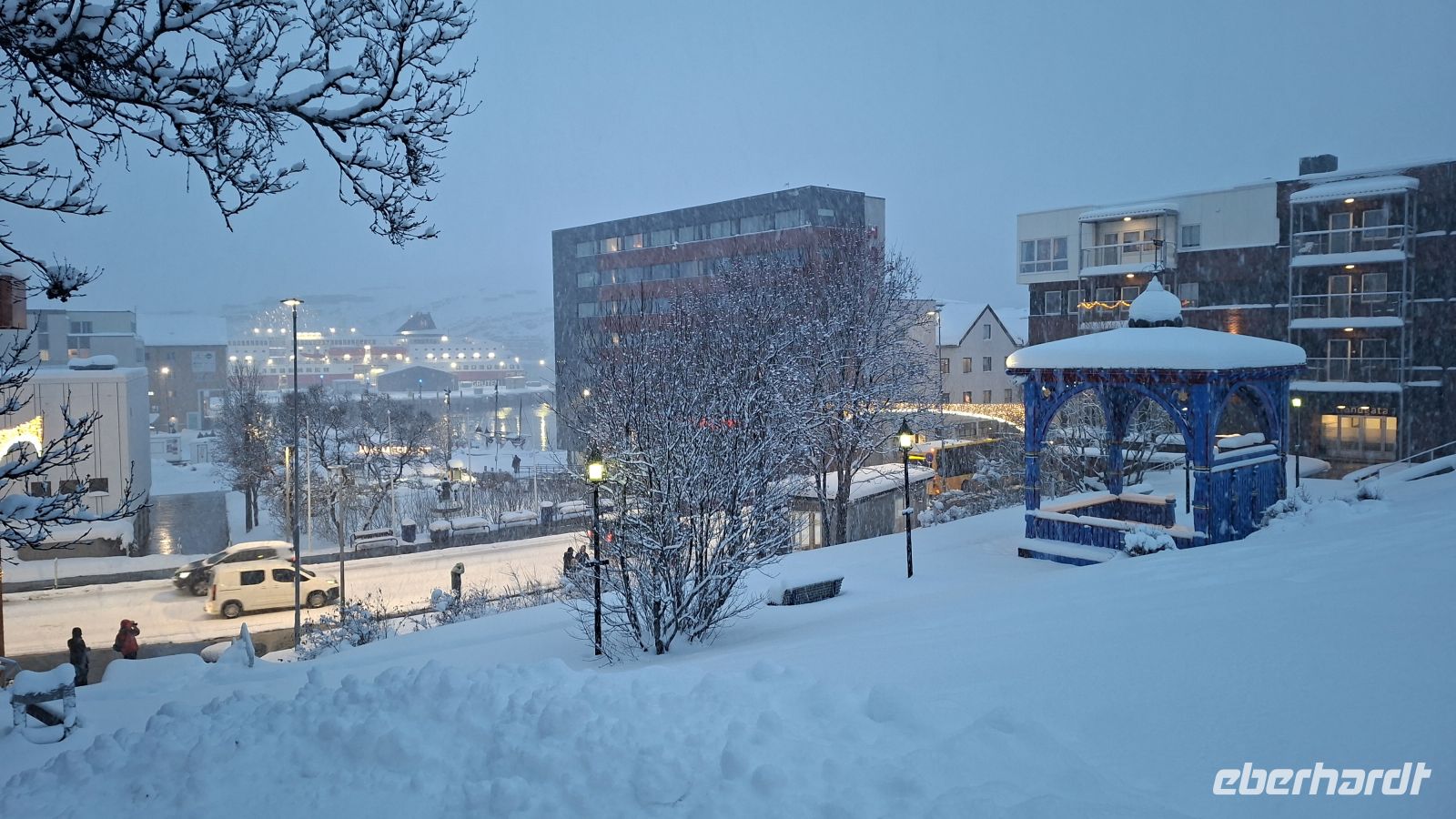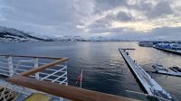 Am späten Vormittag erreichten wir das verschneite Hammerfest, eine der nördlichsten Städte der Welt. Wir unternahmen einen gemeinsamen Spaziergang: zuerst hinauf zur Kirche, die mit ihrer modernen Architektur einen schönen Kontrast zur winterlichen Umgebung bildete, dann weiter zur kleinen Kapelle – dem ältesten Gebäude der Stadt. Von dort gingen wir zu den Wiederaufbauhäusern, die davon erzählten, wie Hammerfest nach der Zerstörung im Zweiten Weltkrieg neu aufgebaut wurde. Im Stadtpark legten wir einen kurzen Stopp ein, atmeten die kalte, klare Luft ein und machten uns schließlich wieder auf den Weg hinunter zum Hafen. Dort blieb noch etwas Zeit, im Shoppingcenter ein paar Kleinigkeiten zu kaufen. Währenddessen begann es wieder zu schneien. Die Flocken tanzten in der Luft, und der Tag wirkte gleich noch ein bisschen nordischer.