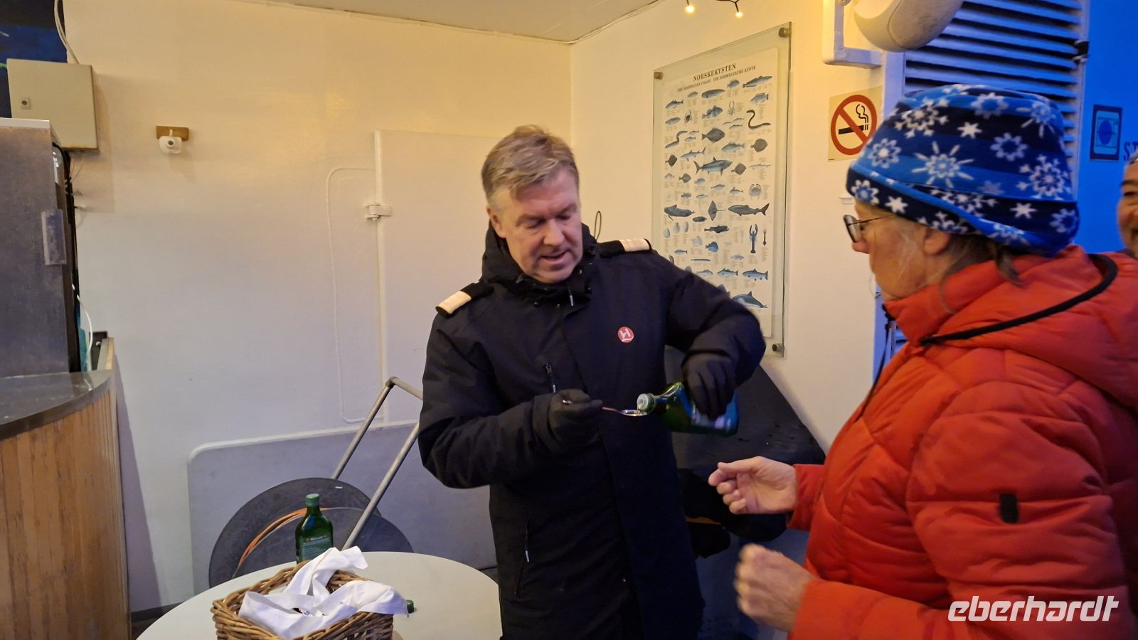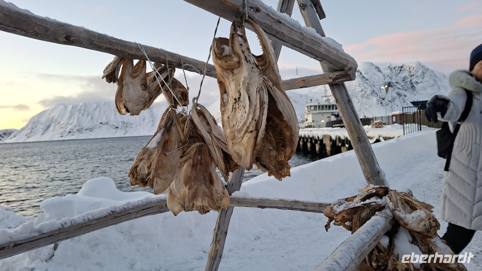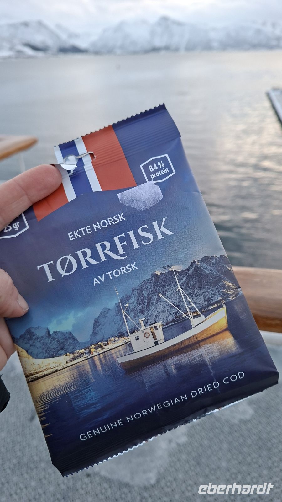 Wieder an Bord gab es eine kleine Trockenfisch-Kostprobe – natürlich im Freien, „wegen des Duftes“. Wer sich traute, probierte ein Stück des typisch nordnorwegischen Stockfischs. Die Reaktionen reichten von „Köstlich!“ bis „Interessant, aber einmal reicht“, doch allein das gemeinsame Probieren hat schon Spaß gemacht.