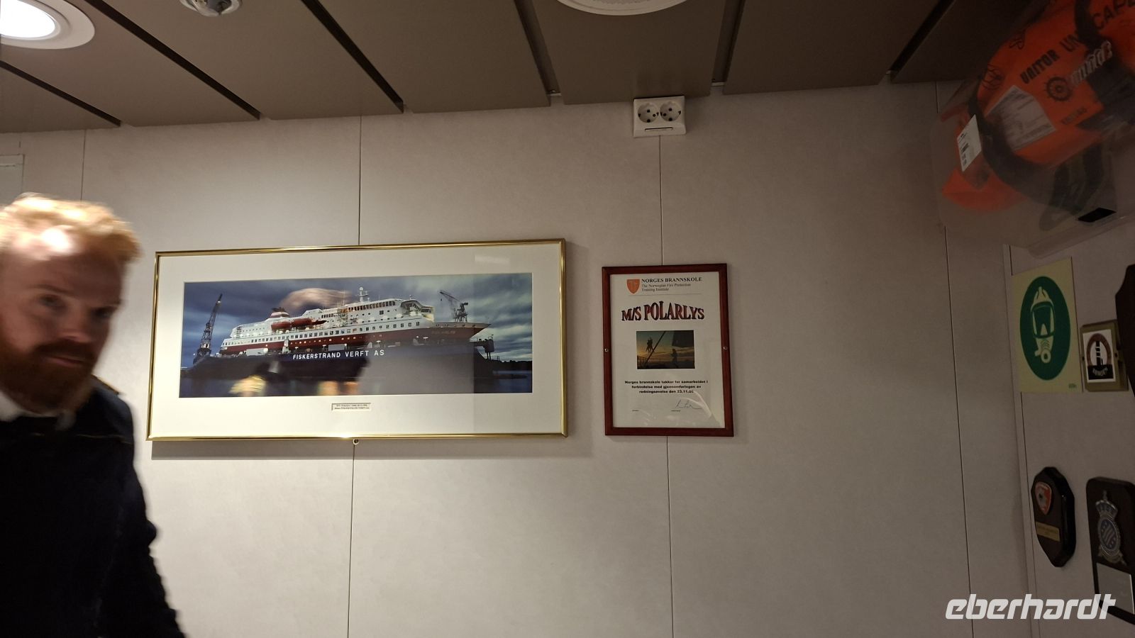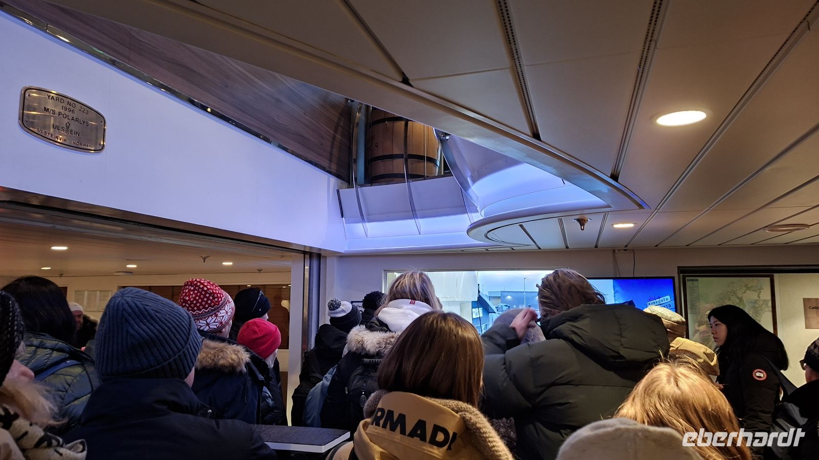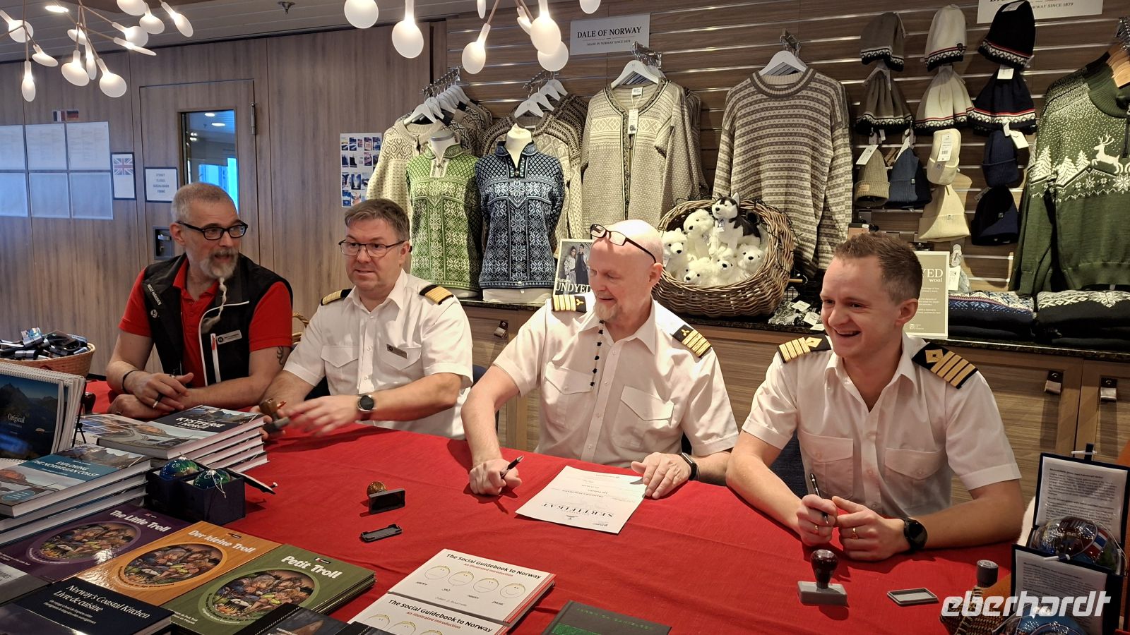 Anschließend stellten sich die Schiffsoffiziere für eine kleine Signierstunde zur Verfügung. Wer wollte, ließ sich Bordkarten, Bücher oder die Polarkreisurkunde unterschreiben, holte sich ein Erinnerungsfoto ab und hatte die Gelegenheit zu einem kurzen Plausch. Es war eine schöne, persönliche Begegnung mit den Menschen, die uns so sicher durch den Norden steuerten.