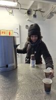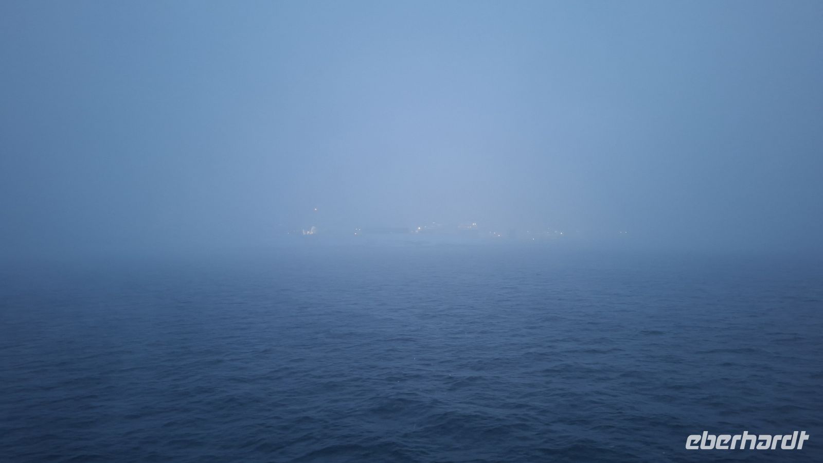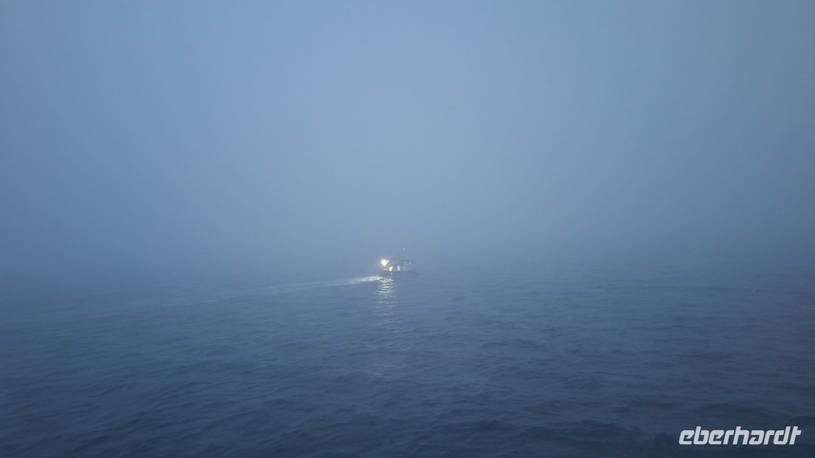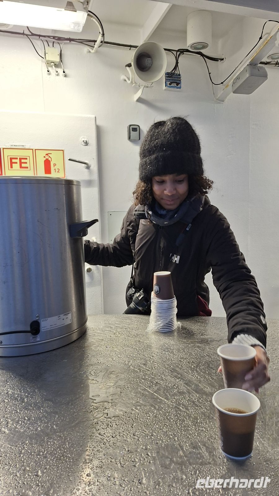 So nebelig wie es war, konnten wir den Interessenpunkt Melkøya nur schemenhaft erkennen. Die Insel tauchte wie ein verschwommener Schatten aus dem Dunst auf. Dennoch erfuhren wir mehr über die LNG-Produktion dort – wie Erdgas aus der Barentssee angelandet, verarbeitet und als Flüssiggas weitertransportiert wird. Dazu wurde uns der berühmte Energiekaffee serviert, und der tat wirklich allen gut: ein kleiner kräftiger Schluck in der Tasse, ein großer Schub Wärme und Wachheit im Körper.