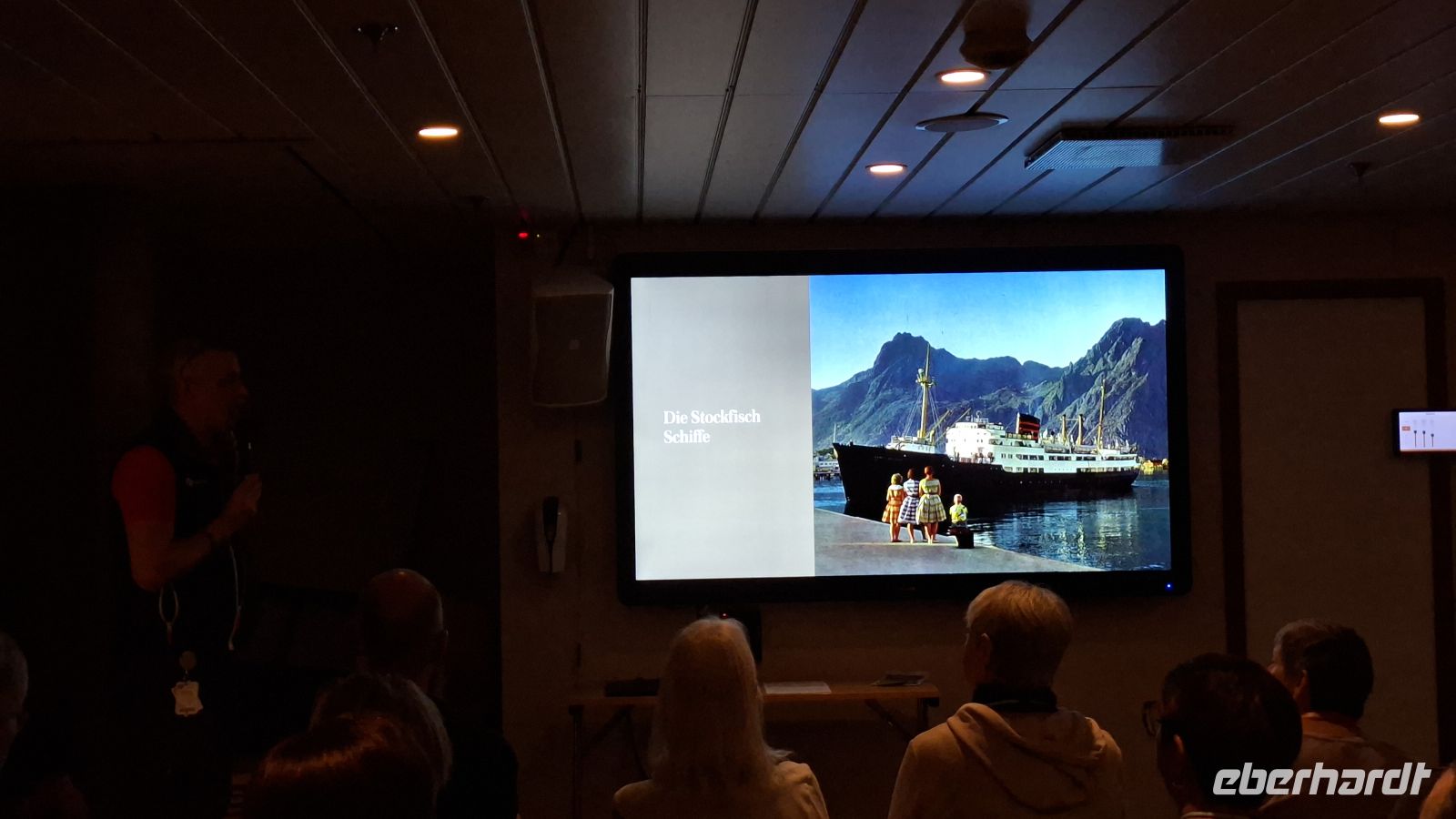 Nach dem Mittagessen lauschten wir einem Vortrag über die Geschichte der Hurtigruten. Wir erfuhren, wie die Postschiffe einst als lebenswichtige Verbindung zwischen den abgelegenen Küstenorten entstanden, wie sich die Route im Laufe der Jahrzehnte entwickelte und warum sie bis heute für viele Menschen im Norden viel mehr als „nur“ eine Schiffsverbindung ist. Es war spannend zu hören, dass wir nicht einfach auf einem Kreuzfahrtschiff unterwegs waren, sondern auf einem Stück lebendiger norwegischer Geschichte.