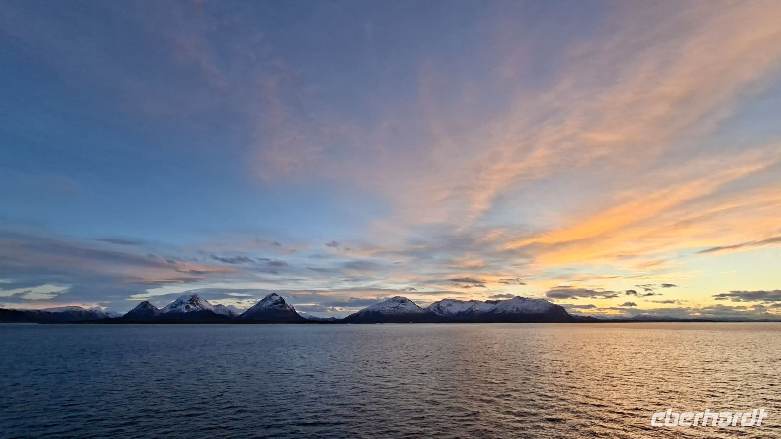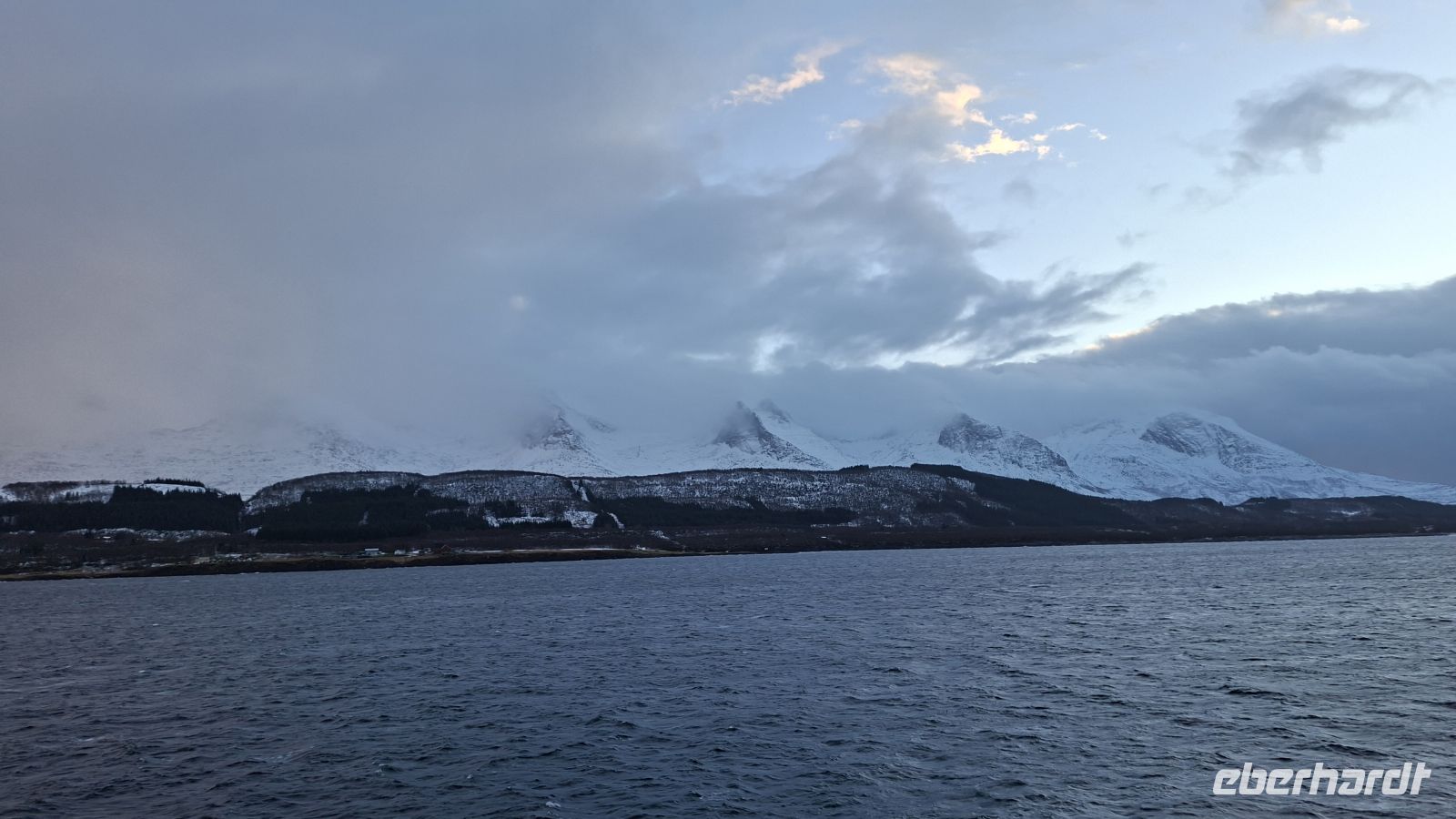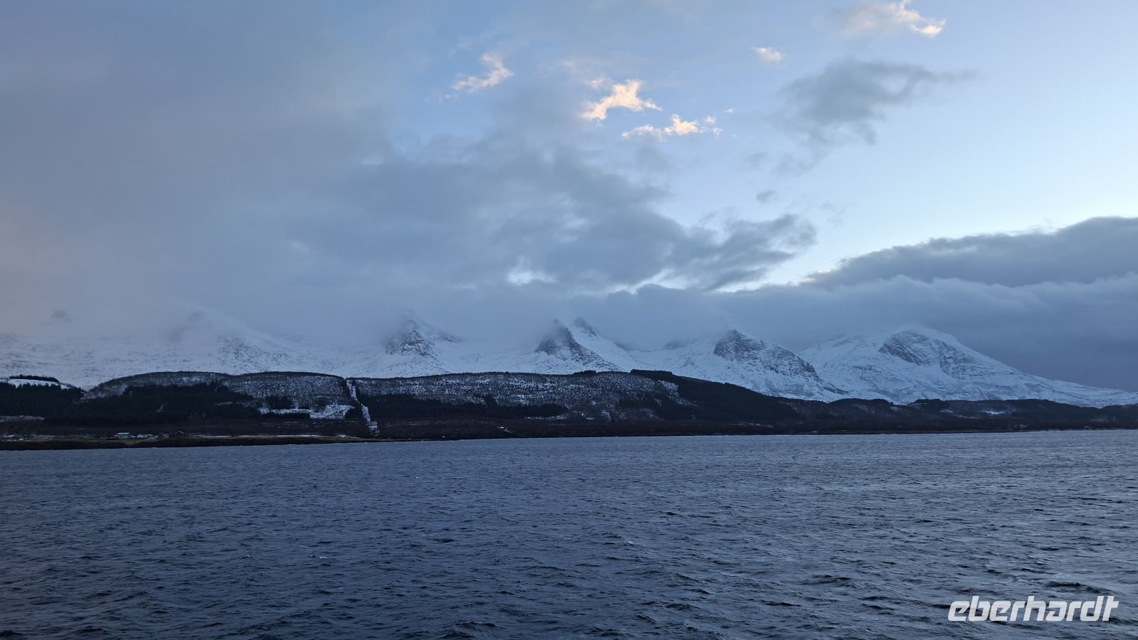 Entlang der Helgelandsküste begleiteten uns an diesem Tag wieder einmal grandiose Landschaften. Inseln, Schären, schneebedeckte Gipfel und kleine Höfe am Ufer zogen an uns vorbei – eine dieser Strecken, bei denen man gar nicht weiß, ob man zuerst staunen, fotografieren oder einfach nur schauen soll.
