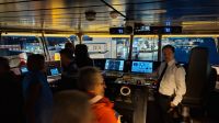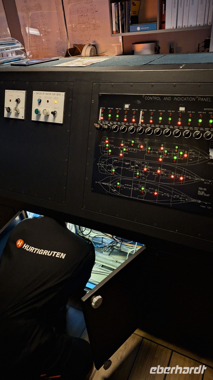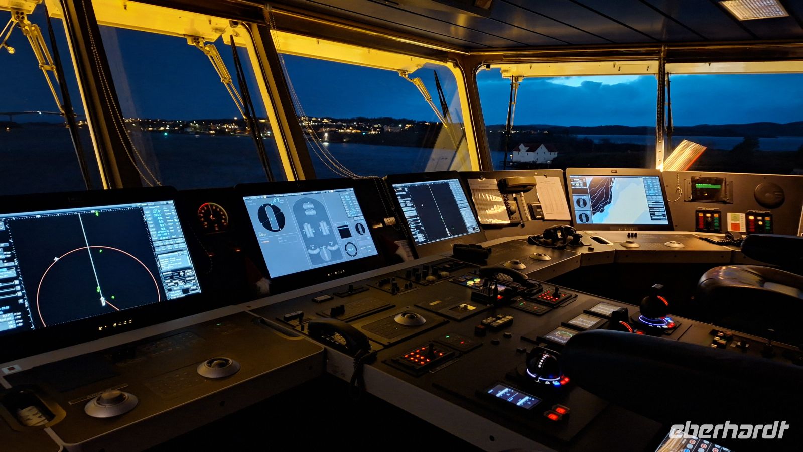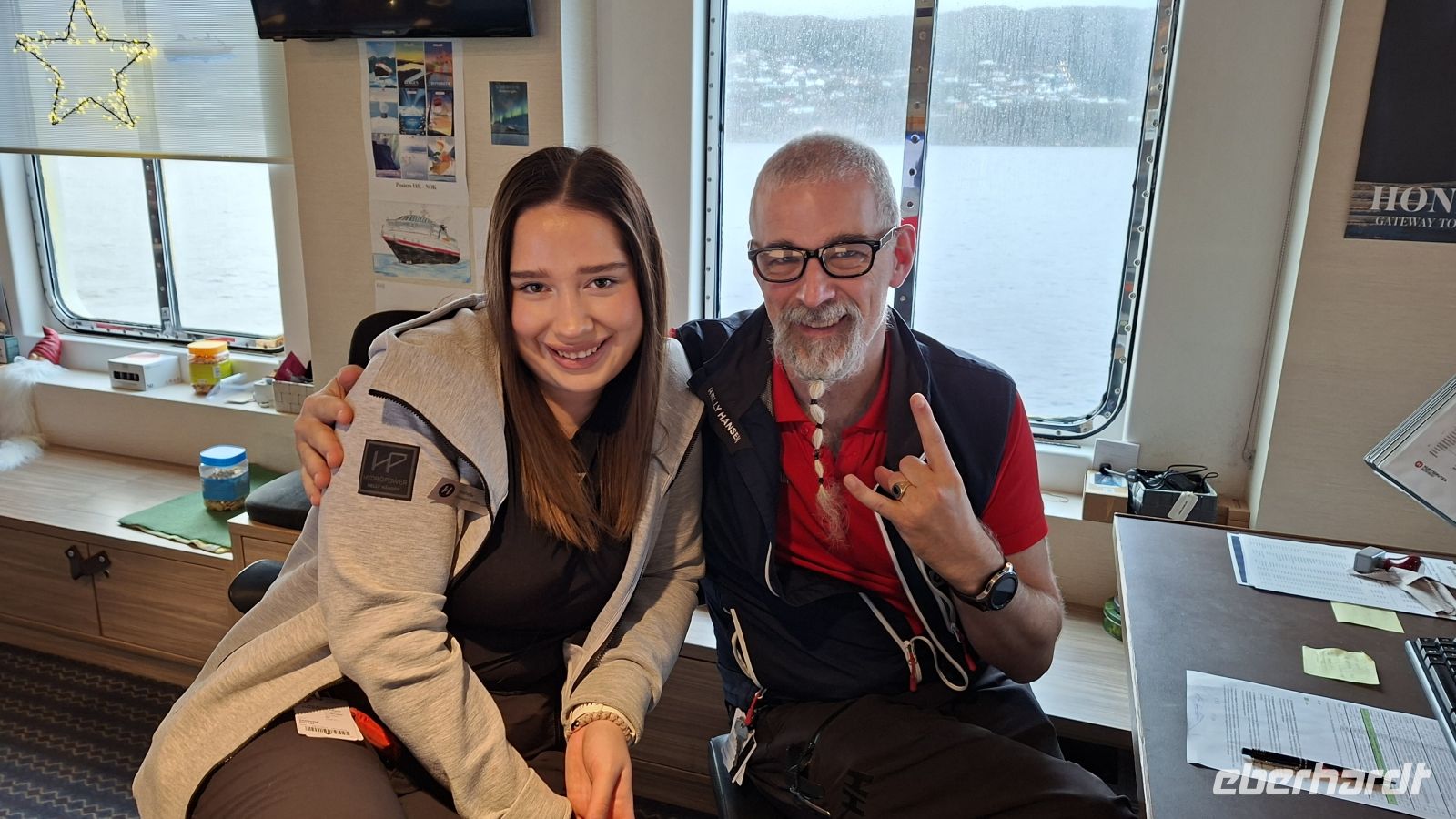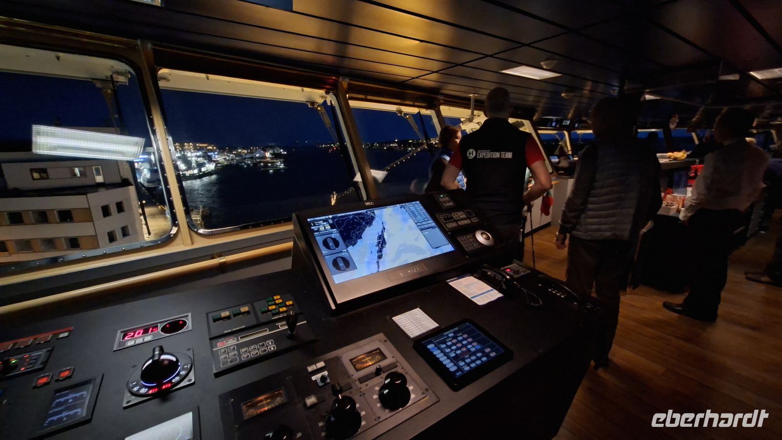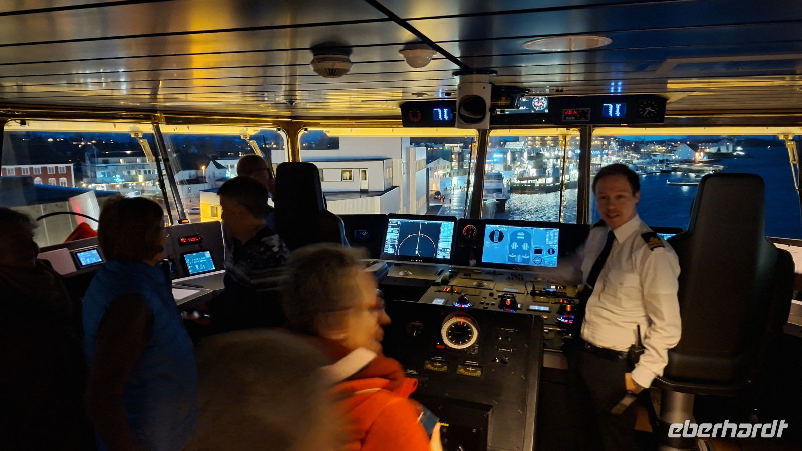 Am Nachmittag wartete ein kleines, aber feines Highlight auf uns: Im Hafen von Brønnøysund durften wir die „heiligen Hallen“ des Kapitäns, also die Brücke der MS Polarlys, besuchen. Gemeinsam mit Jan begutachteten wir die Instrumente: Radarbildschirme, Steuerstand, Funkanlagen – das ganze technische Herz des Schiffes. Durch die großen Fenster bot sich ein fantastischer Blick nach vorn; hier oben wurde uns noch einmal bewusst, wie viel Konzentration und Erfahrung nötig sind, um das Schiff sicher durch Fjorde, Inseln und enge Passagen zu steuern.