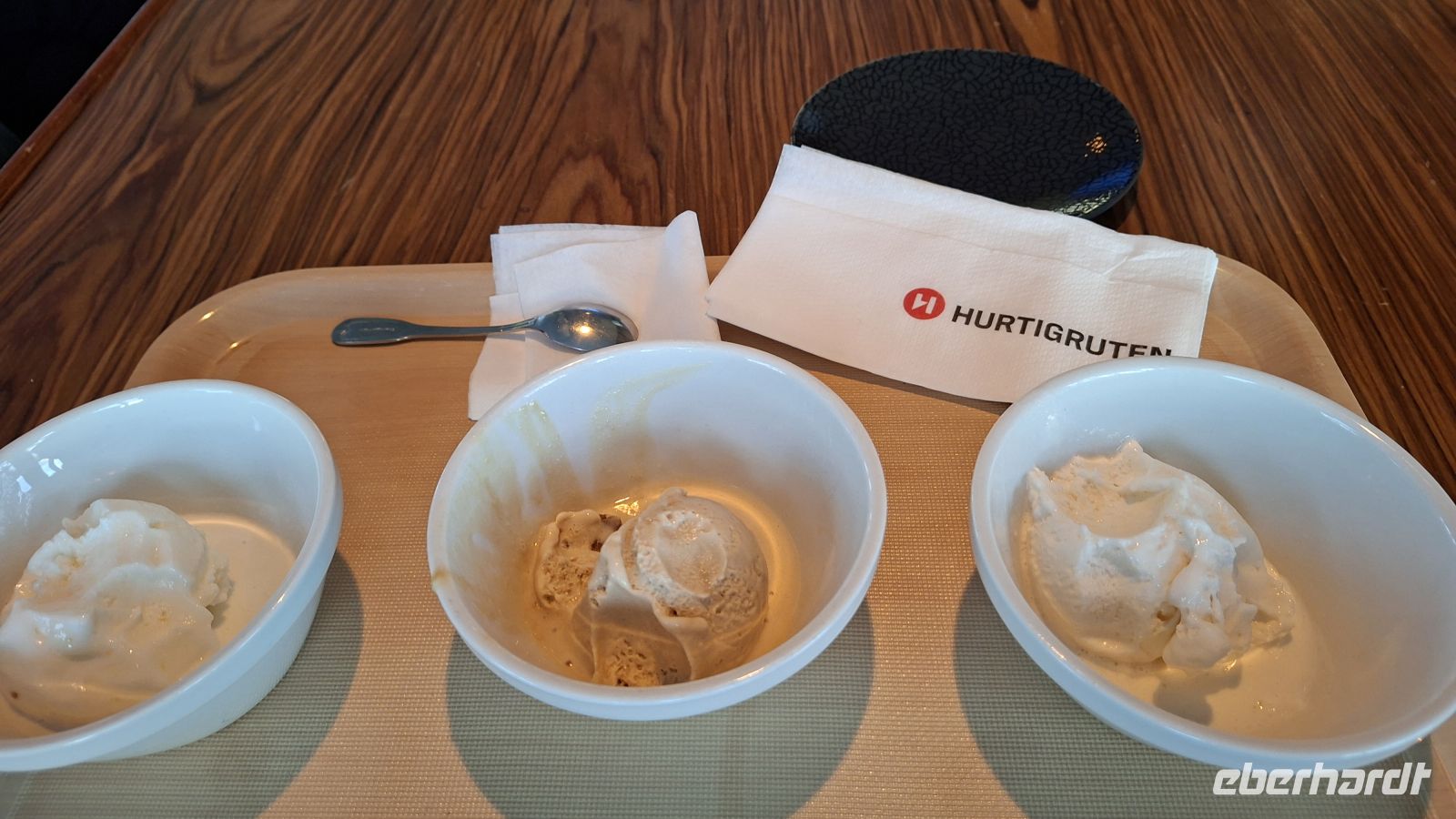 Nach dem Mittagessen ließen wir uns die Zeit nicht nehmen, noch einmal die vorbeiziehenden Landschaften zu genießen. Fjorde, Inseln, Berge – wir sahen nun alles mit diesem „Letzter-Blick“-Gefühl. Als wäre das nicht genug, bescherte uns das Wetter sogar doppelte Regenbögen, die sich über Wasser und Küste spannten. Zwischendurch kosteten wir noch besondere Eissorten wie Stockfisch, Bier und Lakritze – ungewöhnlich und überraschend. Ganz nebenbei begannen wir so langsam, die Koffer zu packen, ein leiser Hinweis darauf, dass unsere Zeit an Bord sich dem Ende näherte. Bevor der Nachmittag verflog, genossen wir noch ein letztes Expeditionsteam-Treffen mit Jan, hörten seine Geschichten, Tipps und kleinen Anekdoten – und waren ein bisschen wehmütig, dass es diesmal wirklich das letzte Treffen war.