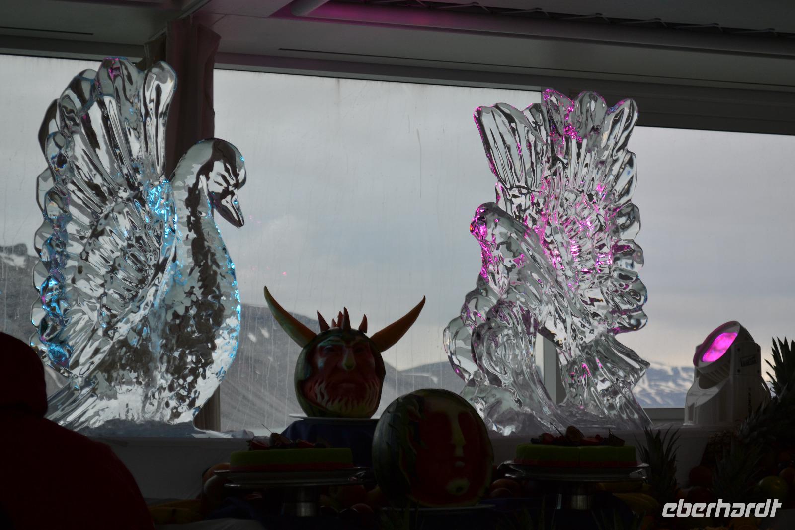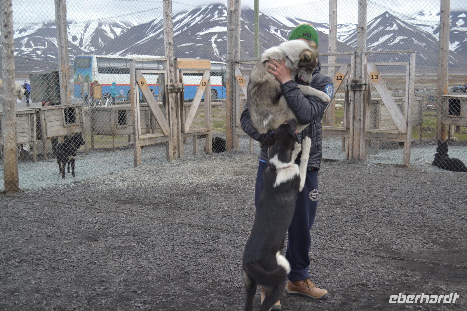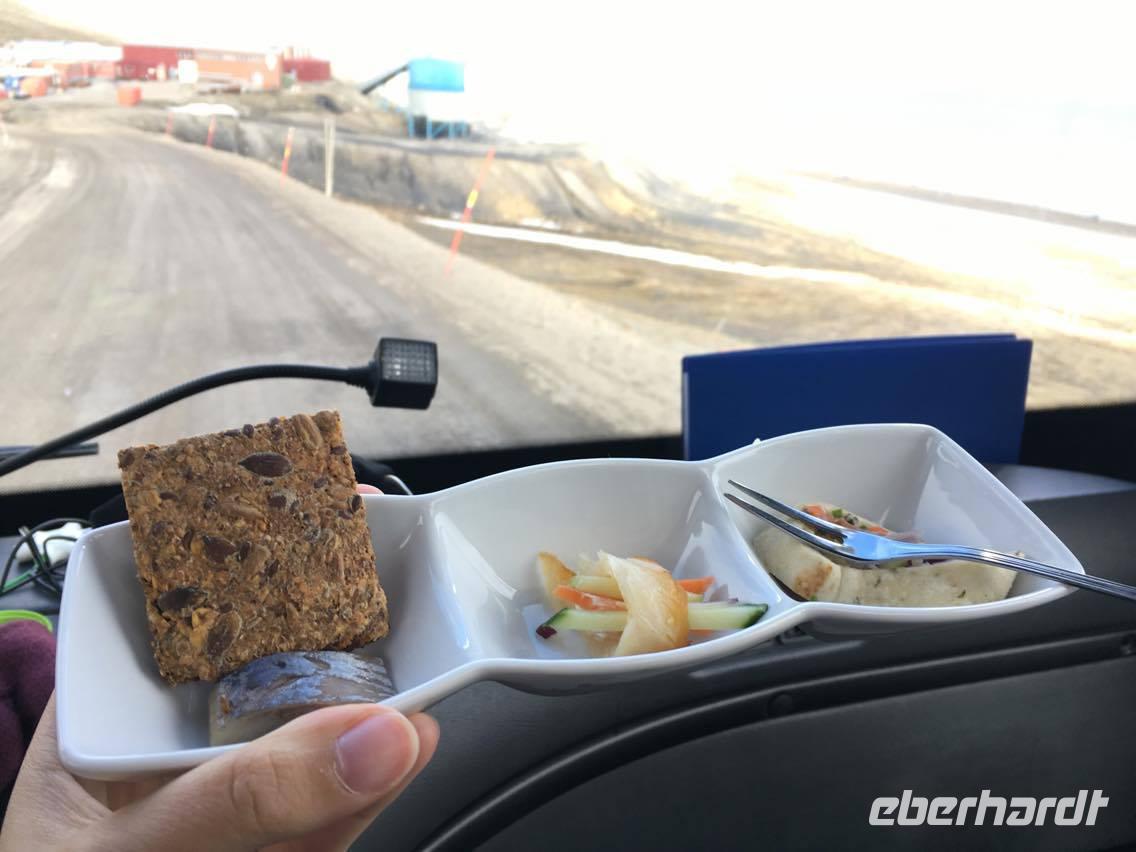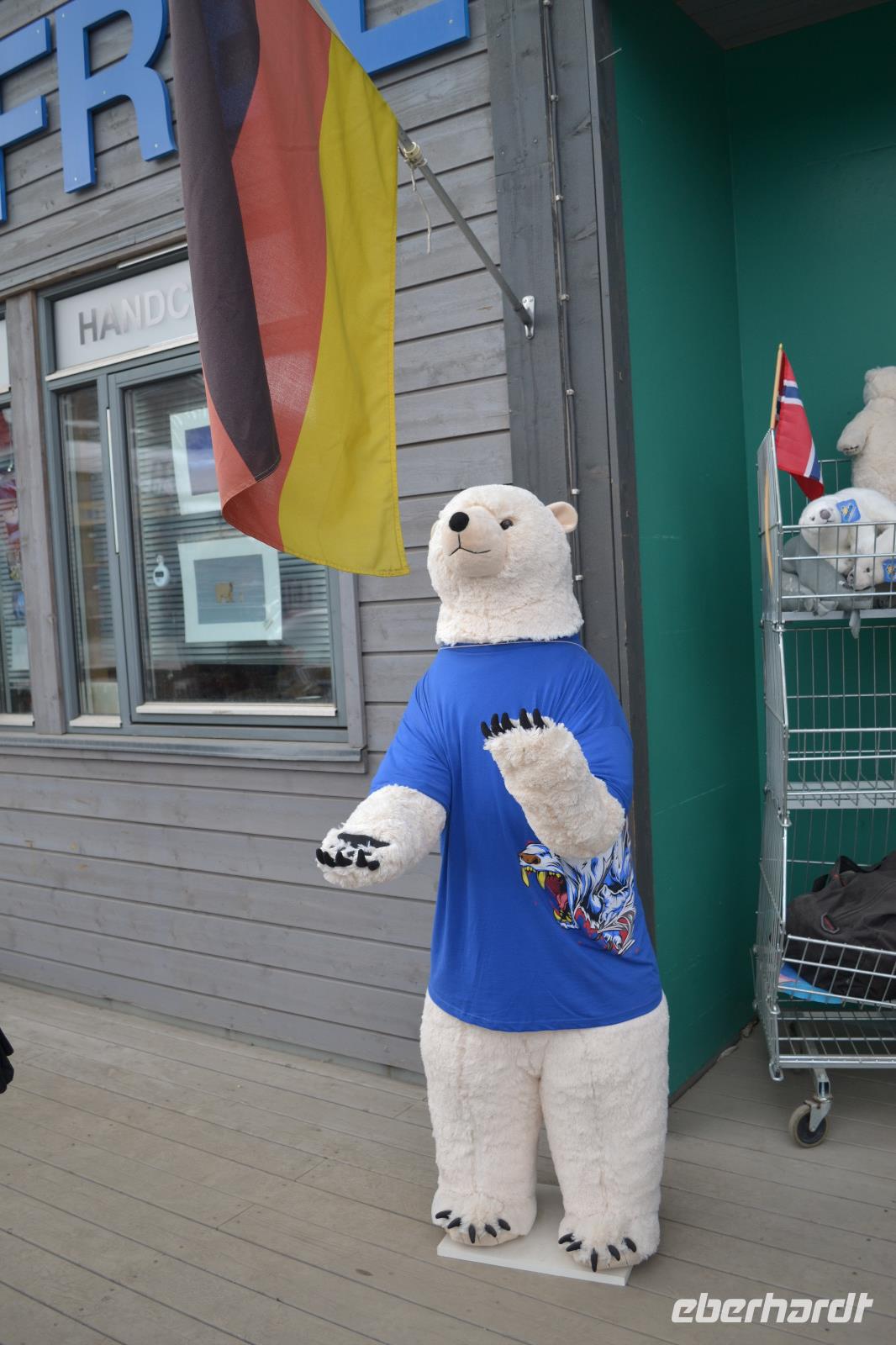 Heute trafen wir uns direkt nach dem Frühstück zusammen um gemeinsam für unseren besonderen Ausflug von Schiff zu gehen. Pünktlich 10 Uhr traf Driverguide Bent mit seinem Arctic Tapas Bus im Cruise Terminal ein. Wir bestiegen den Bus mit Spannung - die Inneneinrichtung bestach durch die vielen Tierfelle über den Sitzen und den Bildern an den Gepäckfächern. Da Bent uns die Geschichte von Spitzbergen während der Fahrt auf Englisch erklärte übersetzte Reisebegleitung Laura durch das Mikrofon. Zunächst führte er uns von den Wolken weg in Richtung der Sonne zu den Gletschern. Dort servierte uns seine Angestellte, die Ukrainerin Galina die ersten drei Fischtapas - junfreulicher Hering, etc. Danach ging es sowohl mit dem Bus, als auch mit den Tapas weiter. Der zweite Gang waren 3 Sorten Fleisch von arktischen Tieren. Zum einen geräuchertes Herz von einem Rentier, weiter ging es mit Schweinefleisch von dem Schenkel und vom Eisbären. Bent führte uns der Weile vorbei an der Samenbank, worin vor allem die Deutschen in einem großen Metallgebäude wichtige Pflanzensamen lagern, um damit für Hungersnot oder Krankheit aus zu sorgen. Er erklärte uns die Gebäude und verschiedenen Ämter im „Regierungsviertel" unweit der Kirche. Dort wurden uns auch die letzten Tapas aus Ziegenkäse serviert, bevor es für uns weiter zu den Huskys ging. Auf der Farm angekommen begrüßten uns bereits um die 50 Hunde, darunter auch 5 Monate alte Jungtiere, welche für uns später zum Spielen und streicheln frei gelassen wurden. Nach einer kurzen Einweisung durch den Sohn der Besitzerin, welcher dort mit seiner Lateinamerikanischen Frau lebte, konnten wir uns auch auf dem Grundstück noch ein wenig umsehen. Es war umgeben von Eiderenten und weiteren Vogelarten. Die Besitzerin, welche bereits seit 41 Jahren auf Spitzbergen verweilt, verteilte warmen Punsch, Kekse und Eierkuchen. Wir genossen auch die warme Hütte mit einer Feuerstelle. Nach unserem Aufenthalt verabschiedeten wir uns von Bent und Galina. Einige Gäste verließen den Bus bereits im Ortszentrum, um den Weg zum Schiff mit einem Bummel durch die Straßen vorbei an den Rentieren zu verbinden. Die anderen wurden direkt am Schiff heraus gelassen. Alle Gäste verbrachten den Nachmittag individuell. Am Abend fand die Polareis-Nacht auf dem Pooldeck statt. Dabei holte der Stuffkapitän vom Gletscher ein Stück Eis an Bord welches dann für verschiedene Rumsorten verwendet wurde.