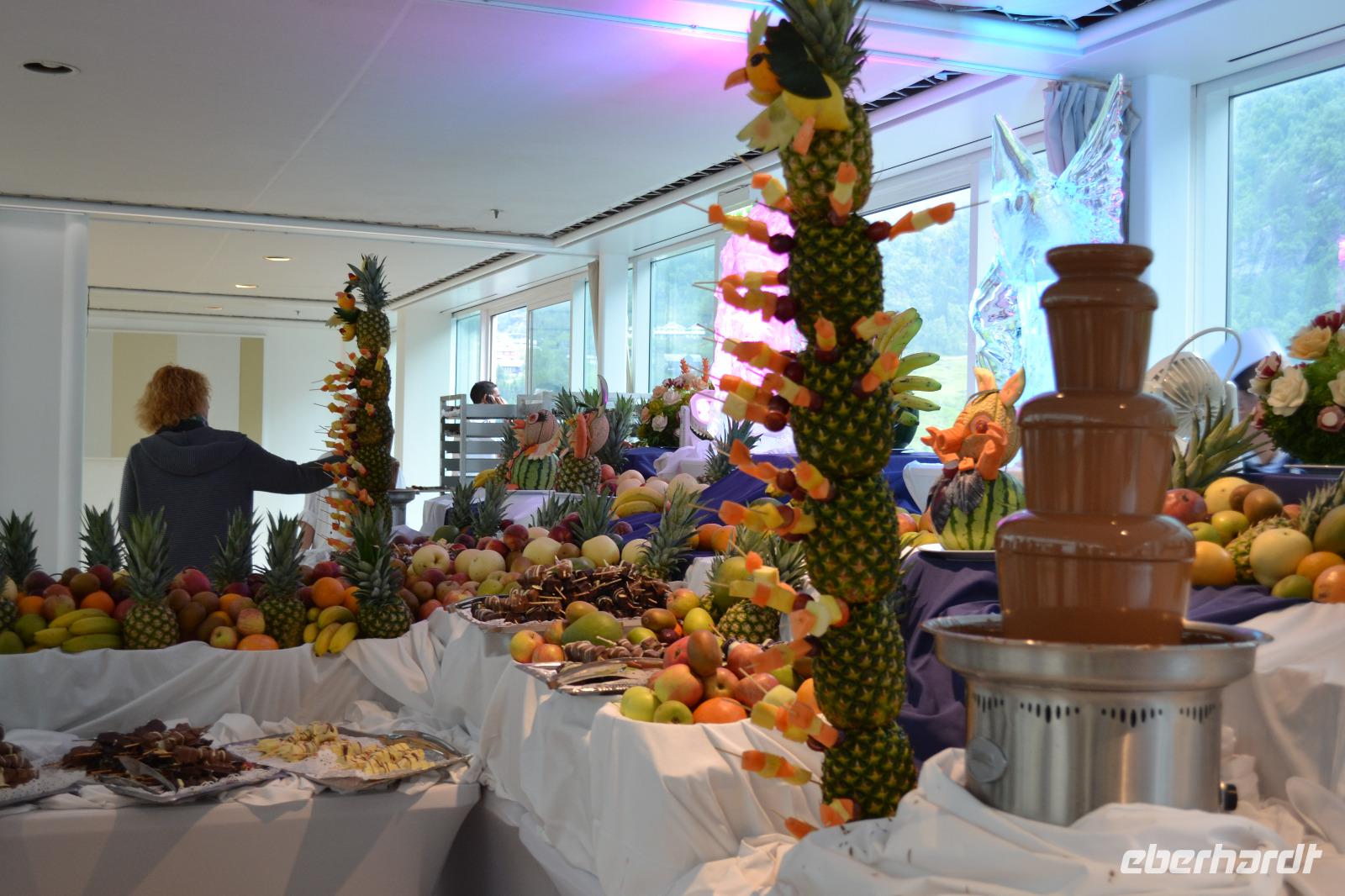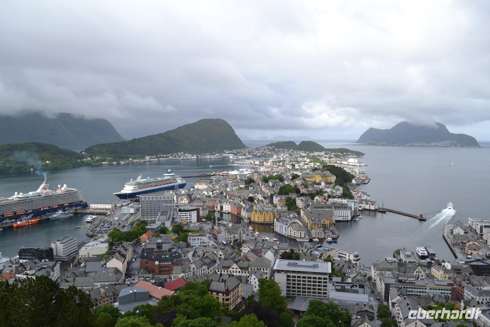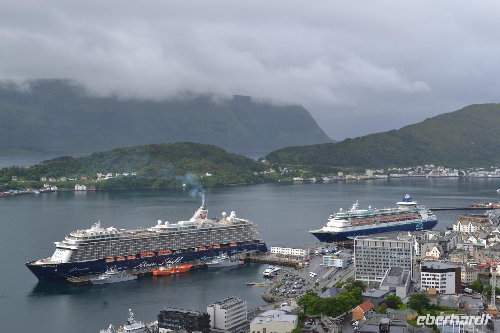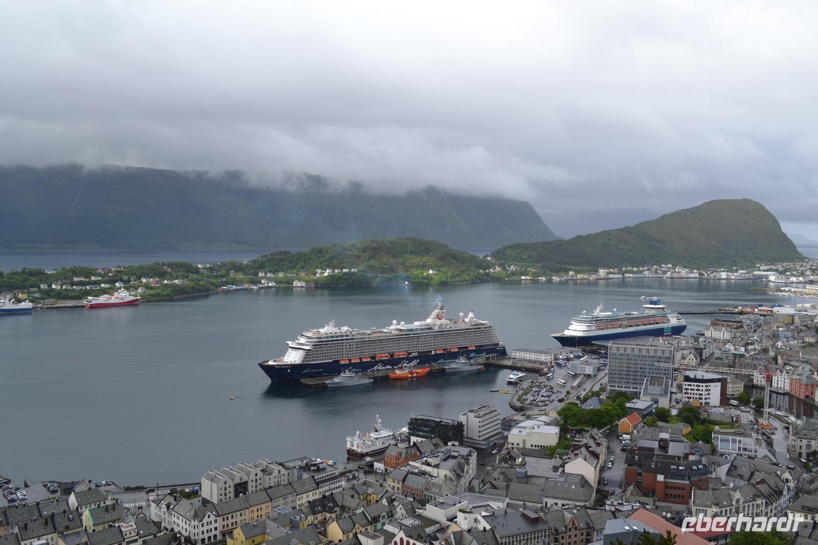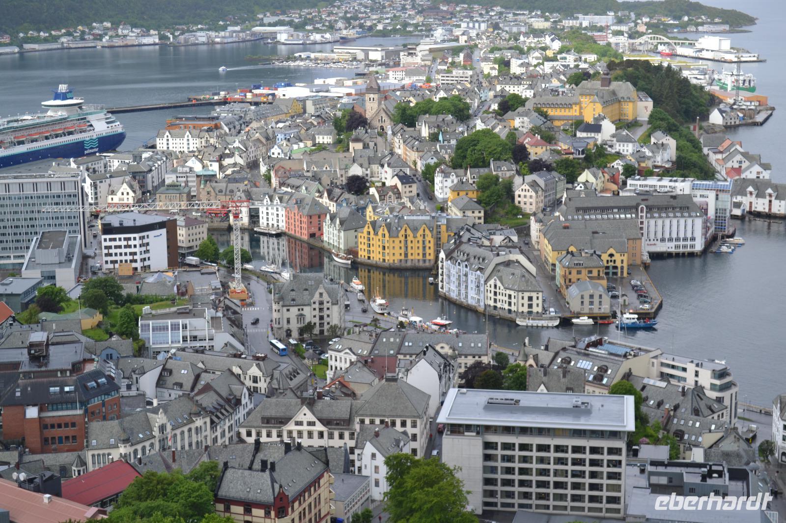 Da unsere Anlegezeit im Hafen heute nur sehr kurz war, ging es bereits für viele Gäste am frühen Morgen auf die ersten Besichtigungstouren. Dies merkte man spätestens am Hausberg Aksla, denn dort standen jede Menge Busse mit Touristen von den Schiffen und der Umgebung. Trotz dem typisch norwegischen Wetter hatten wir zum fotografieren eine gute Sicht auf die einzelnen Inseln Ålesunds. Weiter ging es in die farbenprächtige Innenstadt mit den wunderschönen Jugendstilbauten und Speicherhäusern. Einige Gäste besichtigten heute Europas größtes Meeresaquarium, andere fuhren mit dem Bus entlang des Hafens. Am späten Vormittag trafen dann alle Gäste wieder mit Ihren Bussen ein, denn heute rissen die Leinen früher als gewohnt schon mittags los. Dann hieß es wieder Entspannung auf dem Schiff bis zur Ankunft in Kiel. Bevor es zum Abendessen ging trafen sich alle Gäste in der Meerleben Bar zu ersten wichtigen Informationen für die Abreise, wobei wir daran noch nicht denken wollten.
