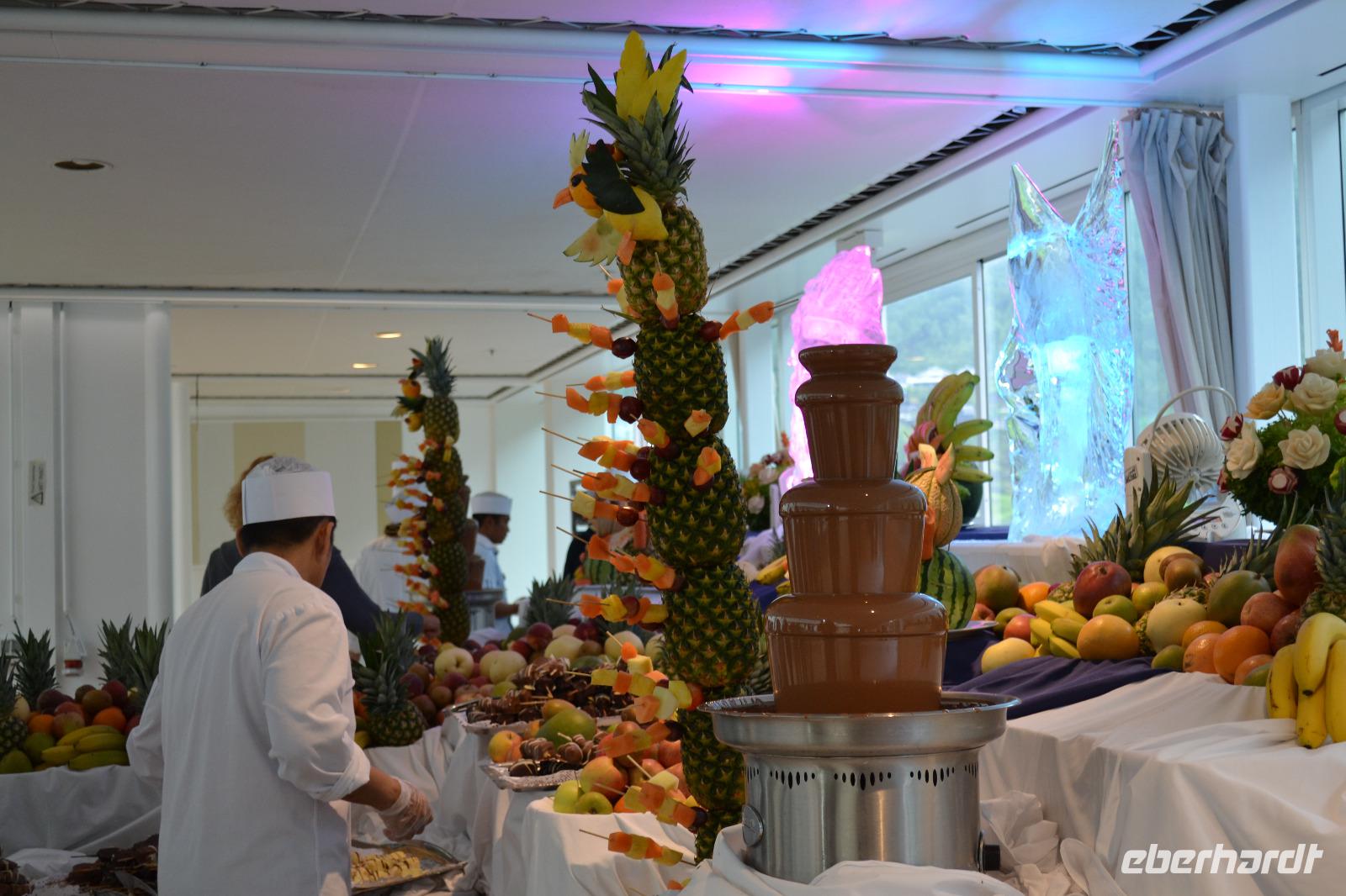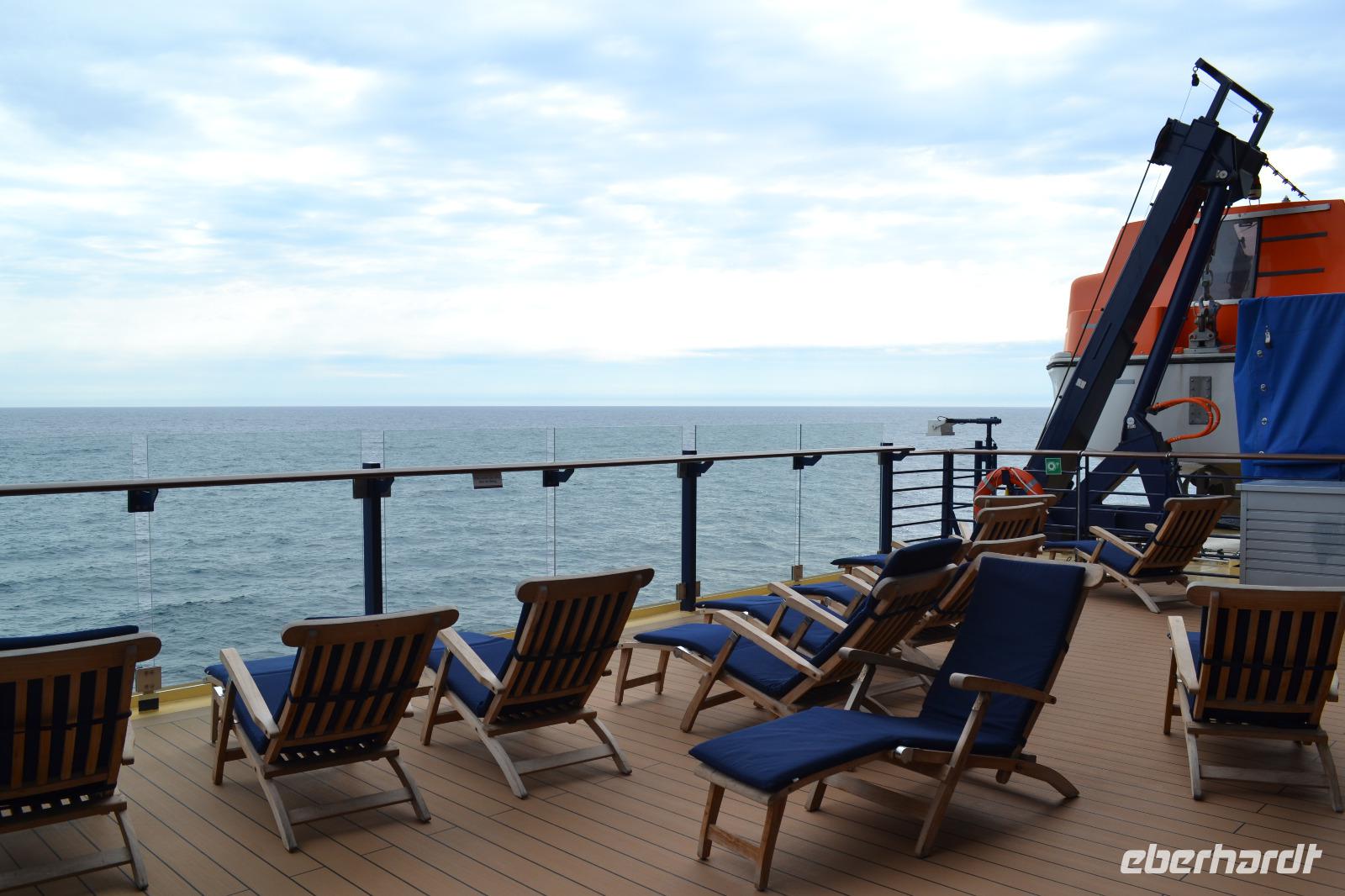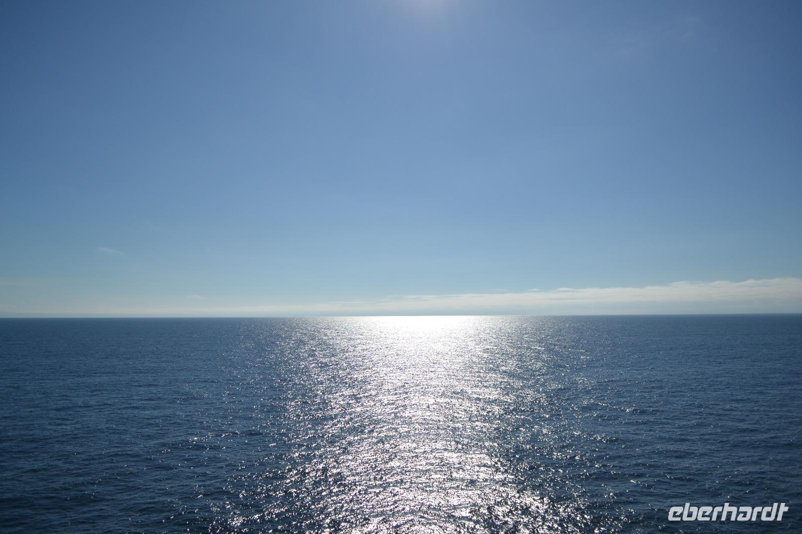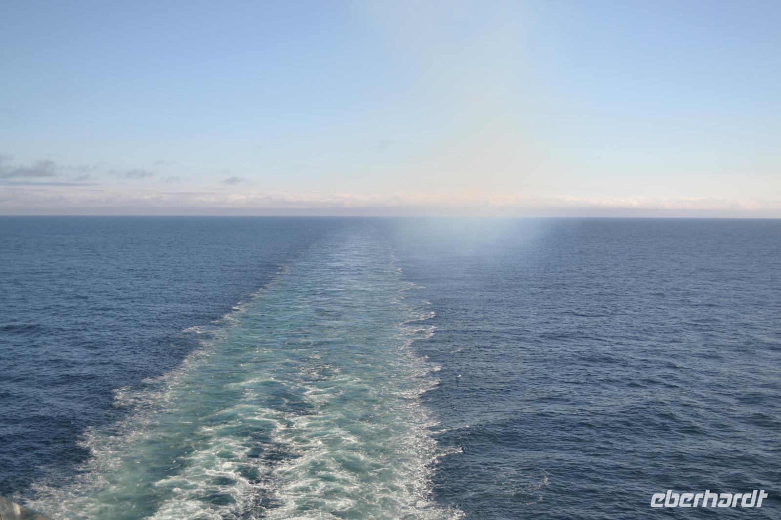 Nach einem langen Abend schliefen wir am Morgen etwas länger, denn heute durften wir den Tag auf dem Schiff genießen. Am Vormittag besuchten fast alle Gäste den interessanten Vortrag der Lektorin Ingeborg Schneider im Theater, über das wundervolle Nordkap. Am Nachmittag trafen wir uns zum Kaffeetrinken und tauschten unsere Eindrücke zu den verschiedenen Landausflügen aus. Danach stand die Polartaufe auf dem Sonnendeck bevor, denn am Vormittag überschritten wir die unsichtbare Polargrenze. Bei der Taufe hielten Neptun und seine Frau Thetis eine Ansprache, bevor es für den Kapitän, den Generalmanager und den Kreuzfahrtdirektor mit kompletter Uniform in den Außenpool auf Deck 12 ging. Anschließend durften sich alle Passagiere das Polarkreis Zertifikat persönlich bei Neptun und seiner Frau abholen. Doch bevor man diese Urkunde in den Händen halten konnte ging es nach einer langen Warteschlange zur Verkostung der Froschschleimsuppe und zum Küssen eines Fisches. Nach einem sonnigen Nachmittag auf den oberen Decks ging es für ein paar Gäste zur Celebration Party in das Theater.