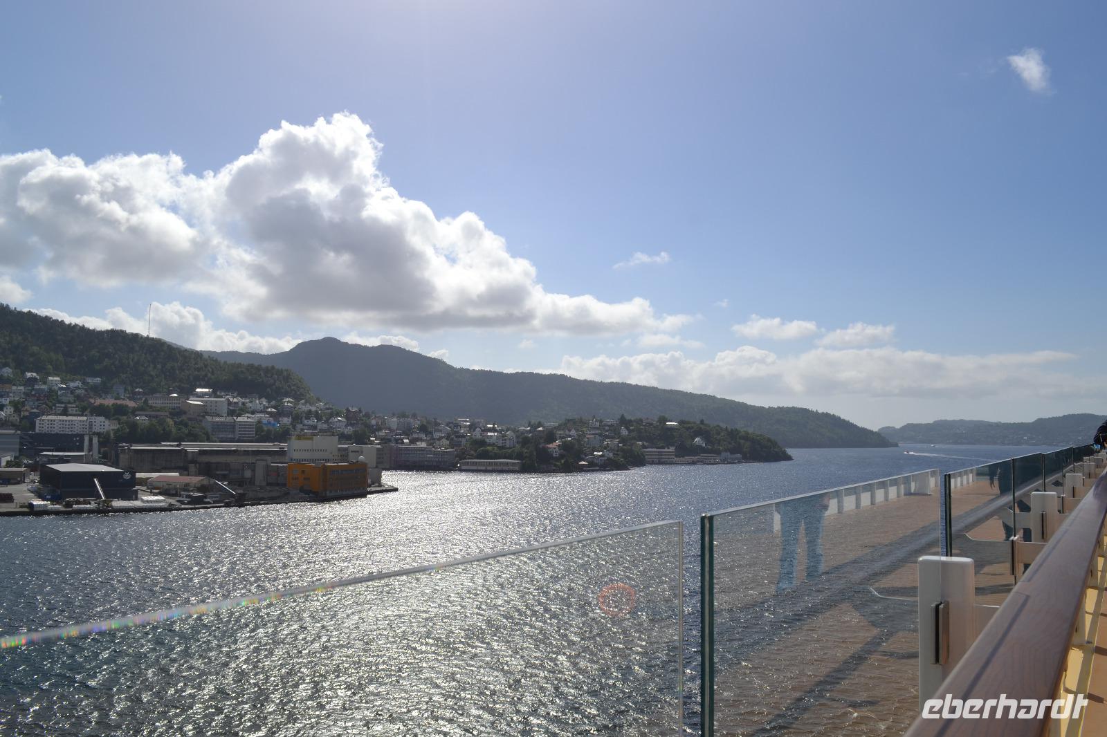 Bereits am Morgen trafen wir uns pünktlich 8:30 Uhr in der Meerleben Bar, um von Schiff zu gehen und den Tag in Bergen zu genießen. Während wir noch auf unseren Bus warteten regnete es, doch unser Reiseleiter machte uns Hoffnung auf Besserung. Um der Nässe zu entfliehen besichtigten wir die Fjorde Bergens mit dem Bus und hielten unterwegs zu regelmäßigen Fotostopps. Highlights waren die Hansestadt, der Hafen und der Fischmarkt. Im Anschluss daran fuhren wir noch einmal durch die Stadt zu der Floibahn. Oben auf dem Aussichtspunkt Floyen angekommen, hatten wir trotz Nebel eine tolle Sicht auf Bergen und die wunderschöne norwegische Landschaft. Zum Mittag trafen wir wieder am Hafen ein und verabschiedeten uns von dem örtlichen Reiseleiter. Den Nachmittag verbrachten wir individuell an Bord. Am Abend konnten sich trotz vorheriger Abneigung doch noch der ein oder andere Gast zu der Schlager Party im Theater überwinden und hatten dabei sehr viel Spaß.
