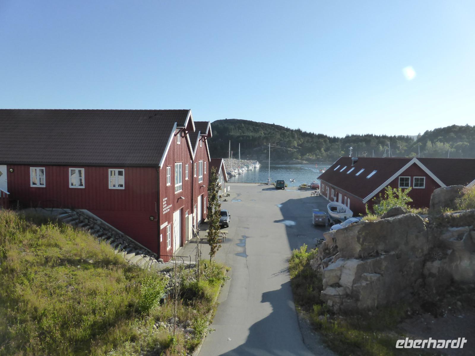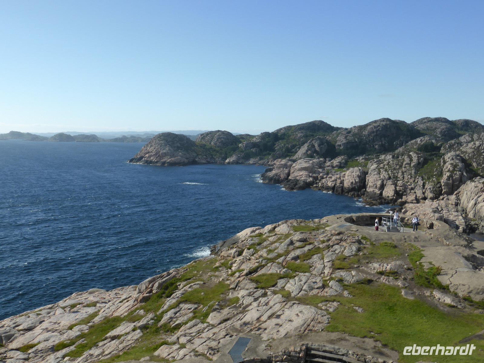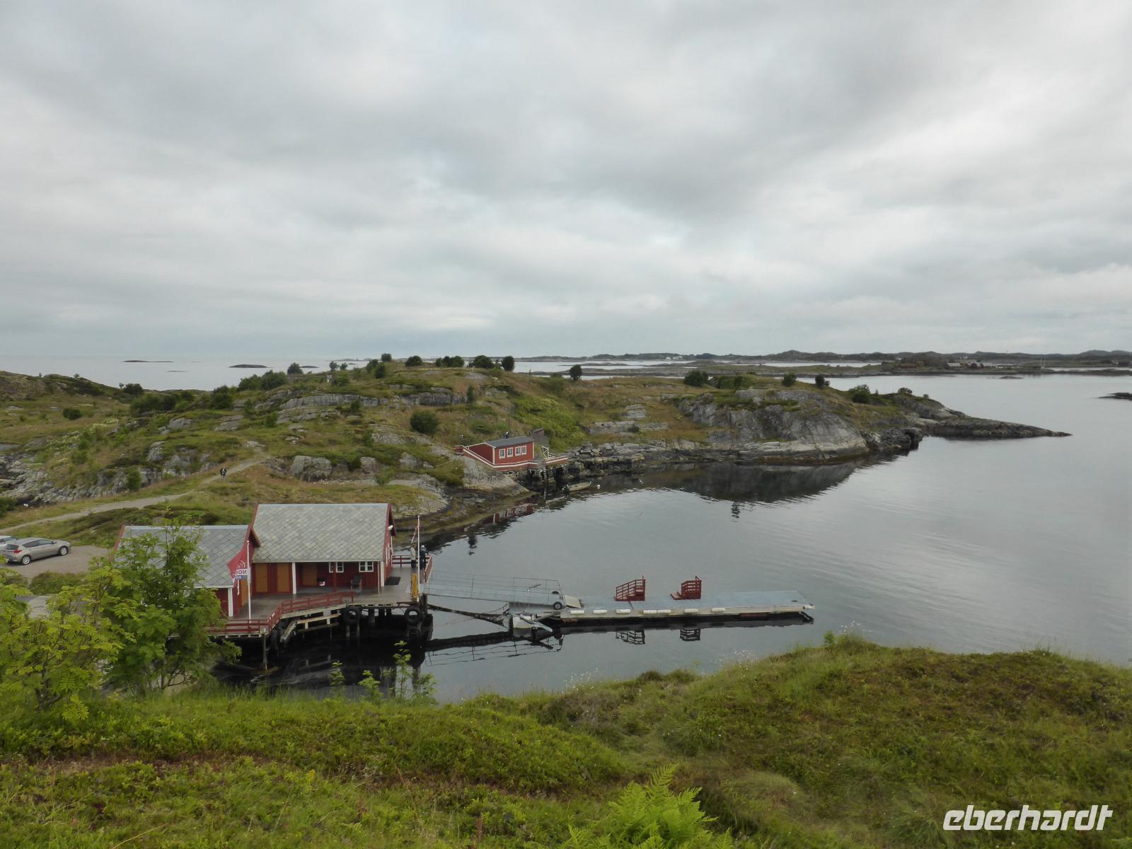 Nach dem Frühstück ging es weiter zum Fährhafen nach Hirtshals. Erst ganz zum Schluss durften wir mit unserem Bus auf das Fahrzeugdeck fahren. Wir befürchteten schon nicht mehr mitzukommen. Während der Fährüberfahrt hatten wir schönes Wetter und eine ruhige See, trotzdem schaukelte das Schiff ein wenig, was nicht alle Gäste gut überstanden. Als nach circa 2 Stunden die norwegische Küste in Sicht kam, zogen dunkle Wolken auf und es begann zu regnen. Es regnete auch noch als wir fünf weitere Gäste unserer Reisegruppe in Kristiansand vom Hotel abholten. Sie waren tags zuvor mit dem Flugzeug angekommen. Gemeinsam fuhren wir zu unserem ersten Besichtigungsort Mandal. Da sich das Wetter noch nicht gebessert hatte, sahen wir uns so lange wie möglich diesen hübschen kleinen Ort vom Bus aus an. Anschließend hatten wir noch etwas Freizeit für einen kleinen Spaziergang. Nach einem Fotostopp am Strand von Mandal fuhren wir zum Leuchtturm von Lindesnes. Er steht auf dem Kap Lindesnes, dem südlichsten Festlandspunkt Norwegens, und wurde im Jahre 1915 fertiggestellt. Wir genossen die spektakuläre Lage und den Blick auf die Felslandschaft bei strahlendem Sonnenschein. Vom „Südkap" war es dann nicht weit bis zu unserem Havhotell Lindesnes - Båly. Hier bestand die Herausforderung darin unsere Hotelzimmer zu finden, da sich diese auf mehrere Gebäude verteilten. Die Hotelanlage lag fantastisch in einer Bucht, eingebettet zwischen zwei kleinen Yachthäfen.