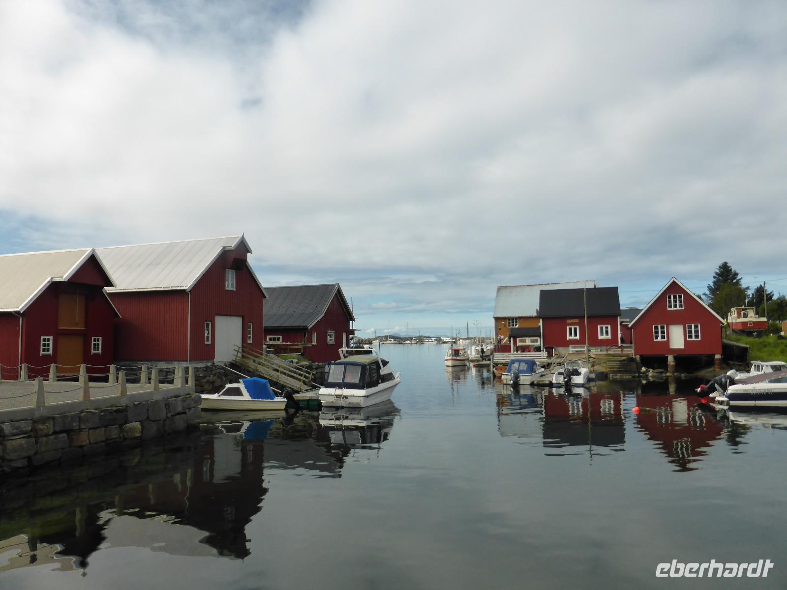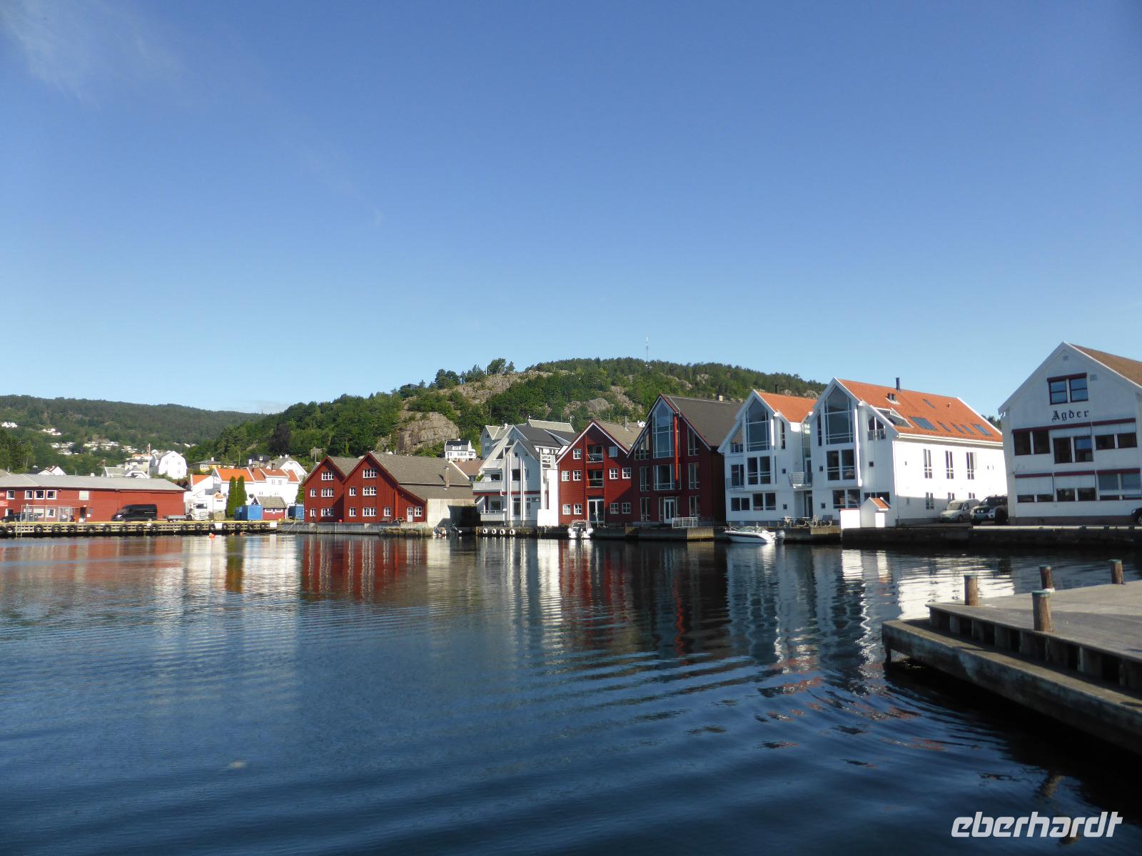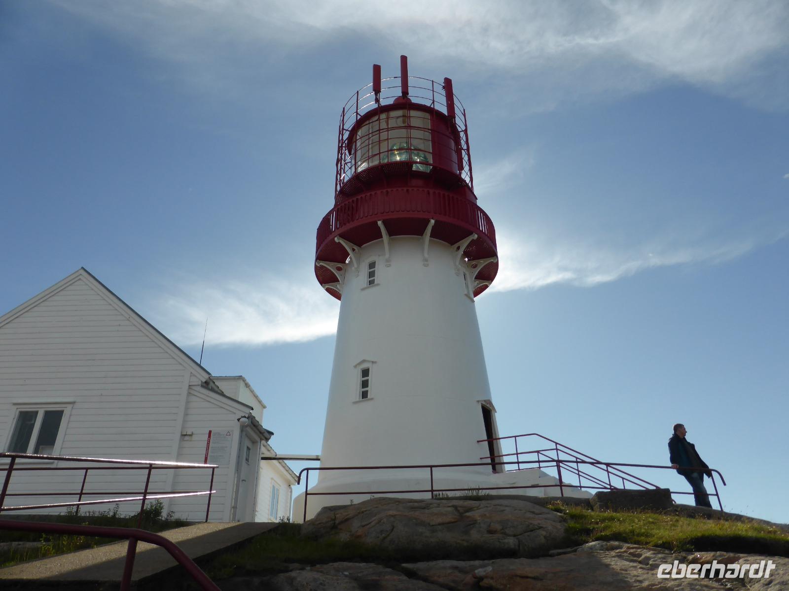 Nach dem Frühstück ging es weiter zum Fährhafen nach Hirtshals. Erst ganz zum Schluss durften wir mit unserem Bus auf das Fahrzeugdeck fahren. Wir befürchteten schon nicht mehr mitzukommen. Während der Fährüberfahrt hatten wir schönes Wetter und eine ruhige See, trotzdem schaukelte das Schiff ein wenig, was nicht alle Gäste gut überstanden. Als nach circa 2 Stunden die norwegische Küste in Sicht kam, zogen dunkle Wolken auf und es begann zu regnen. Es regnete auch noch als wir fünf weitere Gäste unserer Reisegruppe in Kristiansand vom Hotel abholten. Sie waren tags zuvor mit dem Flugzeug angekommen. Gemeinsam fuhren wir zu unserem ersten Besichtigungsort Mandal. Da sich das Wetter noch nicht gebessert hatte, sahen wir uns so lange wie möglich diesen hübschen kleinen Ort vom Bus aus an. Anschließend hatten wir noch etwas Freizeit für einen kleinen Spaziergang. Nach einem Fotostopp am Strand von Mandal fuhren wir zum Leuchtturm von Lindesnes. Er steht auf dem Kap Lindesnes, dem südlichsten Festlandspunkt Norwegens, und wurde im Jahre 1915 fertiggestellt. Wir genossen die spektakuläre Lage und den Blick auf die Felslandschaft bei strahlendem Sonnenschein. Vom „Südkap" war es dann nicht weit bis zu unserem Havhotell Lindesnes - Båly. Hier bestand die Herausforderung darin unsere Hotelzimmer zu finden, da sich diese auf mehrere Gebäude verteilten. Die Hotelanlage lag fantastisch in einer Bucht, eingebettet zwischen zwei kleinen Yachthäfen.