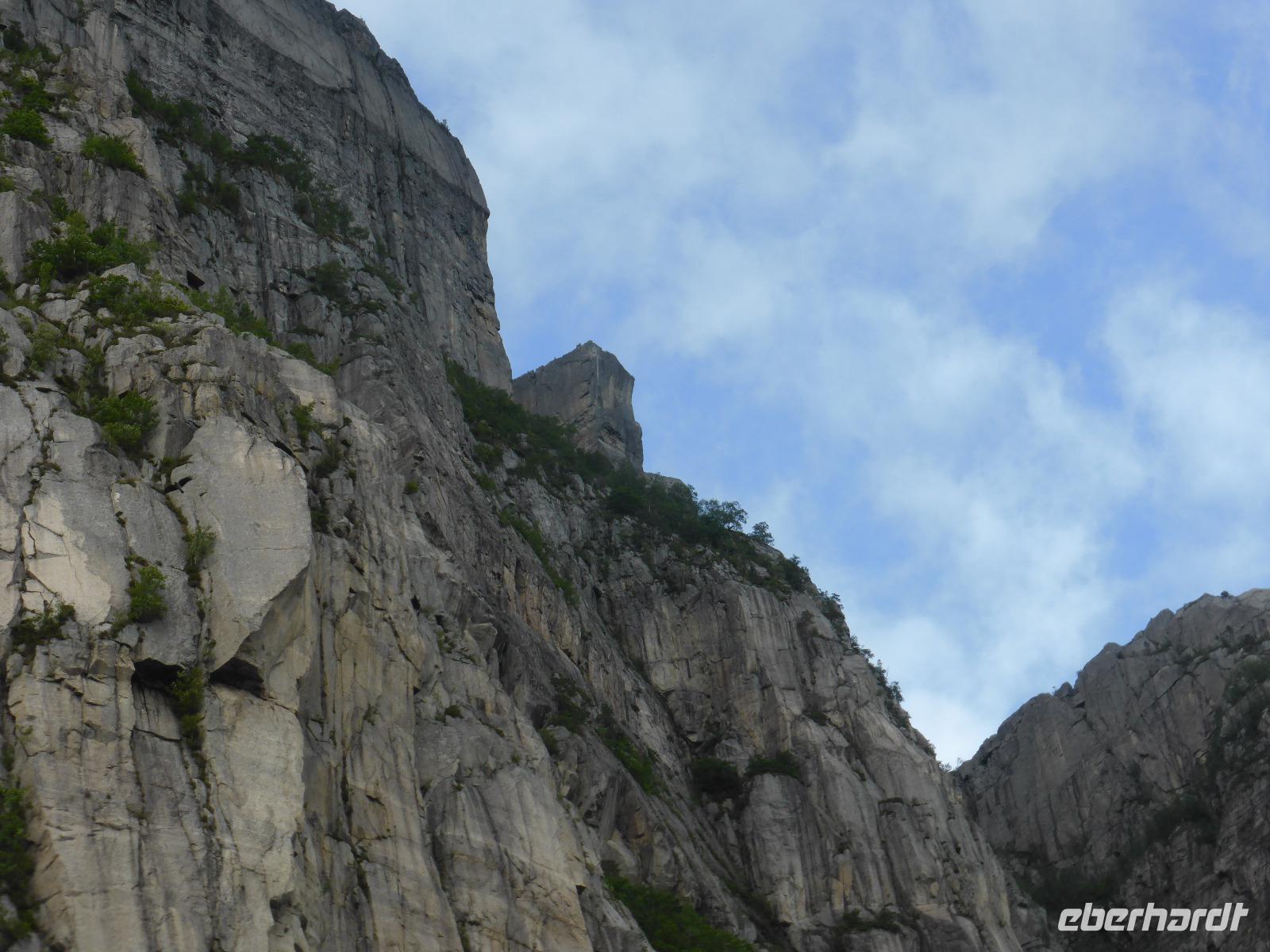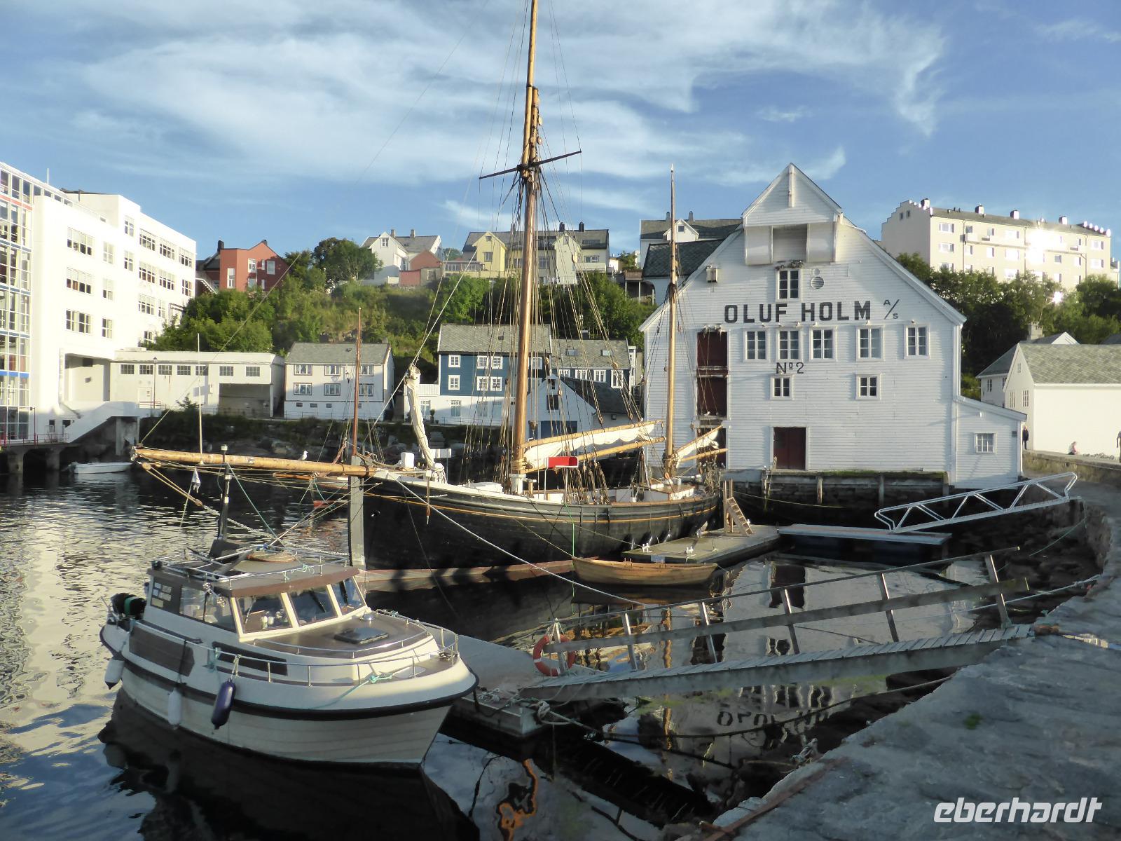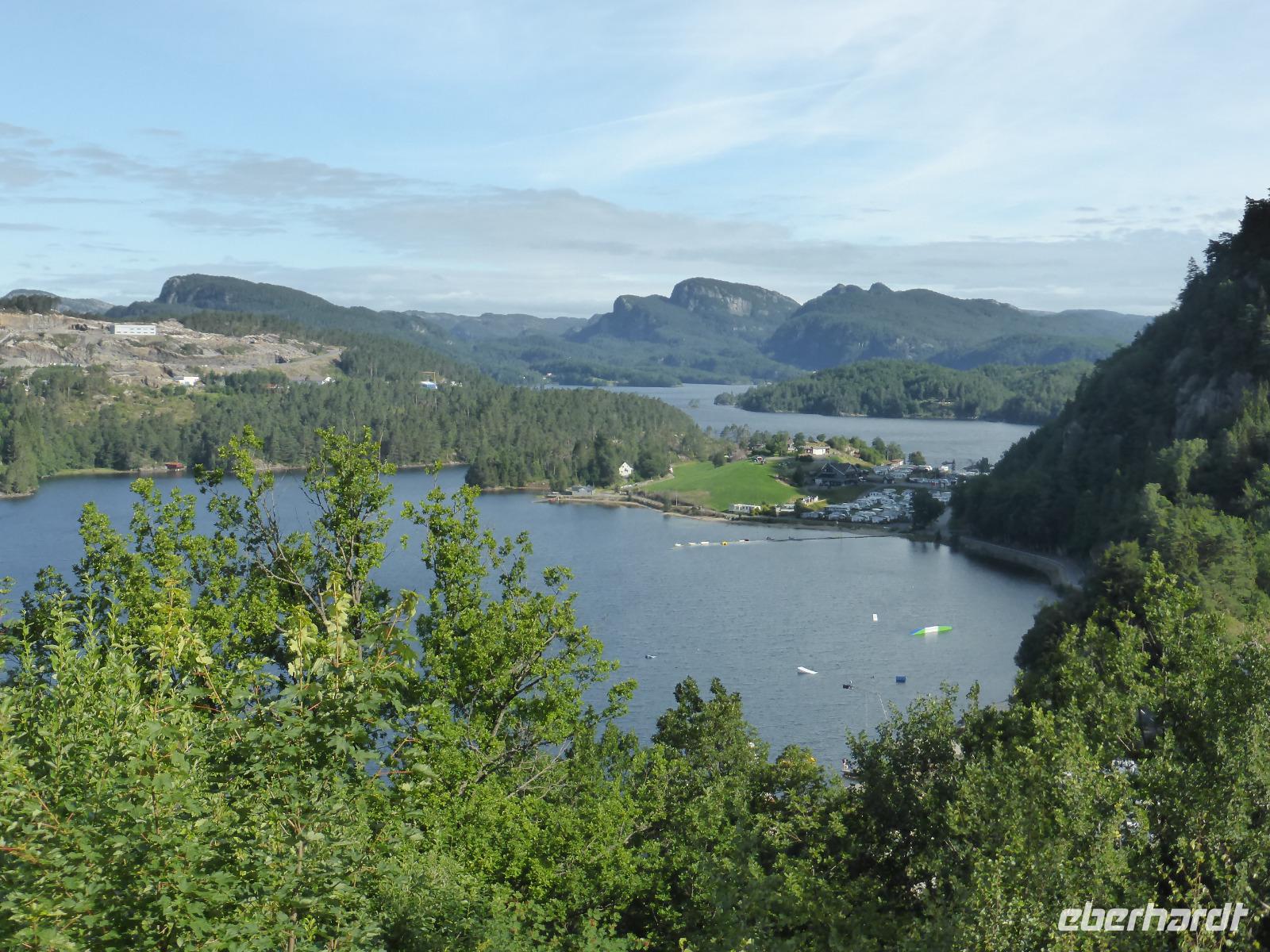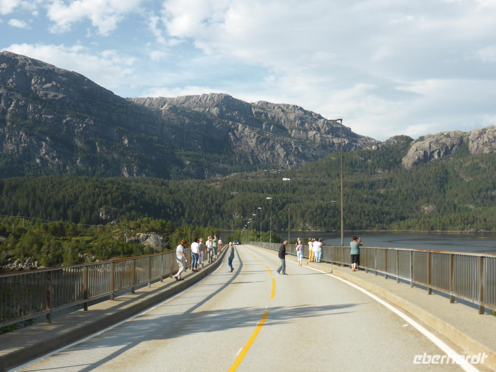 Bei unserer Abfahrt stellten wir fest, dass die vordere Tür nicht ordnungsgemäß schloss. Um die Geräusche des Fahrtwindes einzudämmen, banden wir die Tür mit einem Spanngurt fest. Nach einem Fotostopp am Magma-Geopark erreichten wir Flekkefjord. Zu beiden Seiten des Flusses Danneviga schmücken weiße Holzhäuser das Stadtbild des hübschen und sauberen kleinen Ortes. Wir spazierten von der Holzkirche bis zum kleinen Yachthafen an der Zollbrücke des Lafjords. Von Flekkefjord ging es dann weiter nach Stavanger und zum Anleger der Rødne-Fjordcruise. Die Fahrt mit dem Ausflugschiff M/S Rygertroll zum Lysefjord war ein Erlebnis. Wir hatten Glück mit dem Wetter und konnten sogar den Prekestolen sehen. Zurück in Stavanger bummelten wir durch Alt-Stavanger mit seinem Holzhäusern, kleinen Vorgärten und Gaslaternen. Hier wohnten im 18./19. Jh. die Fischer, Seeleute und Handwerker. Von Alt-Stavanger ging es dann zum Dom und den Geschäftsstraßen. Micha, unser Fahrer, holte uns nach der Freizeit mit dem Bus ab und wir fuhren zum Hotel. Er hatte am Nachmittag die Vordertür in einer Werkstatt reparieren lassen.