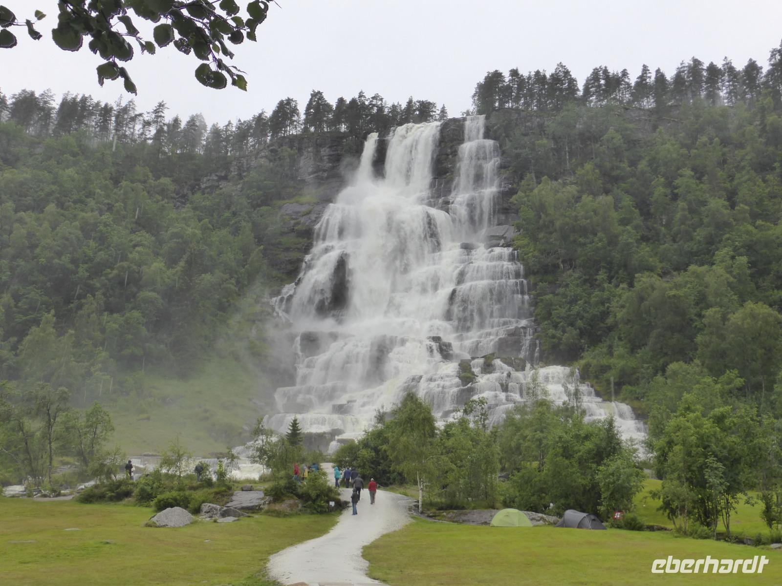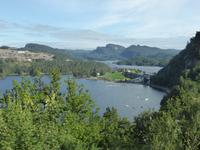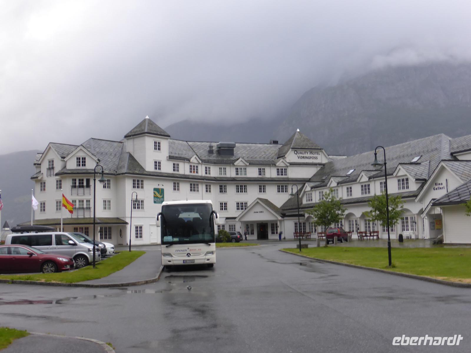 Am Morgen standen zunächst zwei Fährüberfahrten, von Stavanger nach Tau und von Hjelmeland nach Nesvik, auf dem Programm und nach mehreren Fotostopps wählten wir einen Parkplatz mit Blick auf den Saudafjord für unsere Mittagspause. Anschließend fuhren wir über das Saudafjell und bewältigten die Passhöhe auf etwa 980 Metern. Die Sicht war ausgesprochen schlecht. Es regnete und war neblig. Ein weiterer Höhepunkt war unser Halt am Wasserfall „Låtefoss". Wir wussten nicht, wovon wir nass wurden, vom Sprühnebel des Wasserfalls oder vom Regen. Danach führt uns unsere Reise entlang der Ostseite des Sørfjorden, einer ertragreichen Obstregion, in der vor allem Kirschen, Äpfel und Erdbeeren angebaut werden. Unseren Übernachtungsort Eidfjord in Sicht, legten wir kurz vor dem Ziel noch einen Fotostopp ein, um einen fantastischen Regenbogen fotografieren zu können.