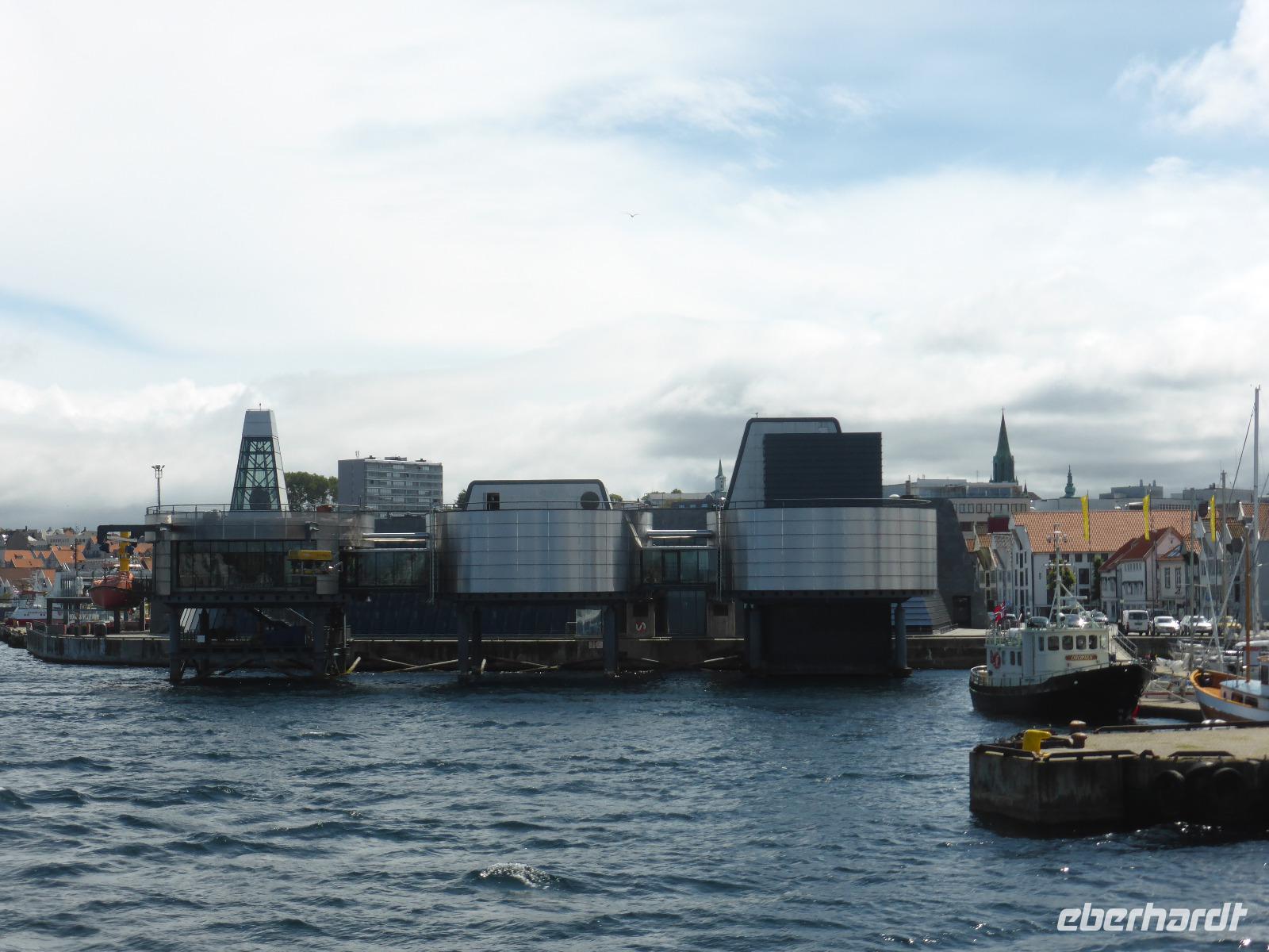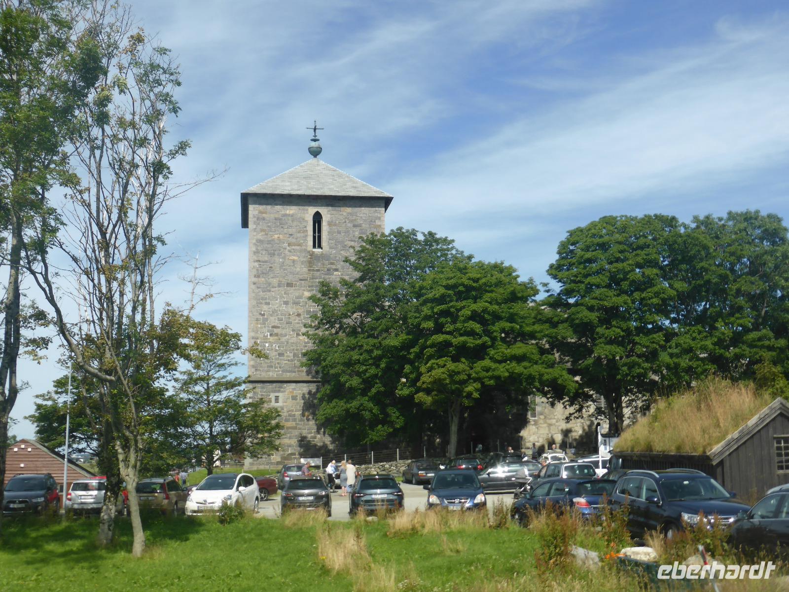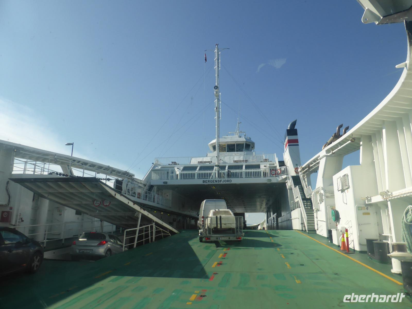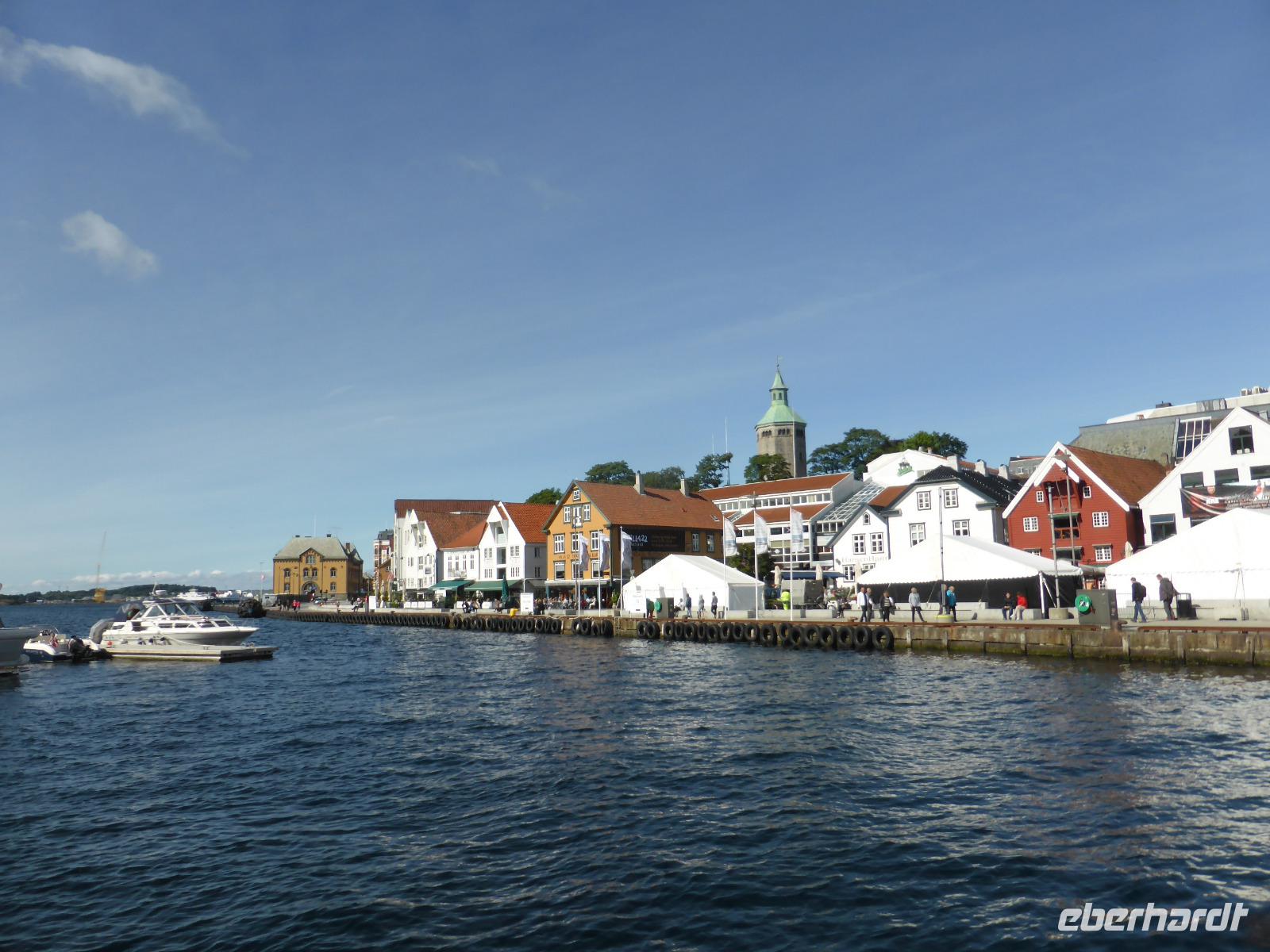 Nach dem Frühstück verließen wir Bergen und fuhren zur Fähre nach Halhjelm, um nach Sandviksåg überzusetzen. Von dort ging es zu einem Fotostopp an der Sorda-Brücke und weiter nach Haraldshaugen. Angeblich befindet sich an dieser Stelle das Grab von Harald Schönhaar, welcher im Jahre 872 ganz Norwegen vereinte. Von Haraldshaugen fuhren wir weiter nach Avaldnes, wo es zu seiner Zeit im 9.Jh. einen Königssitz gegeben haben soll. Hier befindet sich auch die älteste Steinkirche Norwegens, die Olavskirche, in der gerade zwei Hochzeiten stattfanden. Von Avaldnes ging es dann nach Arsvågen und von dort mit der Fähre nach Mortavika. Anschließend fuhren wir durch den Byfjord, dem, mit 223 Metern unter dem Meeresspiegel, tiefsten Unterwassertunnel der Welt. Er befindet sich 45 Meter unterhalb des Meeresgrundes. Gegen 17.00 Uhr kamen wir in Stavanger an und wurden im Scandic-Hotel zum letzten gemeinsamen Abendessen erwartet. Danach verabschiedeten wir unsere Fluggäste. Sie blieben im Hotel und flogen am nächsten Tag von Stavanger nach Deutschland zurück. Alle anderen Gäste fuhren mit dem Bus zum Fährterminal in Tananger. Nach der Abholung und Ausgabe der Kabinenschlüssel hatten wir noch etwas Zeit, bevor wir das Schiff betreten durften. Eine Stunde später als geplant legte es dann in Richtung Dänemark ab.