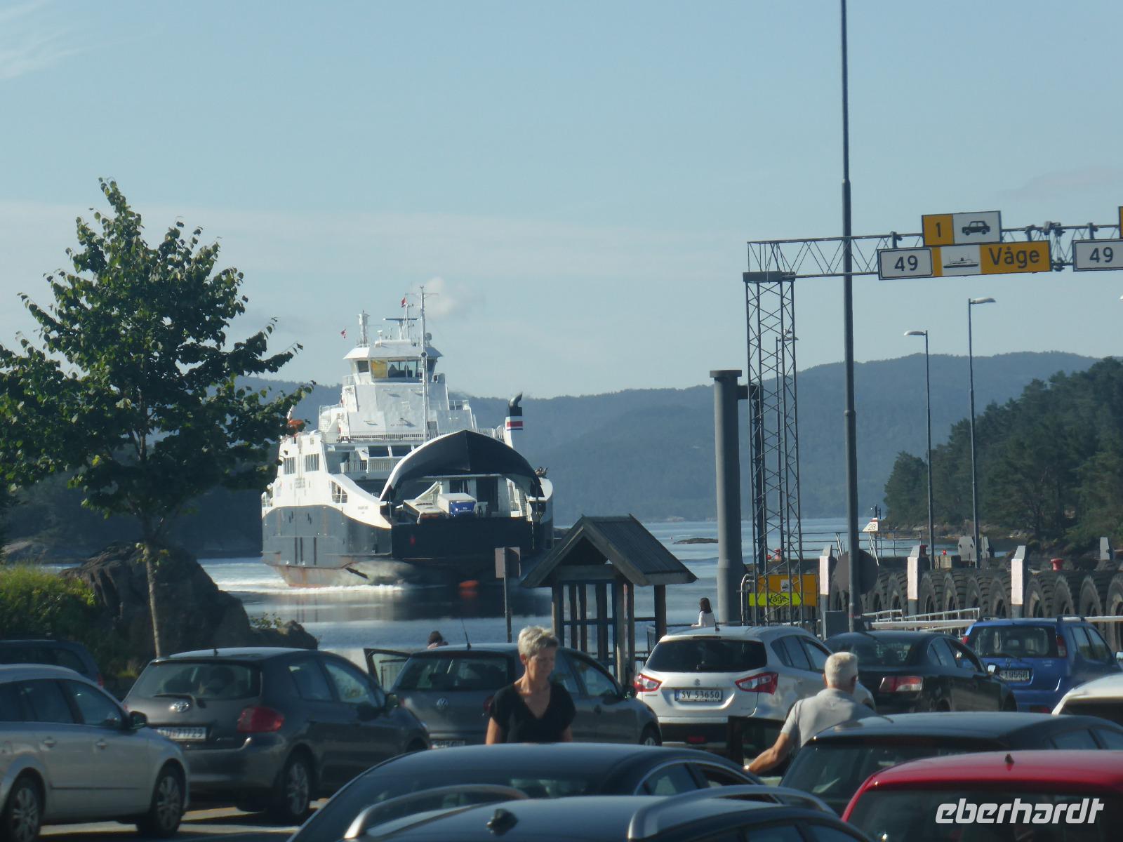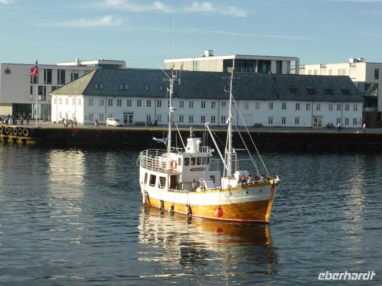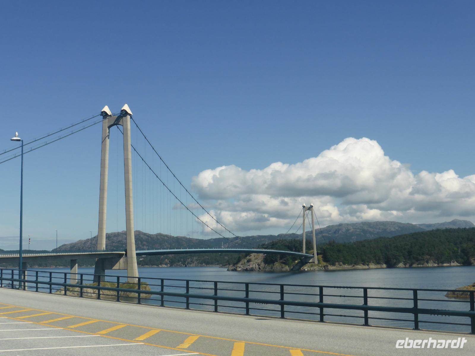 Nach dem Frühstück verließen wir Bergen und fuhren zur Fähre nach Halhjelm, um nach Sandviksåg überzusetzen. Von dort ging es zu einem Fotostopp an der Sorda-Brücke und weiter nach Haraldshaugen. Angeblich befindet sich an dieser Stelle das Grab von Harald Schönhaar, welcher im Jahre 872 ganz Norwegen vereinte. Von Haraldshaugen fuhren wir weiter nach Avaldnes, wo es zu seiner Zeit im 9.Jh. einen Königssitz gegeben haben soll. Hier befindet sich auch die älteste Steinkirche Norwegens, die Olavskirche, in der gerade zwei Hochzeiten stattfanden. Von Avaldnes ging es dann nach Arsvågen und von dort mit der Fähre nach Mortavika. Anschließend fuhren wir durch den Byfjord, dem, mit 223 Metern unter dem Meeresspiegel, tiefsten Unterwassertunnel der Welt. Er befindet sich 45 Meter unterhalb des Meeresgrundes. Gegen 17.00 Uhr kamen wir in Stavanger an und wurden im Scandic-Hotel zum letzten gemeinsamen Abendessen erwartet. Danach verabschiedeten wir unsere Fluggäste. Sie blieben im Hotel und flogen am nächsten Tag von Stavanger nach Deutschland zurück. Alle anderen Gäste fuhren mit dem Bus zum Fährterminal in Tananger. Nach der Abholung und Ausgabe der Kabinenschlüssel hatten wir noch etwas Zeit, bevor wir das Schiff betreten durften. Eine Stunde später als geplant legte es dann in Richtung Dänemark ab.