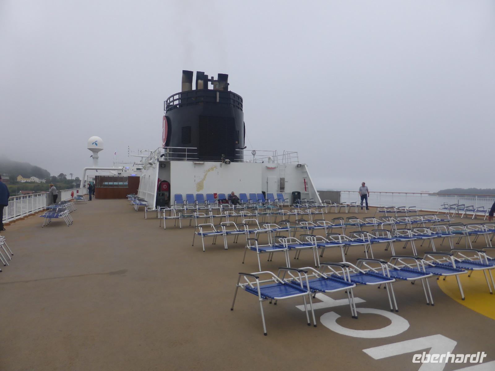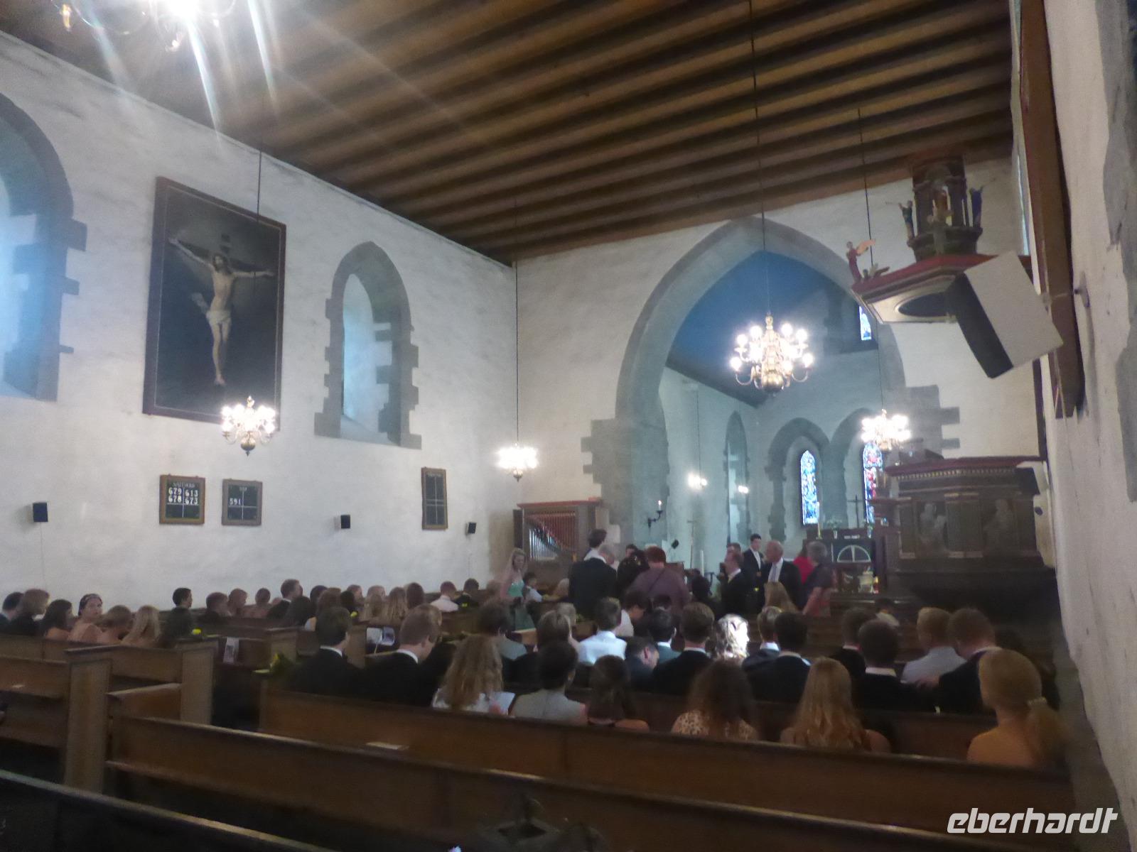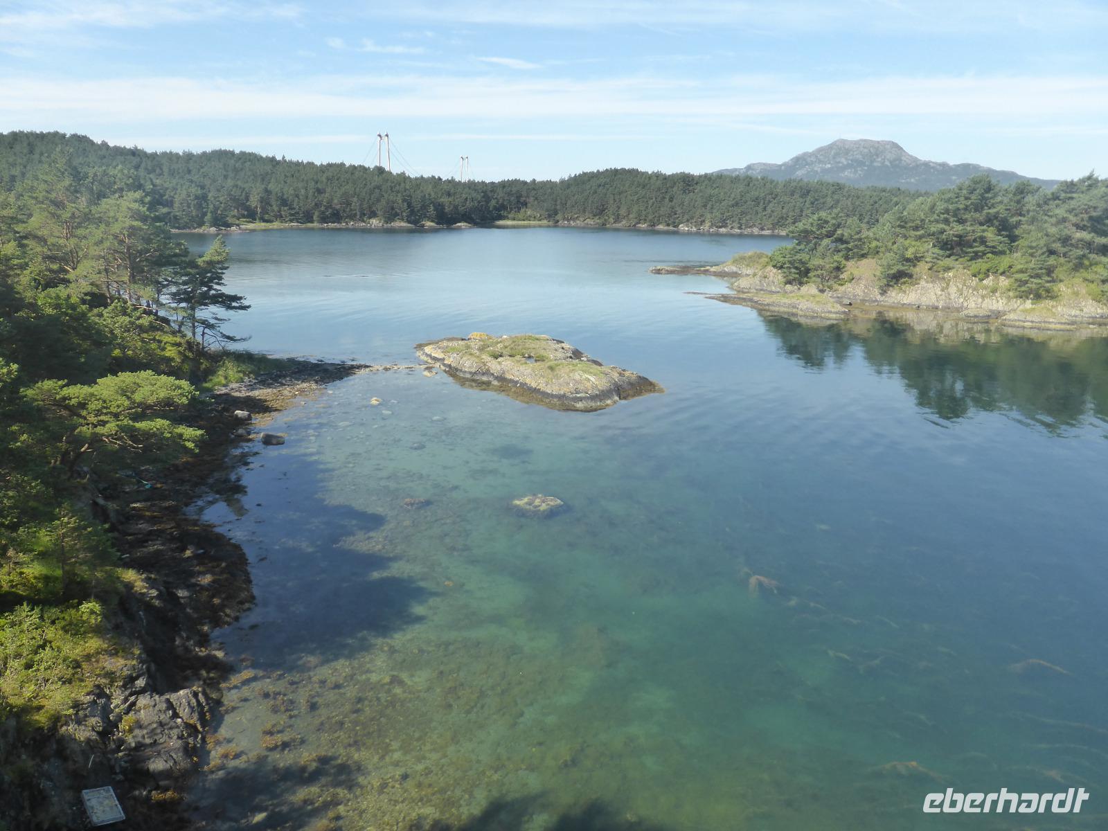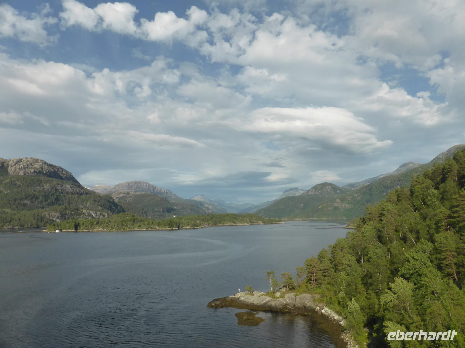 Nach dem Frühstück verließen wir Bergen und fuhren zur Fähre nach Halhjelm, um nach Sandviksåg überzusetzen. Von dort ging es zu einem Fotostopp an der Sorda-Brücke und weiter nach Haraldshaugen. Angeblich befindet sich an dieser Stelle das Grab von Harald Schönhaar, welcher im Jahre 872 ganz Norwegen vereinte. Von Haraldshaugen fuhren wir weiter nach Avaldnes, wo es zu seiner Zeit im 9.Jh. einen Königssitz gegeben haben soll. Hier befindet sich auch die älteste Steinkirche Norwegens, die Olavskirche, in der gerade zwei Hochzeiten stattfanden. Von Avaldnes ging es dann nach Arsvågen und von dort mit der Fähre nach Mortavika. Anschließend fuhren wir durch den Byfjord, dem, mit 223 Metern unter dem Meeresspiegel, tiefsten Unterwassertunnel der Welt. Er befindet sich 45 Meter unterhalb des Meeresgrundes. Gegen 17.00 Uhr kamen wir in Stavanger an und wurden im Scandic-Hotel zum letzten gemeinsamen Abendessen erwartet. Danach verabschiedeten wir unsere Fluggäste. Sie blieben im Hotel und flogen am nächsten Tag von Stavanger nach Deutschland zurück. Alle anderen Gäste fuhren mit dem Bus zum Fährterminal in Tananger. Nach der Abholung und Ausgabe der Kabinenschlüssel hatten wir noch etwas Zeit, bevor wir das Schiff betreten durften. Eine Stunde später als geplant legte es dann in Richtung Dänemark ab.
