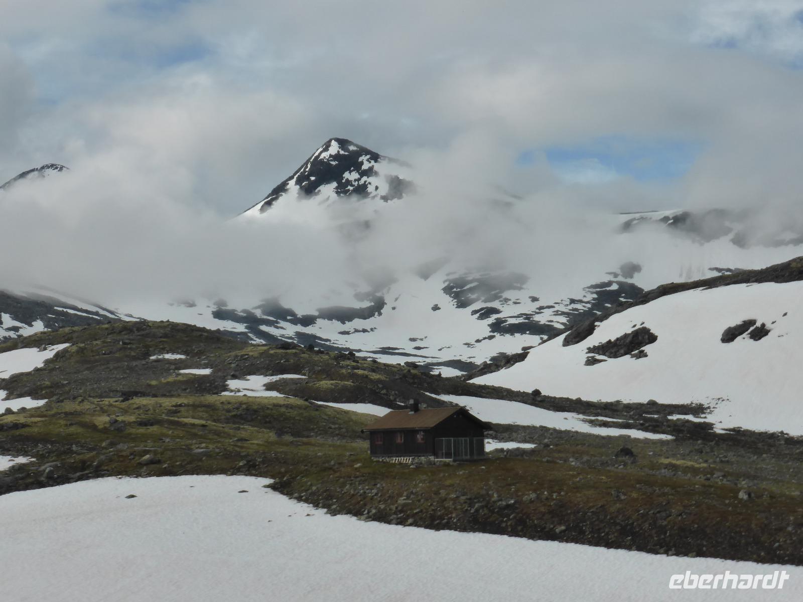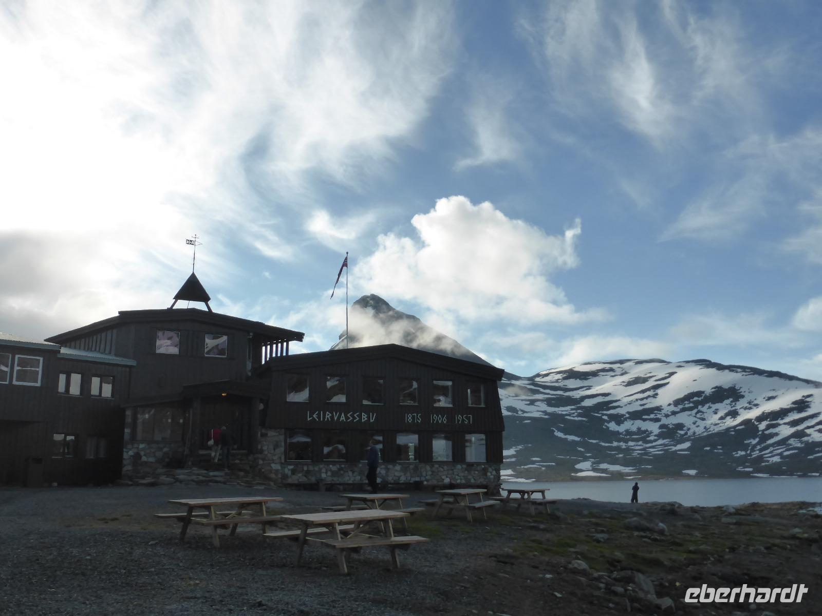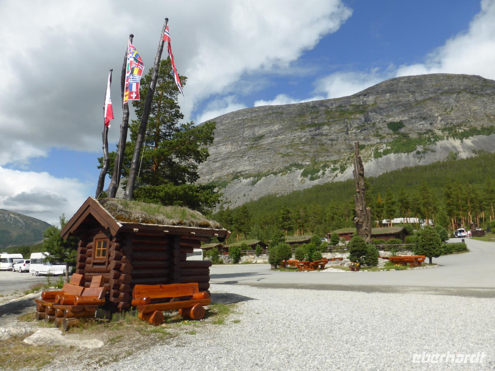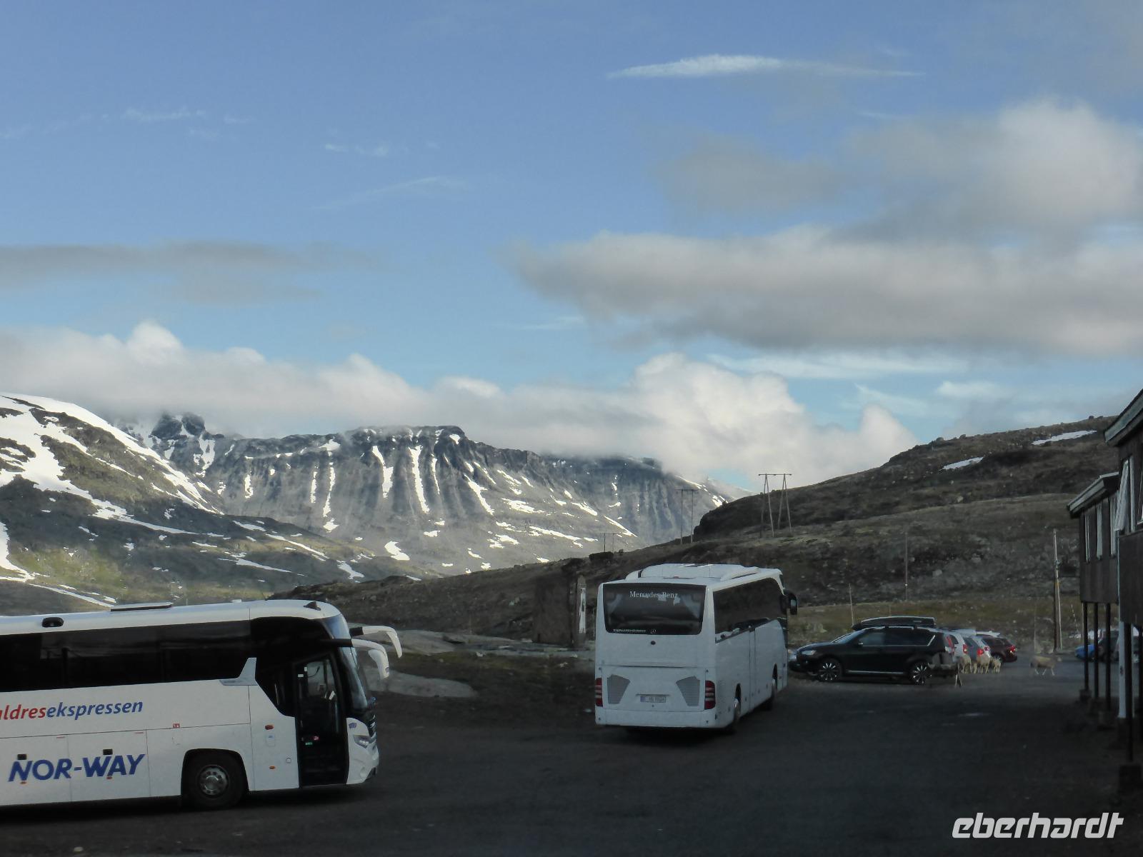 Nach unser Abfahrt vom Eidfjord ging es durch den Vavalik-Tunnel, in welchem sich gleich zwei, durch blaue Lichtinstallationen beleuchtete, Kreisverkehre befinden. Unser erster Fotostopp war am Tvindefossen-Wasserfall, in dessen Nähe sich auch ein großer Campingplatz befindet. Unvorstellbar, wie man bei dieser Lautstärke überhaupt nachts schlafen kann. Vom Tvindefossen ging es nach Gudvangen, von wo aus unser Fährschiff nach Flåm abfuhr. Die Fahrt führte durch den schmalen Naerøyfjord, welcher zusammen mit dem Geirangerfjord von der UNESCO auf die Liste des Welterbes gesetzt wurde. Zu beiden Seiten ragten spektakuläre, über 1200 Meter steil aufragende Felswände empor! Micha erwartete uns bei unserer Ankunft in Flåm bereits an der Anlegestelle und mit dem Bus ging es dann hinauf zur Aussichtsplattform „Stegastein", die sich in 640 Meter Höhe befindet. Obwohl wir weit in den Aurlandsfjorden hinein schauen konnten, war die Sicht doch etwas getrübt. Vom Aussichtspunkt ging es dann hinauf bis auf 1300 Meter Höhe zum Auerlandfjell. Hier lagen sogar noch richtige Eisfelder mit bläulichem Gletschereis und kleinen Schmelzseen. Mitten im Hochsommer erinnerten uns Wind und Außentemperatur eher an das Winterhalbjahr. Bei unserer Talfahrt trafen wir ausgerechnet an den Stellen, an denen es auch schon für zwei sich begegnende Pkw's kritisch geworden wäre, auf entgegenkommende Wohnmobile. In einem Fall mussten wir sogar gewaltige Steine am Fahrbahnrand beiseite wuchten, damit wir aneinander vorbei kamen. Nach einem Halt an der Sognefjell-Hütte passierten wir anschließend mit 1434 m die höchste Stelle des Sognefjells und verließen kurze Zeit später die asphaltierte Straße. Der weitere Weg war ein unbefestigter Steinweg, welcher an der „Leirvassbu Mountain Lodge" inmitten der Berge und am Rand des Jotunheimen Nationalparks endete. Die Lodge war urig und rustikal sowie gut besucht von unzähligen Wanderfreunden.