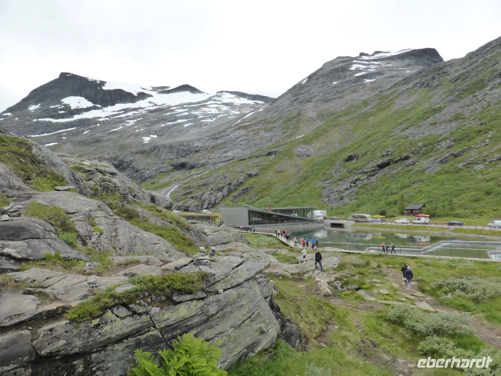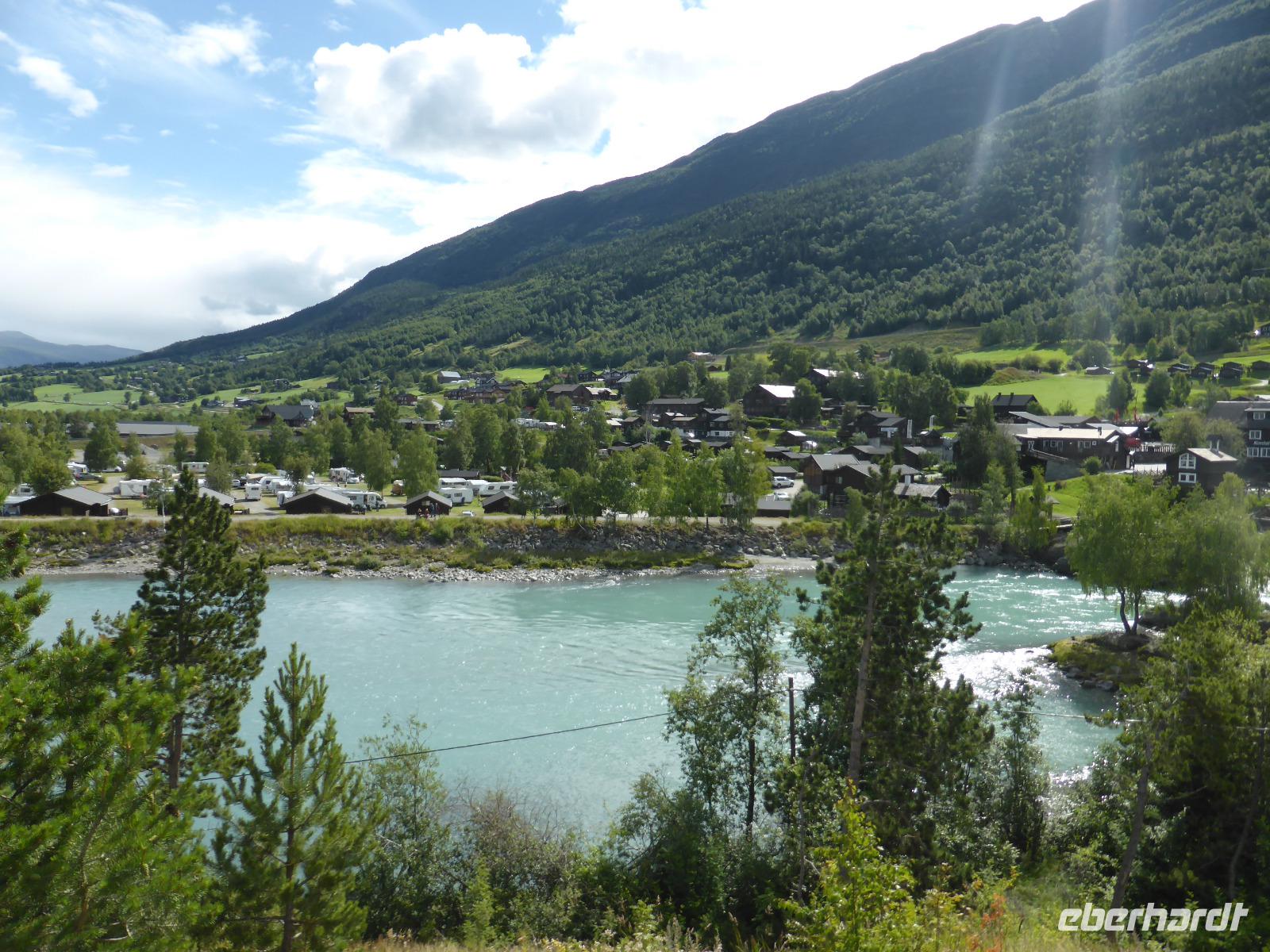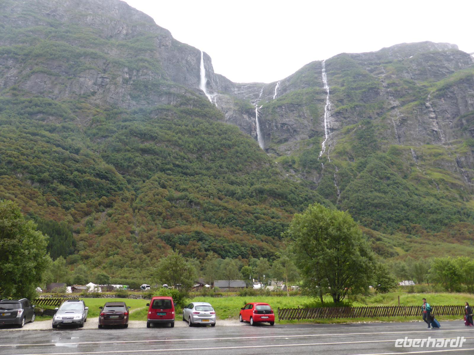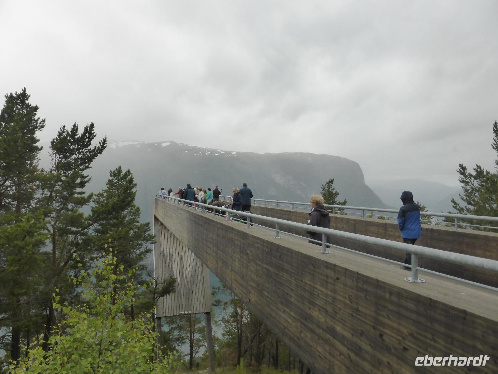 Nach unser Abfahrt vom Eidfjord ging es durch den Vavalik-Tunnel, in welchem sich gleich zwei, durch blaue Lichtinstallationen beleuchtete, Kreisverkehre befinden. Unser erster Fotostopp war am Tvindefossen-Wasserfall, in dessen Nähe sich auch ein großer Campingplatz befindet. Unvorstellbar, wie man bei dieser Lautstärke überhaupt nachts schlafen kann. Vom Tvindefossen ging es nach Gudvangen, von wo aus unser Fährschiff nach Flåm abfuhr. Die Fahrt führte durch den schmalen Naerøyfjord, welcher zusammen mit dem Geirangerfjord von der UNESCO auf die Liste des Welterbes gesetzt wurde. Zu beiden Seiten ragten spektakuläre, über 1200 Meter steil aufragende Felswände empor! Micha erwartete uns bei unserer Ankunft in Flåm bereits an der Anlegestelle und mit dem Bus ging es dann hinauf zur Aussichtsplattform „Stegastein", die sich in 640 Meter Höhe befindet. Obwohl wir weit in den Aurlandsfjorden hinein schauen konnten, war die Sicht doch etwas getrübt. Vom Aussichtspunkt ging es dann hinauf bis auf 1300 Meter Höhe zum Auerlandfjell. Hier lagen sogar noch richtige Eisfelder mit bläulichem Gletschereis und kleinen Schmelzseen. Mitten im Hochsommer erinnerten uns Wind und Außentemperatur eher an das Winterhalbjahr. Bei unserer Talfahrt trafen wir ausgerechnet an den Stellen, an denen es auch schon für zwei sich begegnende Pkw's kritisch geworden wäre, auf entgegenkommende Wohnmobile. In einem Fall mussten wir sogar gewaltige Steine am Fahrbahnrand beiseite wuchten, damit wir aneinander vorbei kamen. Nach einem Halt an der Sognefjell-Hütte passierten wir anschließend mit 1434 m die höchste Stelle des Sognefjells und verließen kurze Zeit später die asphaltierte Straße. Der weitere Weg war ein unbefestigter Steinweg, welcher an der „Leirvassbu Mountain Lodge" inmitten der Berge und am Rand des Jotunheimen Nationalparks endete. Die Lodge war urig und rustikal sowie gut besucht von unzähligen Wanderfreunden.