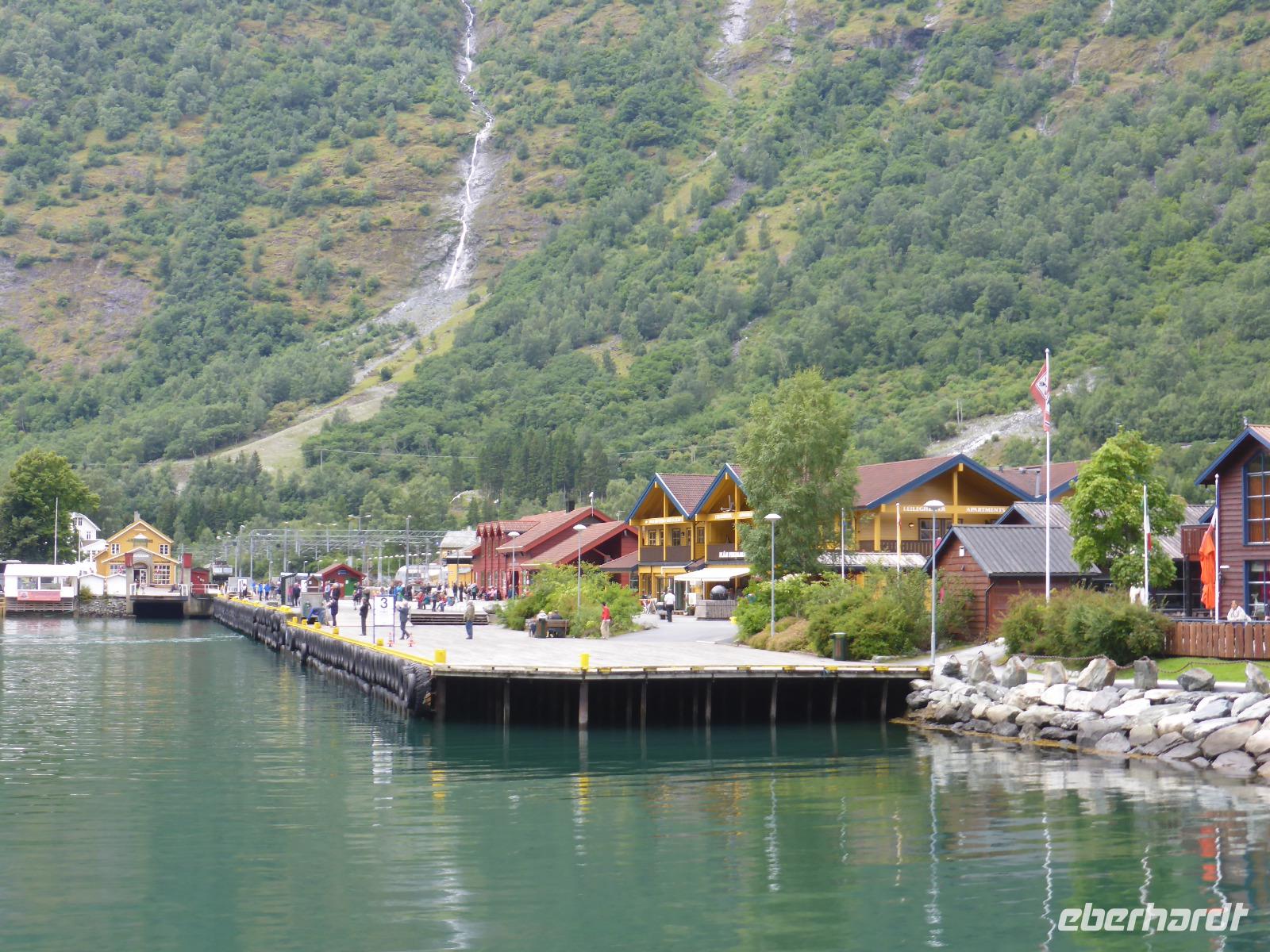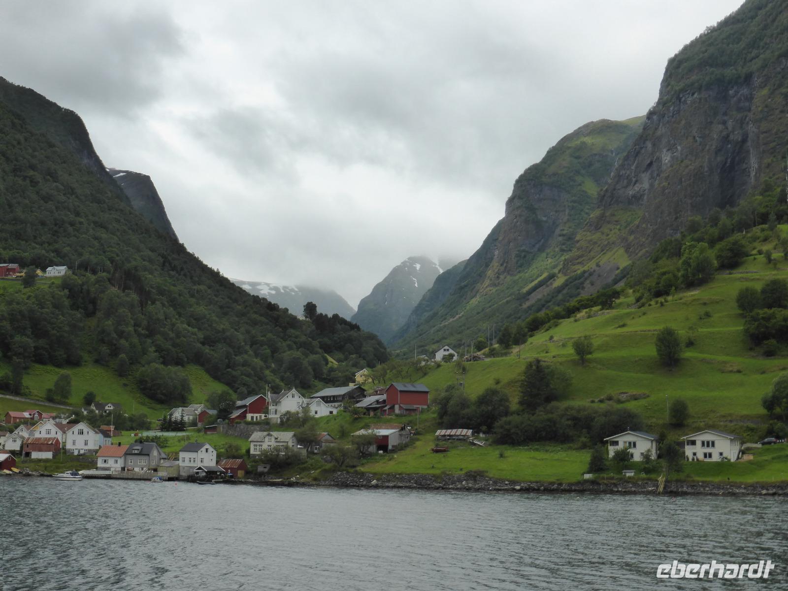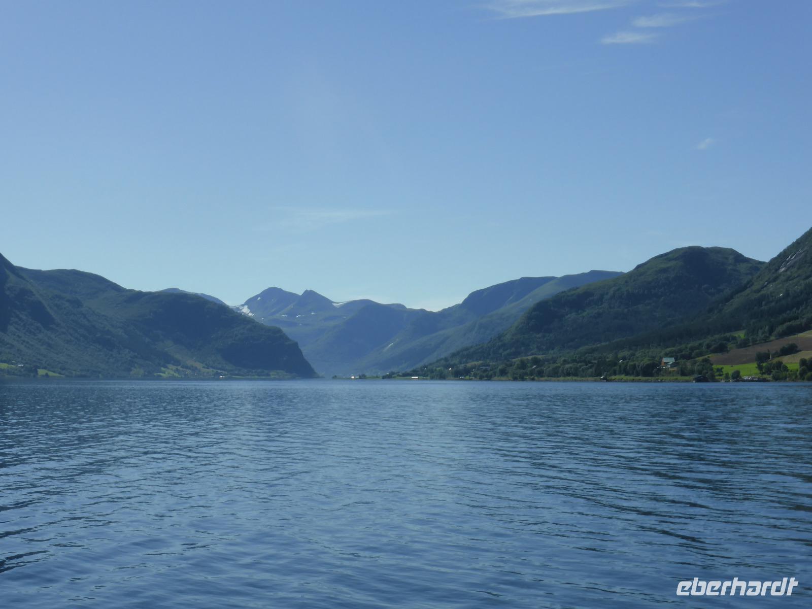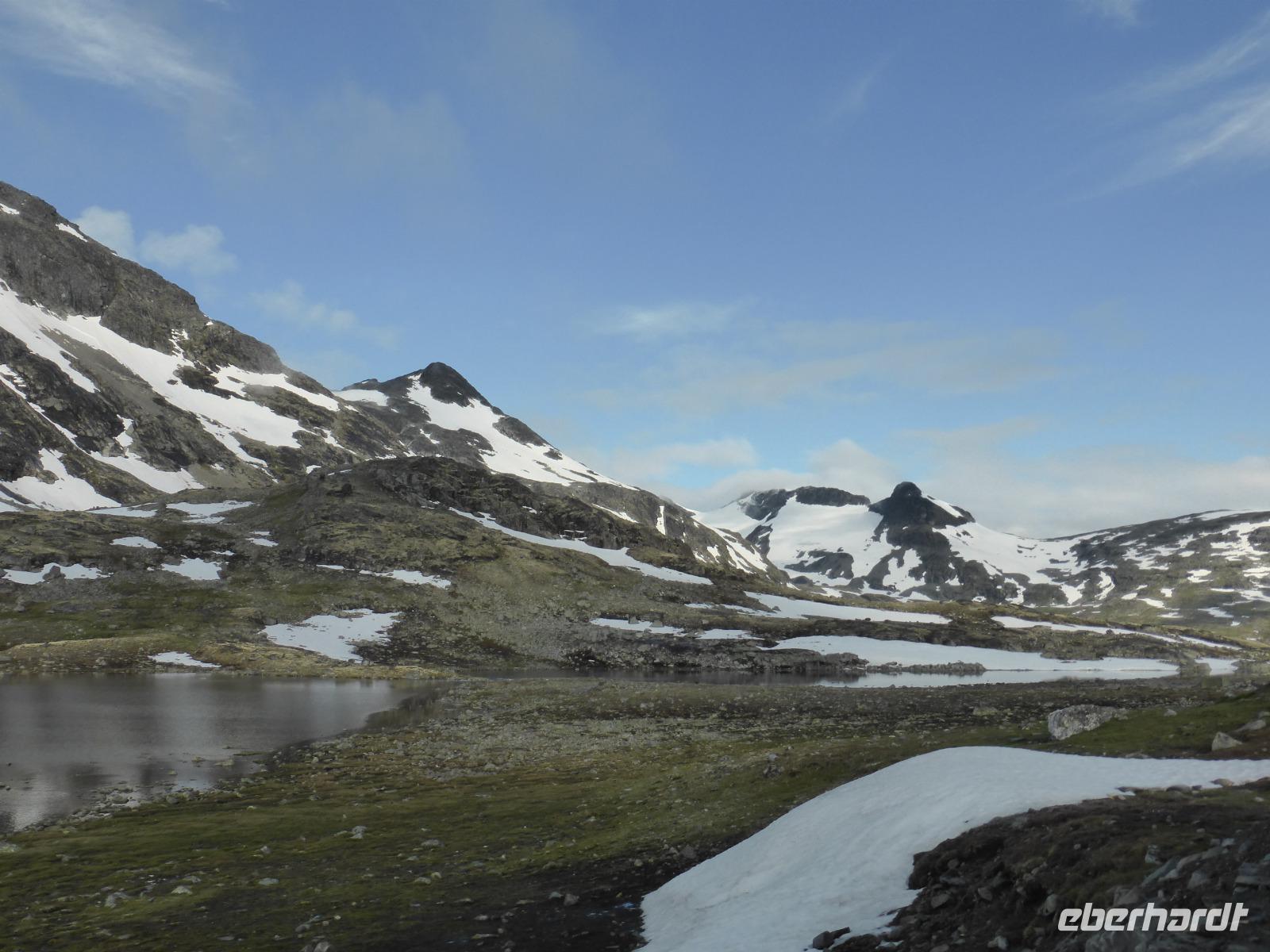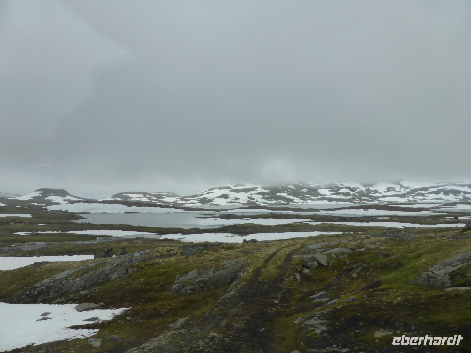 Nach unser Abfahrt vom Eidfjord ging es durch den Vavalik-Tunnel, in welchem sich gleich zwei, durch blaue Lichtinstallationen beleuchtete, Kreisverkehre befinden. Unser erster Fotostopp war am Tvindefossen-Wasserfall, in dessen Nähe sich auch ein großer Campingplatz befindet. Unvorstellbar, wie man bei dieser Lautstärke überhaupt nachts schlafen kann. Vom Tvindefossen ging es nach Gudvangen, von wo aus unser Fährschiff nach Flåm abfuhr. Die Fahrt führte durch den schmalen Naerøyfjord, welcher zusammen mit dem Geirangerfjord von der UNESCO auf die Liste des Welterbes gesetzt wurde. Zu beiden Seiten ragten spektakuläre, über 1200 Meter steil aufragende Felswände empor! Micha erwartete uns bei unserer Ankunft in Flåm bereits an der Anlegestelle und mit dem Bus ging es dann hinauf zur Aussichtsplattform „Stegastein", die sich in 640 Meter Höhe befindet. Obwohl wir weit in den Aurlandsfjorden hinein schauen konnten, war die Sicht doch etwas getrübt. Vom Aussichtspunkt ging es dann hinauf bis auf 1300 Meter Höhe zum Auerlandfjell. Hier lagen sogar noch richtige Eisfelder mit bläulichem Gletschereis und kleinen Schmelzseen. Mitten im Hochsommer erinnerten uns Wind und Außentemperatur eher an das Winterhalbjahr. Bei unserer Talfahrt trafen wir ausgerechnet an den Stellen, an denen es auch schon für zwei sich begegnende Pkw's kritisch geworden wäre, auf entgegenkommende Wohnmobile. In einem Fall mussten wir sogar gewaltige Steine am Fahrbahnrand beiseite wuchten, damit wir aneinander vorbei kamen. Nach einem Halt an der Sognefjell-Hütte passierten wir anschließend mit 1434 m die höchste Stelle des Sognefjells und verließen kurze Zeit später die asphaltierte Straße. Der weitere Weg war ein unbefestigter Steinweg, welcher an der „Leirvassbu Mountain Lodge" inmitten der Berge und am Rand des Jotunheimen Nationalparks endete. Die Lodge war urig und rustikal sowie gut besucht von unzähligen Wanderfreunden.