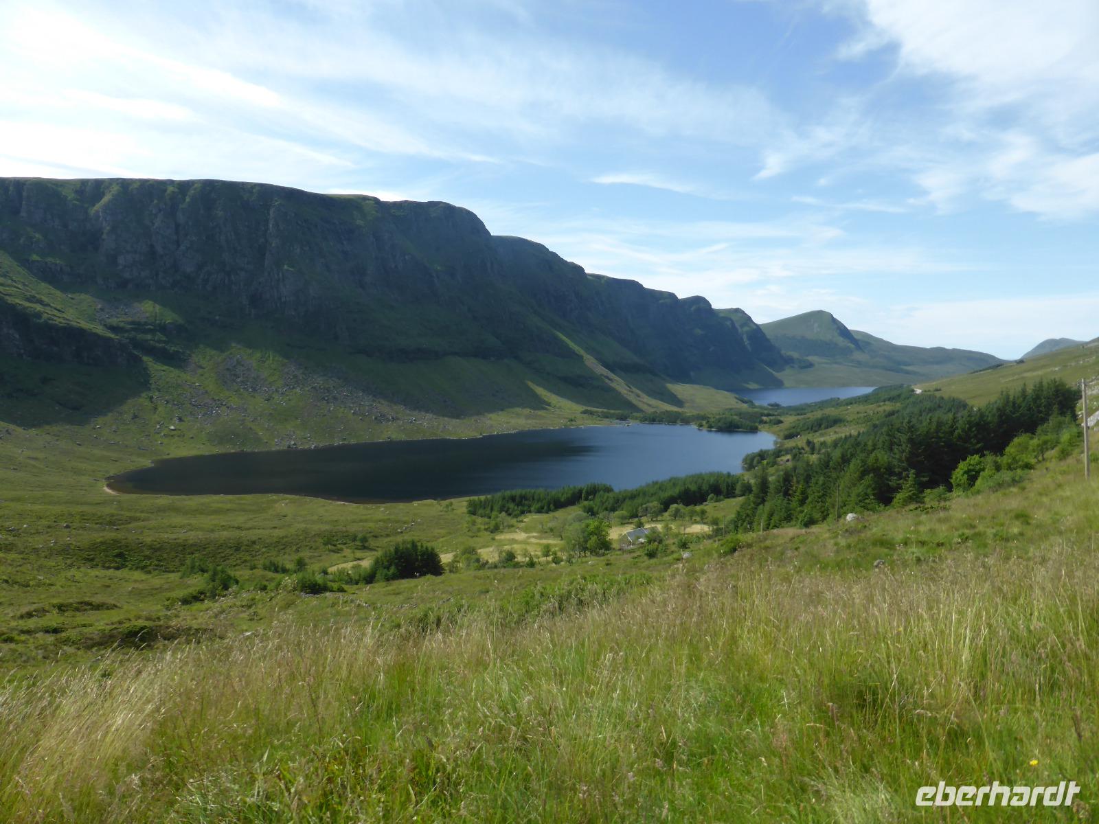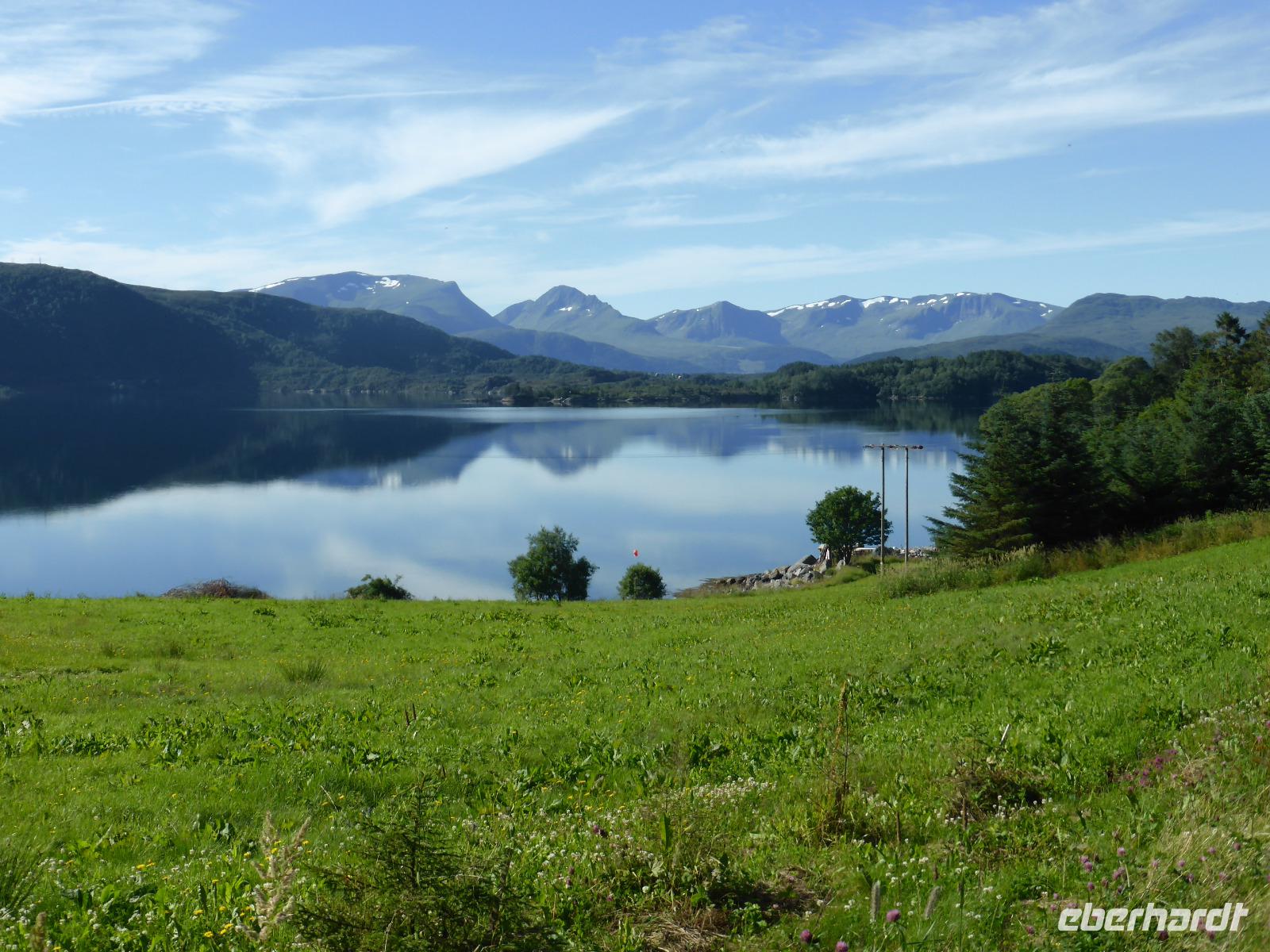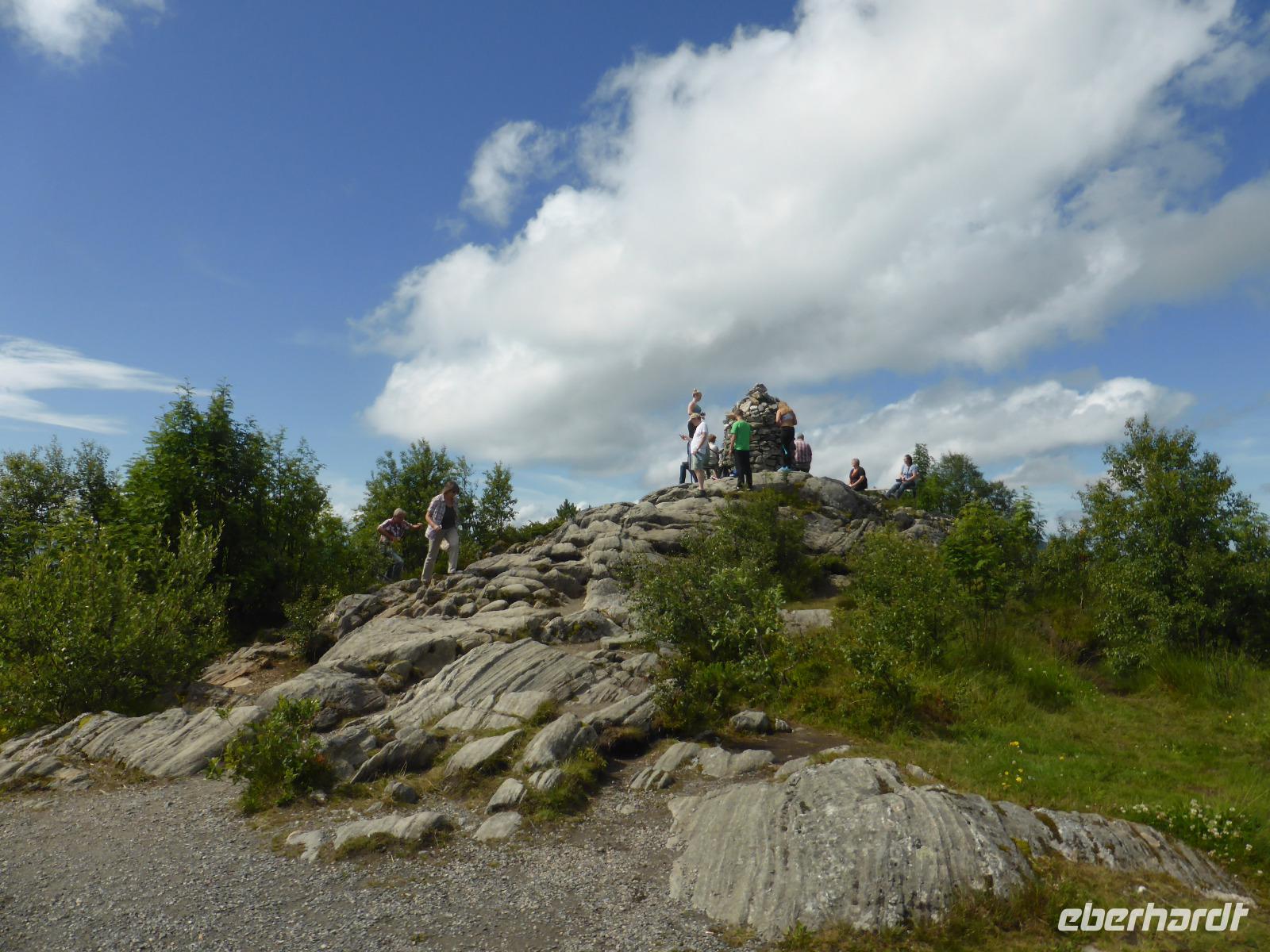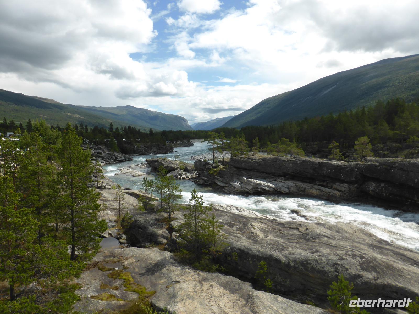 Nach unser Abfahrt vom Eidfjord ging es durch den Vavalik-Tunnel, in welchem sich gleich zwei, durch blaue Lichtinstallationen beleuchtete, Kreisverkehre befinden. Unser erster Fotostopp war am Tvindefossen-Wasserfall, in dessen Nähe sich auch ein großer Campingplatz befindet. Unvorstellbar, wie man bei dieser Lautstärke überhaupt nachts schlafen kann. Vom Tvindefossen ging es nach Gudvangen, von wo aus unser Fährschiff nach Flåm abfuhr. Die Fahrt führte durch den schmalen Naerøyfjord, welcher zusammen mit dem Geirangerfjord von der UNESCO auf die Liste des Welterbes gesetzt wurde. Zu beiden Seiten ragten spektakuläre, über 1200 Meter steil aufragende Felswände empor! Micha erwartete uns bei unserer Ankunft in Flåm bereits an der Anlegestelle und mit dem Bus ging es dann hinauf zur Aussichtsplattform „Stegastein", die sich in 640 Meter Höhe befindet. Obwohl wir weit in den Aurlandsfjorden hinein schauen konnten, war die Sicht doch etwas getrübt. Vom Aussichtspunkt ging es dann hinauf bis auf 1300 Meter Höhe zum Auerlandfjell. Hier lagen sogar noch richtige Eisfelder mit bläulichem Gletschereis und kleinen Schmelzseen. Mitten im Hochsommer erinnerten uns Wind und Außentemperatur eher an das Winterhalbjahr. Bei unserer Talfahrt trafen wir ausgerechnet an den Stellen, an denen es auch schon für zwei sich begegnende Pkw's kritisch geworden wäre, auf entgegenkommende Wohnmobile. In einem Fall mussten wir sogar gewaltige Steine am Fahrbahnrand beiseite wuchten, damit wir aneinander vorbei kamen. Nach einem Halt an der Sognefjell-Hütte passierten wir anschließend mit 1434 m die höchste Stelle des Sognefjells und verließen kurze Zeit später die asphaltierte Straße. Der weitere Weg war ein unbefestigter Steinweg, welcher an der „Leirvassbu Mountain Lodge" inmitten der Berge und am Rand des Jotunheimen Nationalparks endete. Die Lodge war urig und rustikal sowie gut besucht von unzähligen Wanderfreunden.