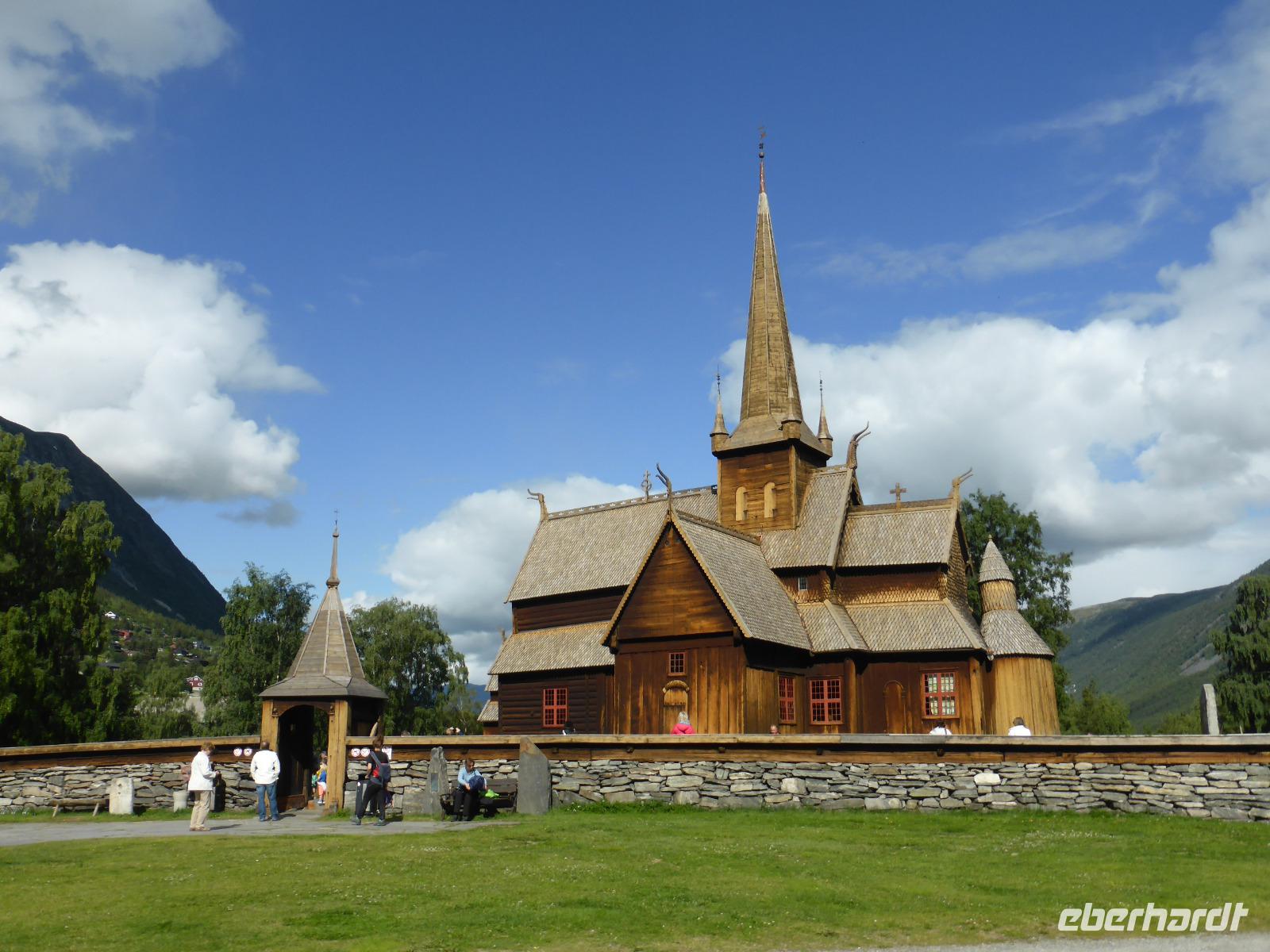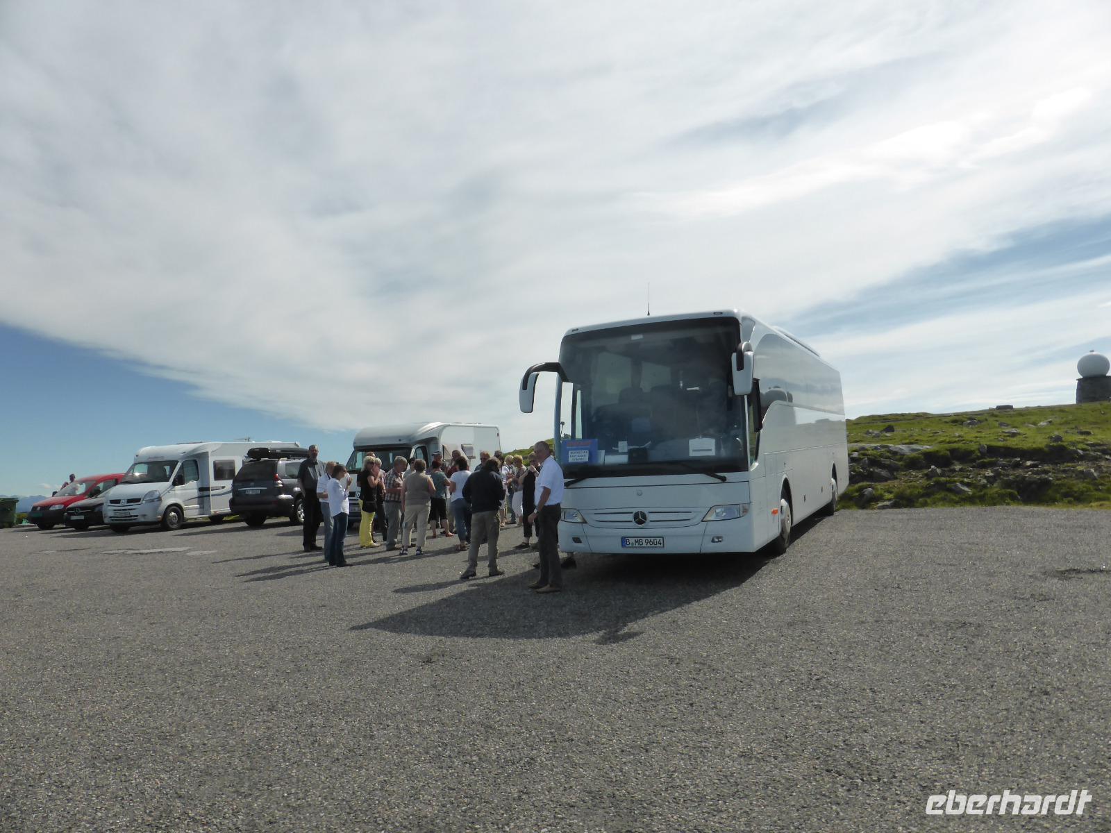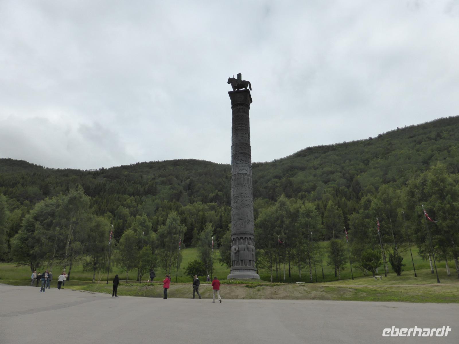 Beim Blick aus dem Fenster lockten die in der Sonne liegenden Berge und der blaue, von weißen Fotowolken verzierte Himmel. Zunächst fuhren wir auf dem unbefestigten Steinweg zurück zur Asphaltstraße und von dort zum Elveseter Hotel. Direkt neben dem Hotel steht die ca. 30 Meter hohe Saga-Granitsäule, auf der die Geschichte Norwegens von der Reichsbildung im Jahre 872 bis zur Reichsversammlung im Jahre 1814 dargestellt ist. Entlang des Bøverdalen ging es nach Lom. Hier steht eine der am besten erhaltenen Stabkirchen Norwegens, welche wir bei einer sehr interessanten Führung kennenlernen durften. Sie ist ca. 800 Jahre alt und beheimatet die größte Gemäldesammlung aller norwegischen Kirchen. Anschließend hatten wir in Lom Freizeit und fuhren danach durch das Otta-Tal in Richtung Geiranger. Unterwegs mussten wir immer wieder auf Kühe Rücksicht nehmen, welche uns die Fahrbahn streitig machten. An den Dønfoss-Stromschnellen hielten wir ein letztes Mal im Otta-Tal, um uns den traumhaft schönen Campingplatz mit großem Außenpool am Otta-Fluss ansehen zu können. Auf der Weiterfahrt nach Geiranger kamen wir nur langsam voran, da uns die Ausflugsbusse des Kreuzfahrtschiffes entgegenkamen und wir immer wieder anhalten mussten. Erstere wollten hinauf zum Berg Dalsnibba und wir hinunter zur Schiffsanlegestelle am Geirangerfjord. Buchstäblich auf die letzte Minute kamen wir am Ausflugsschiff an. Die Fahrt vorbei an den Wasserfällen der „Sieben Schwestern", dem „Freier" und dem „Brautschleier" sowie an den sich auf den Felsvorsprüngen befindenden, verlassenen Berghöfen war ein einmaliges Erlebnis. Wieder in Geiranger angekommen, beschlossen wir aufgrund des fantastischen Wetters ebenfalls zum Aussichtsberg Dalsnibba (1495 m) hinauf zu fahren. Bereits nach kurzer Bergfahrt auf den Serpentinen bemerkten wir, dass mit unserem Bus etwas nicht stimmte. Er hatte immer wieder Aussetzer und beschleunigte nicht gleichmäßig bis er endgültig stehenblieb und nicht mehr ansprang. Alle Fahrgäste mussten aussteigen. Glücklicherweise konnte ein hinter uns fahrender Bus alle Gäste und auch das Gepäck bis zu unserem Hotel mitnehmen. Die Ursache für unsere Panne war eine Benzinbetankung am Morgen durch den örtlichen Tankwart in Lom. Wir bemerkten dies beim Kontrollieren der Tankquittungen. Nachdem wir nach langsamer Fahrt mit leerem Bus ebenfalls am Hotel ankamen, musste das Benzin-Dieselgemisch vom Mercedes-Notdienst abgepumpt und der Tank mit reinem Diesel wieder aufgefüllt werden.