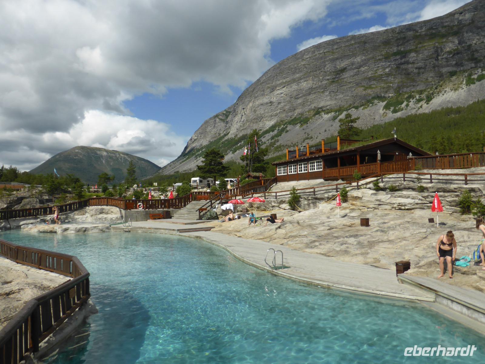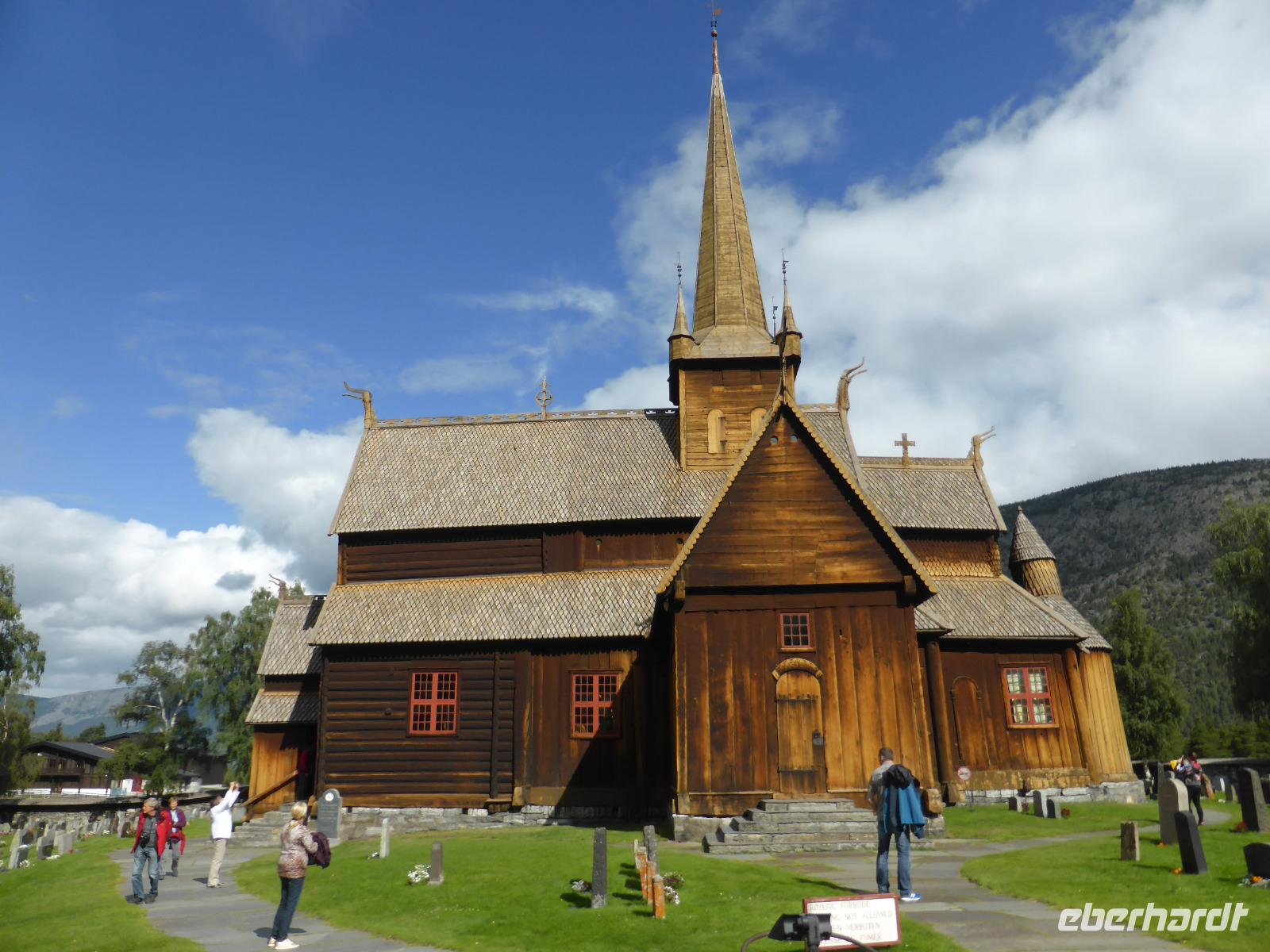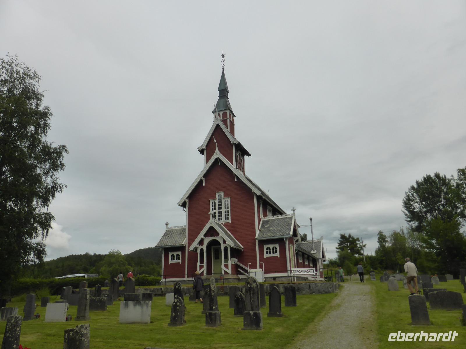 Beim Blick aus dem Fenster lockten die in der Sonne liegenden Berge und der blaue, von weißen Fotowolken verzierte Himmel. Zunächst fuhren wir auf dem unbefestigten Steinweg zurück zur Asphaltstraße und von dort zum Elveseter Hotel. Direkt neben dem Hotel steht die ca. 30 Meter hohe Saga-Granitsäule, auf der die Geschichte Norwegens von der Reichsbildung im Jahre 872 bis zur Reichsversammlung im Jahre 1814 dargestellt ist. Entlang des Bøverdalen ging es nach Lom. Hier steht eine der am besten erhaltenen Stabkirchen Norwegens, welche wir bei einer sehr interessanten Führung kennenlernen durften. Sie ist ca. 800 Jahre alt und beheimatet die größte Gemäldesammlung aller norwegischen Kirchen. Anschließend hatten wir in Lom Freizeit und fuhren danach durch das Otta-Tal in Richtung Geiranger. Unterwegs mussten wir immer wieder auf Kühe Rücksicht nehmen, welche uns die Fahrbahn streitig machten. An den Dønfoss-Stromschnellen hielten wir ein letztes Mal im Otta-Tal, um uns den traumhaft schönen Campingplatz mit großem Außenpool am Otta-Fluss ansehen zu können. Auf der Weiterfahrt nach Geiranger kamen wir nur langsam voran, da uns die Ausflugsbusse des Kreuzfahrtschiffes entgegenkamen und wir immer wieder anhalten mussten. Erstere wollten hinauf zum Berg Dalsnibba und wir hinunter zur Schiffsanlegestelle am Geirangerfjord. Buchstäblich auf die letzte Minute kamen wir am Ausflugsschiff an. Die Fahrt vorbei an den Wasserfällen der „Sieben Schwestern", dem „Freier" und dem „Brautschleier" sowie an den sich auf den Felsvorsprüngen befindenden, verlassenen Berghöfen war ein einmaliges Erlebnis. Wieder in Geiranger angekommen, beschlossen wir aufgrund des fantastischen Wetters ebenfalls zum Aussichtsberg Dalsnibba (1495 m) hinauf zu fahren. Bereits nach kurzer Bergfahrt auf den Serpentinen bemerkten wir, dass mit unserem Bus etwas nicht stimmte. Er hatte immer wieder Aussetzer und beschleunigte nicht gleichmäßig bis er endgültig stehenblieb und nicht mehr ansprang. Alle Fahrgäste mussten aussteigen. Glücklicherweise konnte ein hinter uns fahrender Bus alle Gäste und auch das Gepäck bis zu unserem Hotel mitnehmen. Die Ursache für unsere Panne war eine Benzinbetankung am Morgen durch den örtlichen Tankwart in Lom. Wir bemerkten dies beim Kontrollieren der Tankquittungen. Nachdem wir nach langsamer Fahrt mit leerem Bus ebenfalls am Hotel ankamen, musste das Benzin-Dieselgemisch vom Mercedes-Notdienst abgepumpt und der Tank mit reinem Diesel wieder aufgefüllt werden.
