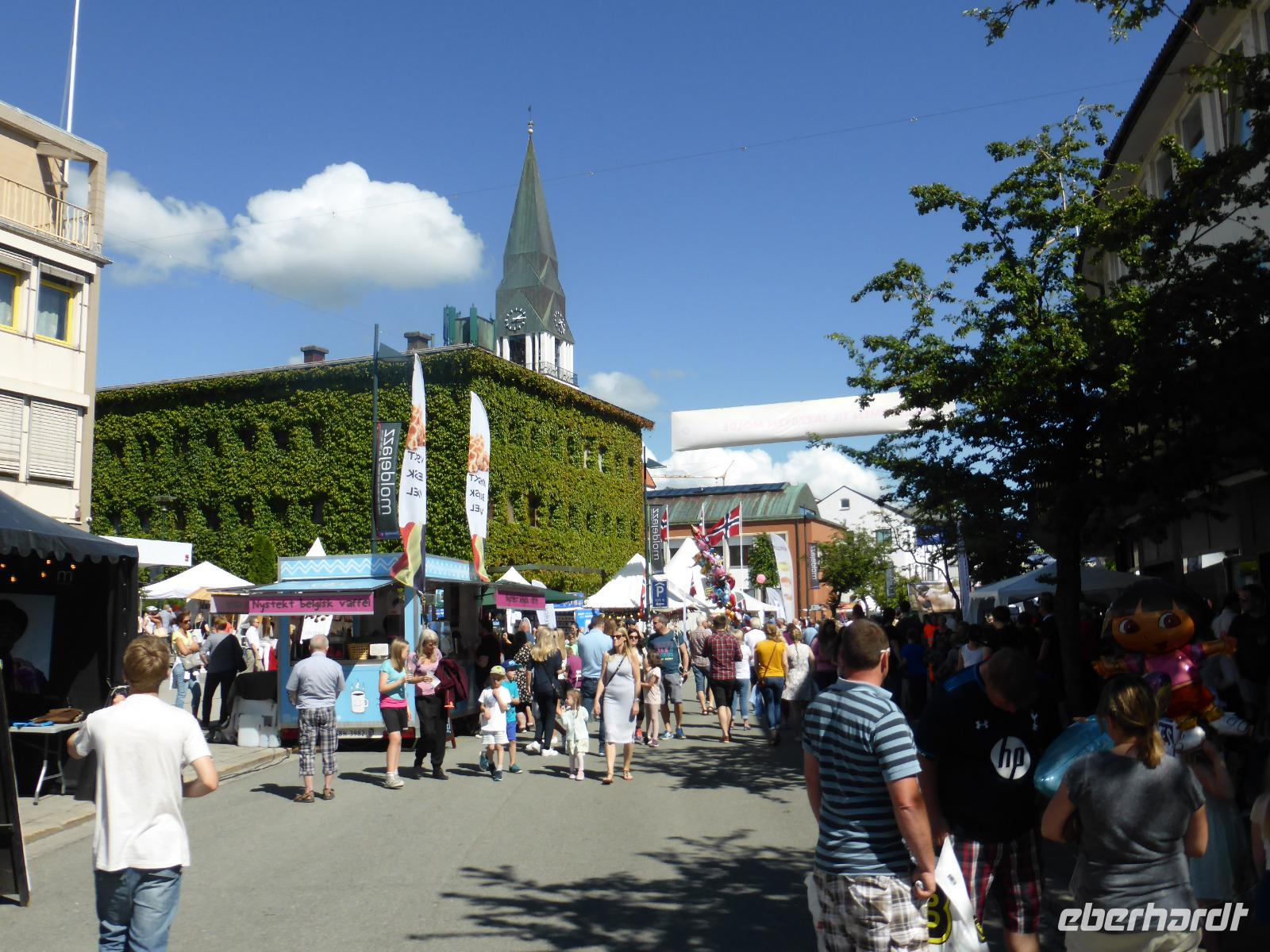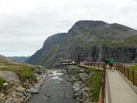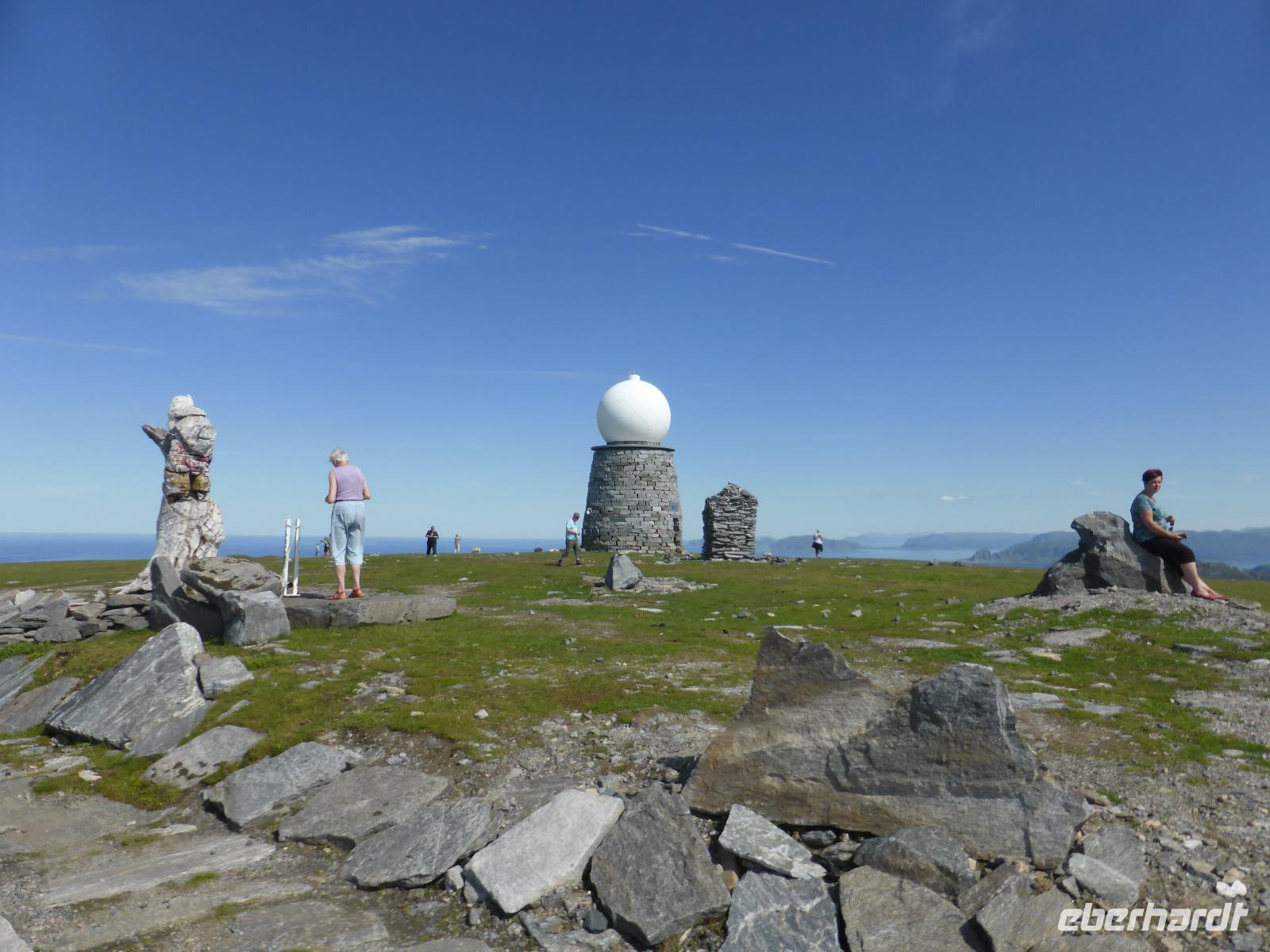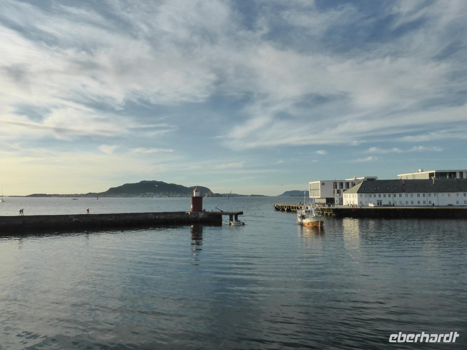 Am Morgen war der Bus wieder 100 prozentig einsatzbereit. Wir fuhren zum Geirangerfjord und von diesem über unzählige Kehren die „Adlerstraße" hinauf bis zum Aussichtspunkt „Ørnesvingen". Von da hatten wir einen tollen Blick auf den Geirangerfjord. Anschießend ging es nach Eidsdal und von dort mit der Fähre nach Linge. An den Gudbrandsjuvet-Stromschnellen legten wir unseren nächsten Halt ein. Hier boten Mädchen frische Erdbeeren an, die von unseren Gästen reichlich gekauft wurden. Auf der Passhöhe an der Grenze der Norddal- zur Rauma-Kommune hielten wir für einen weiteren Fotostopp und unsere große Mittagspause legten wir am Besucherzentrum des Trollstiegen ein. Der Trollstiegen ist eine 18 km lange Serpentinenstraße mit einer Steigung von bis zu 12 Prozent. Nach der Pause fuhren wir die Serpentinen hinunter und über Åndalsnes am Romsdalsfjorden zum Fähranleger in Afarnes um nach Sølsnes überzusetzen. Dort angekommen, hielten wir zunächst für einen Fotostopp an der Holzkirche von Sølsnes und später ein weiteres Mal an der Brücke „Gjemnesundbrua". Gegen 17.30 Uhr kamen wir an unserem Hotel in Kristiansund an. Wer wollte, der konnte nach dem Bezug der Zimmer mit zur Bronzestatue der „Klippfischfrau" gehen. Der Verkauf von Klippfisch und von Heringen war über zwei Jahrhunderte der wichtigste Erwerbszweig in Kristiansund, weshalb der „Klippfischfrau" und dem „Heringsjungen" Denkmäler gesetzt wurde.