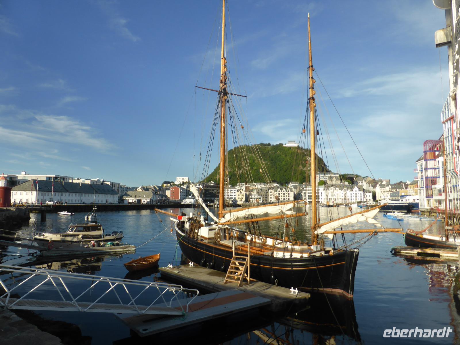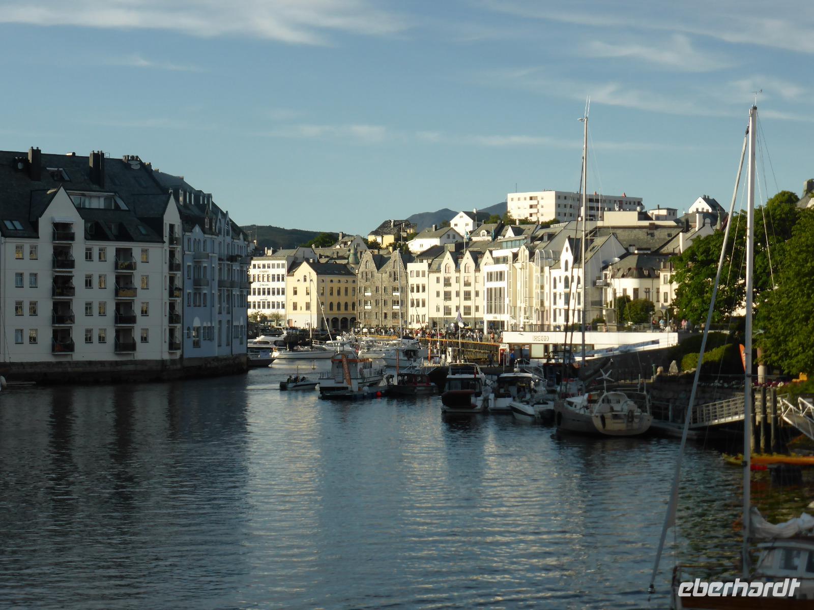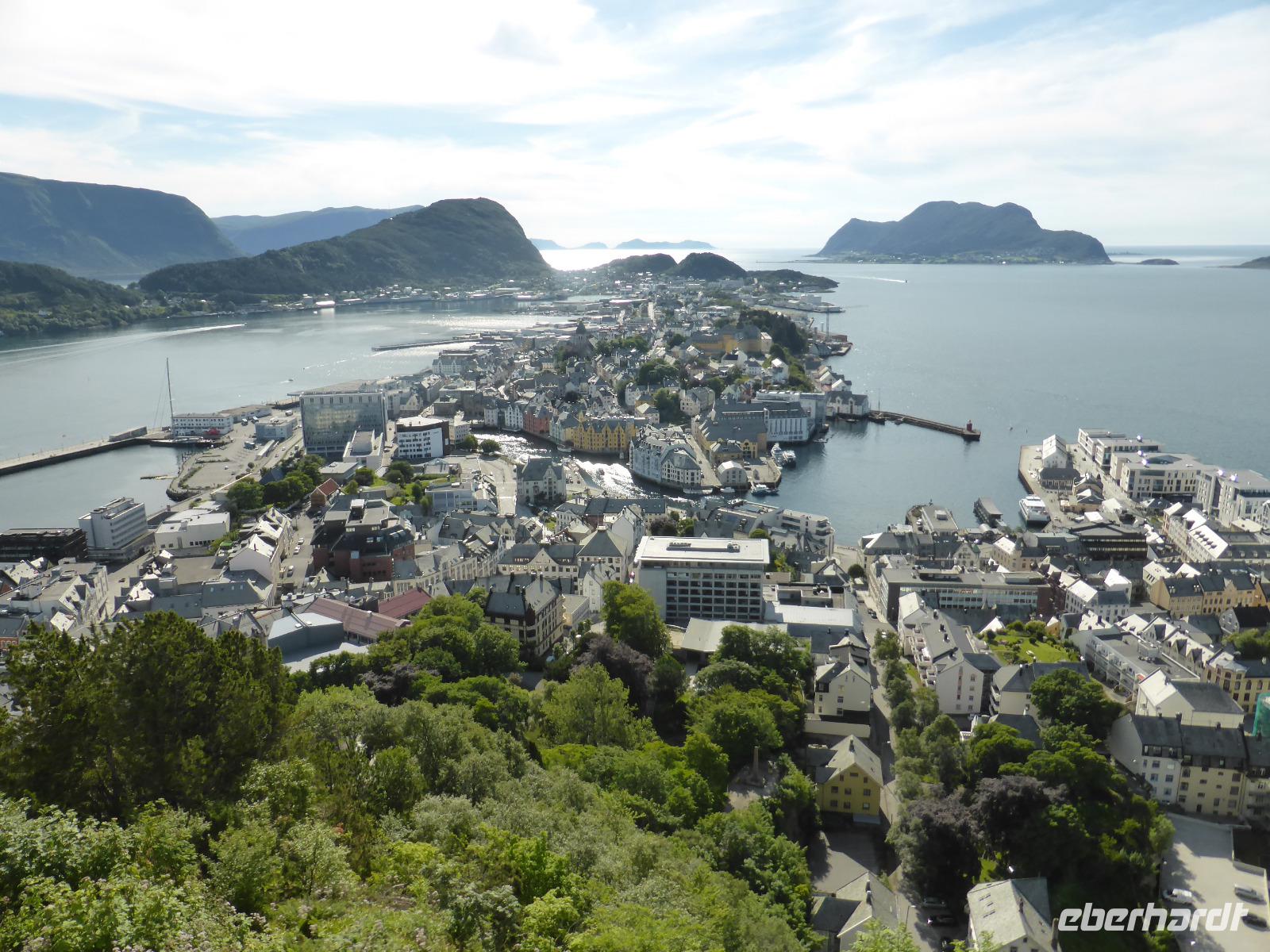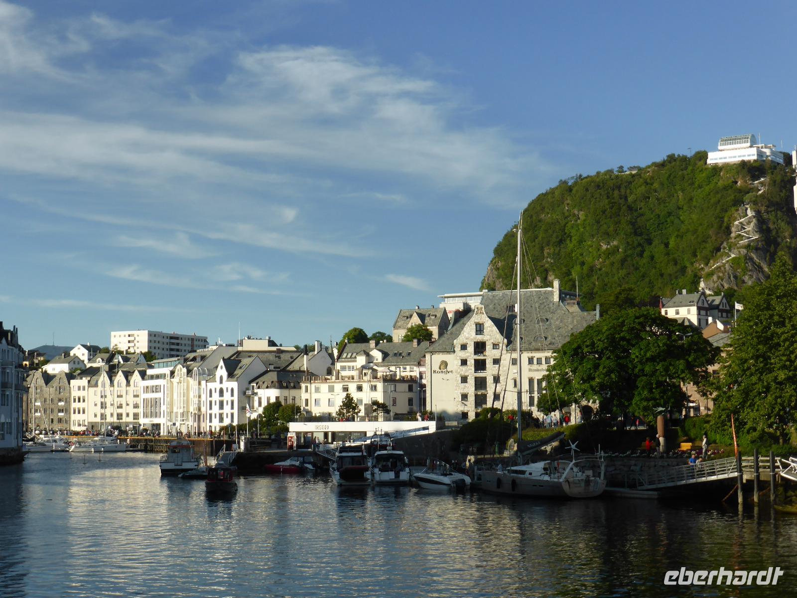 Håholmen Kårvåg spazierten wir auf der kleinen Insel Eidhusøya entlang des Rundweges, um die Brücke „Storseisubdbrua" fotografieren zu können. Dabei sahen wir Moltebeeren und eine Vielzahl weiterer Pflanzen. Unser nächster Halt war in dem kleinen Fischerort Bud. Oberhalb der Ortschaft befinden sich auf einem Hügel ein Steingarten sowie mehrere Artillerie-Geschütze des Atlantik-Walls. Das Ergan-Küstenfort-Museum informiert über die Kriegsgeschichte des Ortes und eine weitere Ausstellung über die Küstenkulturlandschaft. Von Bud aus ging es nach Molde, genauer gesagt auf den Aussichtsberg Varden. Von diesem hatten wir einen spektakulären Blick über die Insel- und Fjordwelt der Küste. Das Wetter war fantastisch. Unter uns, in weiter Entfernung lag Molde. Wir hörten einen Spielmannszug, welcher bestimmt im Zusammenhang mit dem gerade stattfindenden Jazz-Festivals stand. Nach unserem Aufenthalt auf dem Aussichtsberg fuhren wir hinunter zum Fähranleger und spazierten ins Zentrum von Molde. Überall waren Verkaufsstände aufgebaut und an jeder Ecke ertönte eine andere Musik, auch sehr viele Straßenmusiker waren zu sehen. Mit dem Fährschiff fuhren wir anschließend von Molde nach Furneset und von dort mit dem Bus weiter nach Ålesund zum Restaurant „Fjellstua" auf dem Aussichtsberg Aksla. Auch von diesem Berg hatten wir eine fantastische Sicht! Zufällig kam genau zu dieser Zeit das Hurtigrutenschiff an, was deutlich hörbar mit dem Signalhorn angezeigt wurde. Vom Aksla-Berg fuhren wir dann zu unserem Hotel und trafen uns dort nach dem Abendessen zu einem gemeinsamen abendlichen Spaziergang durch Ålesund.
