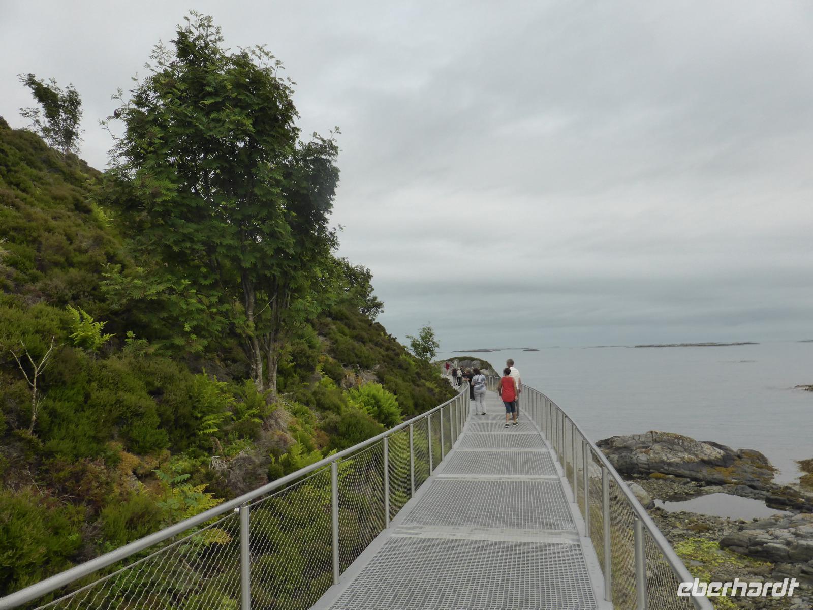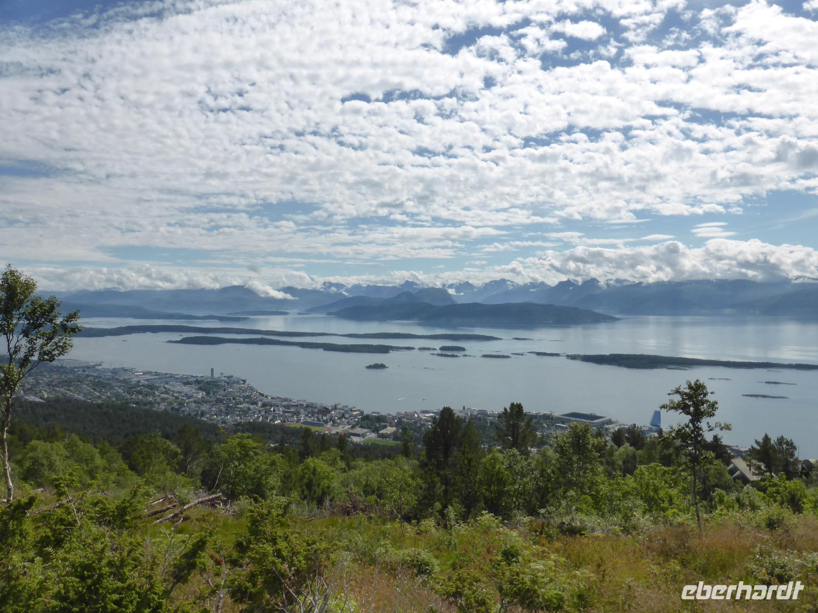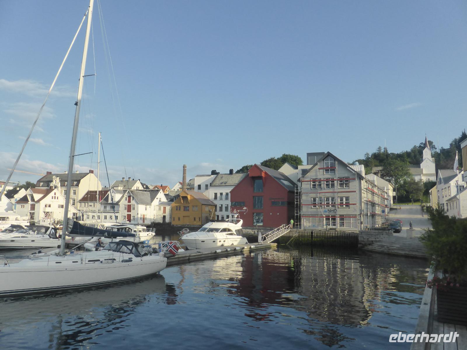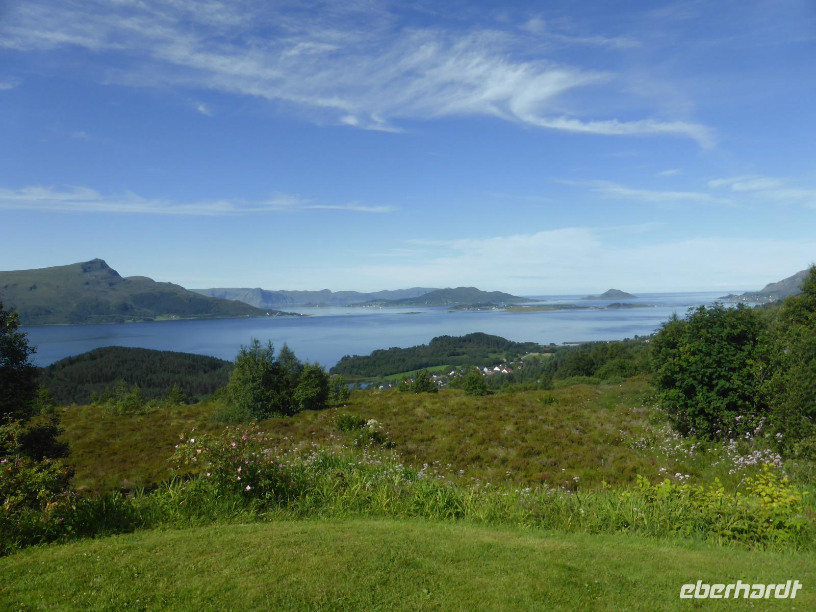Håholmen Kårvåg spazierten wir auf der kleinen Insel Eidhusøya entlang des Rundweges, um die Brücke „Storseisubdbrua" fotografieren zu können. Dabei sahen wir Moltebeeren und eine Vielzahl weiterer Pflanzen. Unser nächster Halt war in dem kleinen Fischerort Bud. Oberhalb der Ortschaft befinden sich auf einem Hügel ein Steingarten sowie mehrere Artillerie-Geschütze des Atlantik-Walls. Das Ergan-Küstenfort-Museum informiert über die Kriegsgeschichte des Ortes und eine weitere Ausstellung über die Küstenkulturlandschaft. Von Bud aus ging es nach Molde, genauer gesagt auf den Aussichtsberg Varden. Von diesem hatten wir einen spektakulären Blick über die Insel- und Fjordwelt der Küste. Das Wetter war fantastisch. Unter uns, in weiter Entfernung lag Molde. Wir hörten einen Spielmannszug, welcher bestimmt im Zusammenhang mit dem gerade stattfindenden Jazz-Festivals stand. Nach unserem Aufenthalt auf dem Aussichtsberg fuhren wir hinunter zum Fähranleger und spazierten ins Zentrum von Molde. Überall waren Verkaufsstände aufgebaut und an jeder Ecke ertönte eine andere Musik, auch sehr viele Straßenmusiker waren zu sehen. Mit dem Fährschiff fuhren wir anschließend von Molde nach Furneset und von dort mit dem Bus weiter nach Ålesund zum Restaurant „Fjellstua" auf dem Aussichtsberg Aksla. Auch von diesem Berg hatten wir eine fantastische Sicht! Zufällig kam genau zu dieser Zeit das Hurtigrutenschiff an, was deutlich hörbar mit dem Signalhorn angezeigt wurde. Vom Aksla-Berg fuhren wir dann zu unserem Hotel und trafen uns dort nach dem Abendessen zu einem gemeinsamen abendlichen Spaziergang durch Ålesund.