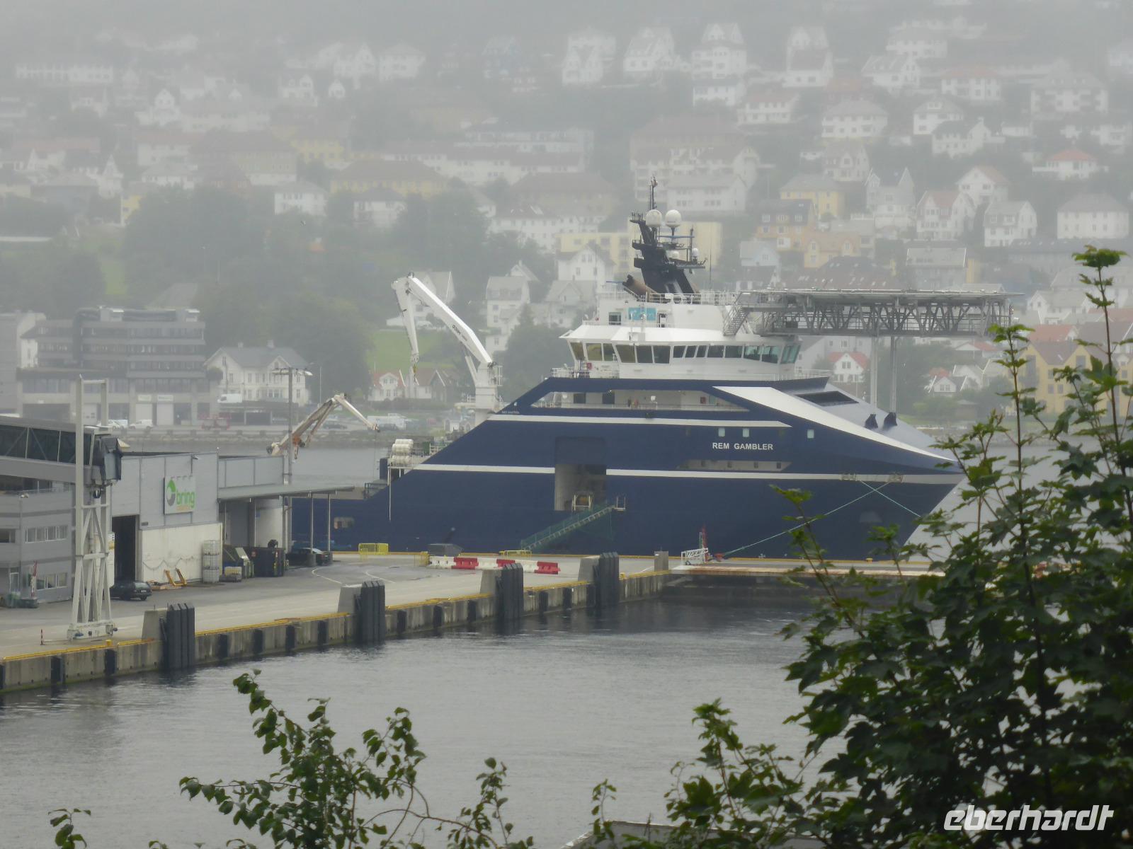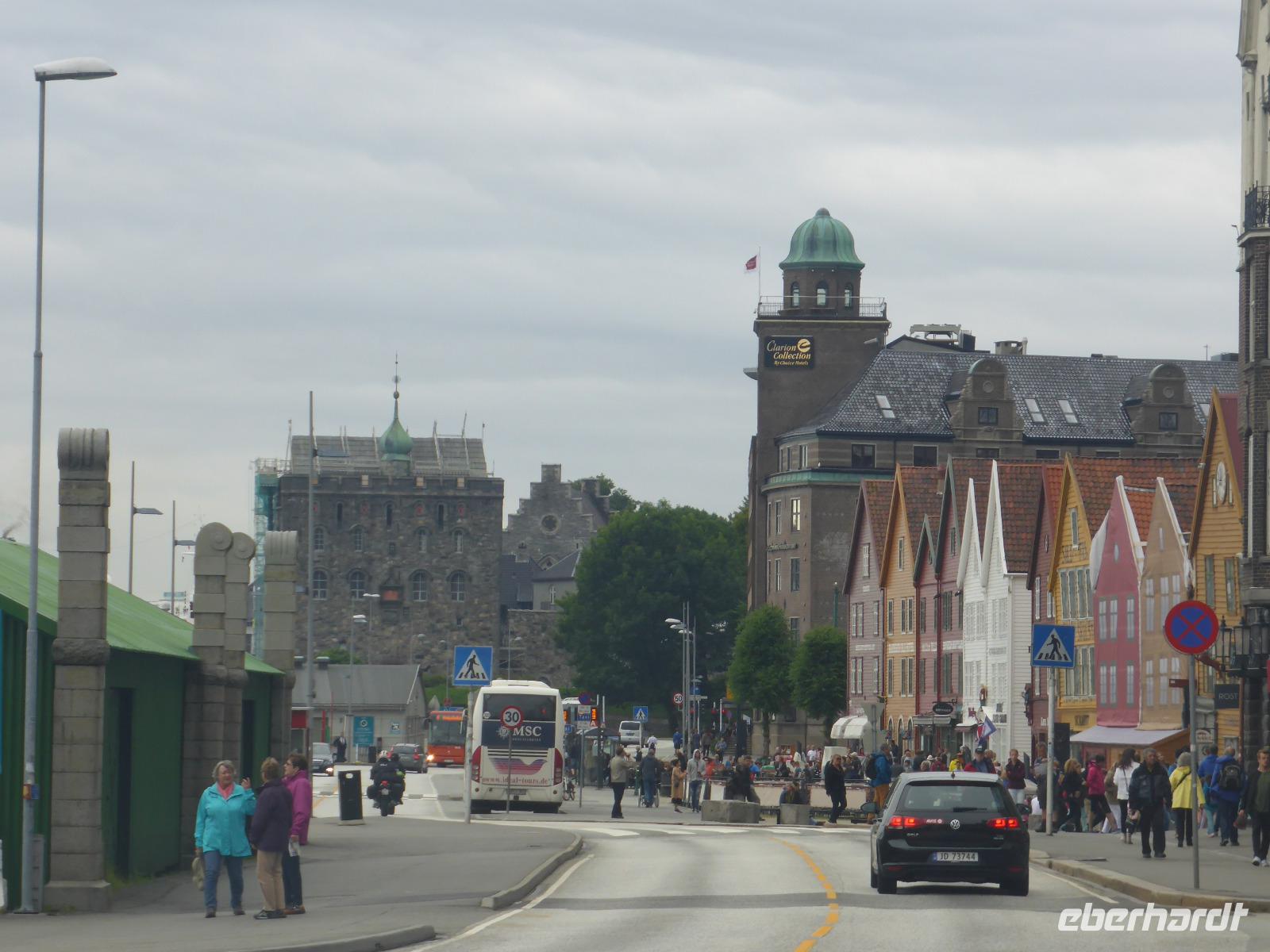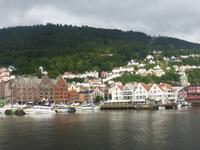 Am frühen Morgen fuhren wir zum Fähranleger der Hurtigrute. Nach dem fantastischen Wetter der letzten Tage war es zunächst regnerisch und trübe. Es war ein Erlebnis zu sehen, wie das Hurtigrutenschiff, die M/S Trollfjord, anlegte und sich die Ladeklappen wie von Geisterhand gesteuert öffneten. Florø ist die letzte Station vor Bergen. Diese Etappe dauert sechs Stunden und ist bei guter Sicht ein einzigartiges Erlebnis. Bei unserer Fahrt hatten wir leider nicht so viel Glück. Erst kurz vor Bergen hatten wir bessere Sicht. Trotzdem war es eine ruhige und angenehme Fahrt. Nach unserer Ankunft in Bergen wurden wir von unserer örtlichen Stadtführerin Sarah begrüßt und die Stadtrundfahrt konnte beginnen. Wir hielten am Hafen sowie an der ehemaligen Festungsanlage Frederiksberg und konnten von der Verftsgaten-Straße aus die Versorgungsschiffe der Ölplattformen sehen. An der „Bryggen", dem Stadtteil, in dem sich die Kaufmanns- und Lagerhäuser ehemals deutscher Kaufleute befinden, stiegen wir aus. Bei einem Spaziergang durch die Hinterhöfe sahen wir unzählige Souvenir- und Kunstgewerbe-Läden. Den Abschluss unserer Stadtbesichtigung bildete der Besuch des Bergener (Fisch)marktes. Es gab alles, sogar Walfleisch. Anschließend hatten wir Freizeit für einen individuellen Bummel über den Markt und durch die Innenstadt. Das Wetter wurde immer freundlicher. Nach dem Abendessen nutzten viele von uns die Gelegenheit, um mit der Standseilbahn auf den Aussichtsberg Fløyen zu fahren.