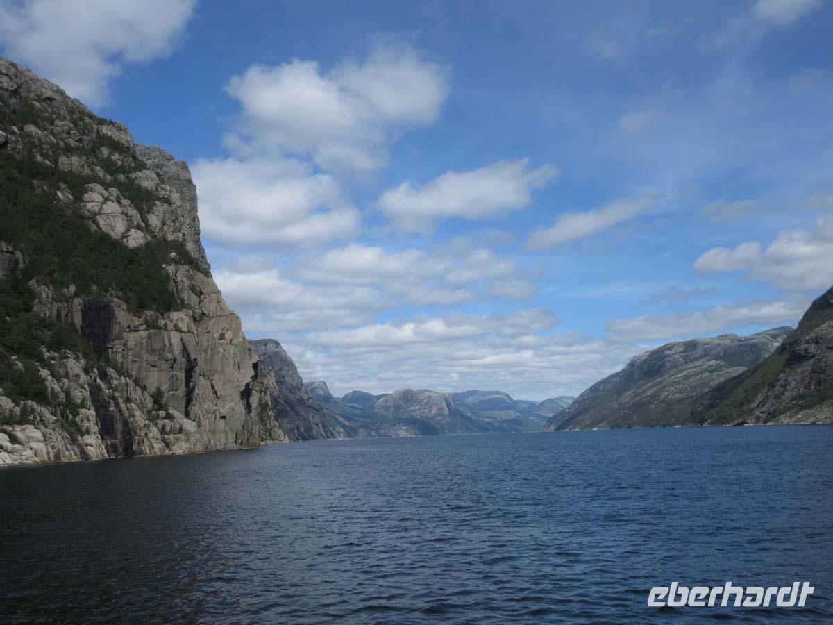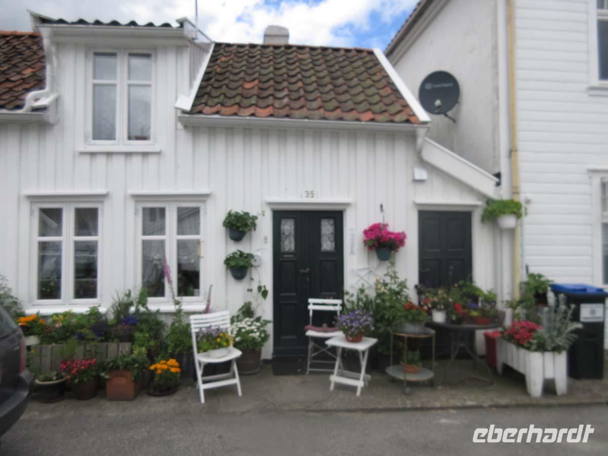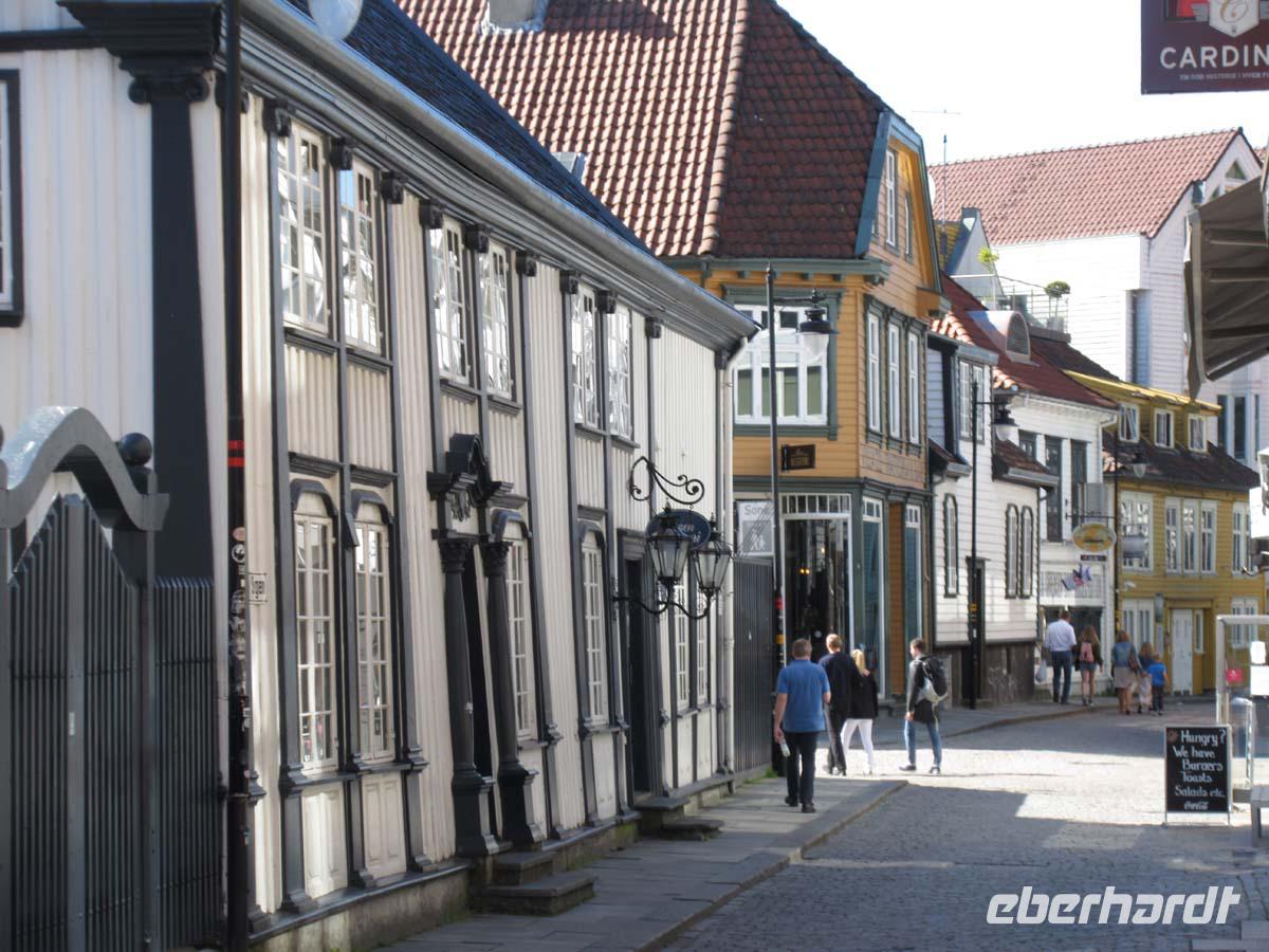 Der Nordsommer macht sich hier schon stark bemerkbar. Es will nachts einfach nicht mehr richtig dunkel werden. Dementsprechend früh sind viele auf den Beinen. Wir begeben uns zunächst nach Flekkefjord. Auch in diesem Städtchen betören wieder wie in Mandal die reinweiß gestrichenen Holzhäuschen, welche mitunter auch reichlich mit Blumen geschmückt sind. Weiße Farbe war ungeheuer teuer und wurde von Stadtbewohnern bewußt eingesetzt, um sich vom Falunrot der Bauernhäuser visuell abzusetzen. Was es mit dem Falunrot auf sich hat, erzähl ich aber nur im Bus. Meine Gäste wissen jetzt Bescheid! Ab 1660 unterhielt die Stadt enge Beziehungen zu den Niederlanden. Zunächst durch Holzhandel, später durch Fischfang. Viele Bewohner verdingten sich als Arbeitskräfte selbst in den Niederlanden und brachten Geld mit nach Haus. Mittags erreichen wir Stavanger und begeben uns zum Hafen. Während ein wenig Freizeit besteht die Möglichkeit den uralten Dom zu besichtigen und mit Ihm die einzige Kirche im echt anglonormannischem Stil. Hieß doch auch der erste Bischof hier Svithun von Winchester - und schon wird die Verbindung klar. Schon betreten wir das Schiff, welches uns durch einen der schönsten Fjorde schippert: Den bis zu 500 m tiefen Lysefjord. Bekannteste Sehenswürdigkeit ist hier natürlich der 600 m hohe Preikestolen, der Predigtstuhl. Die Fjordrundfahrt ist sehr schön gestaltet. Oft mit Musik untermalt, fahren wir bis dicht ans Ufer zu einer alten Höhle von Wegelagerern, die Fantehola und dicht an den Wasserfall Hengjanefossen, dessen klares Wasser etliche in Bechern auffangen, um es gleich zu genießen. Wieder an Land machen wir noch eine Runde durch die alten Gassen bis hinauf zum Valberget mit seinem alten Feuerwachtturm. Sodann erwartet uns im zentral gelegenen Hotel das Abendmenue.