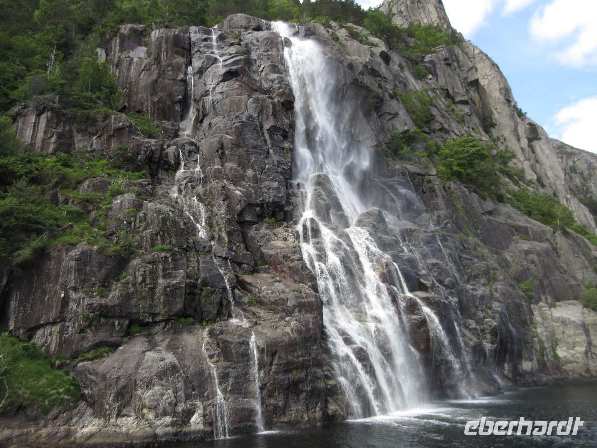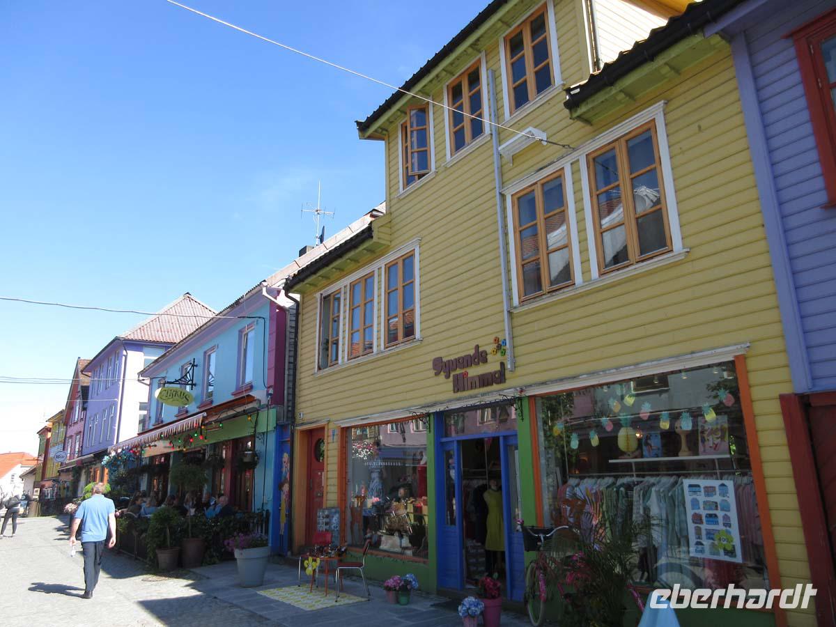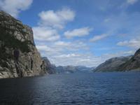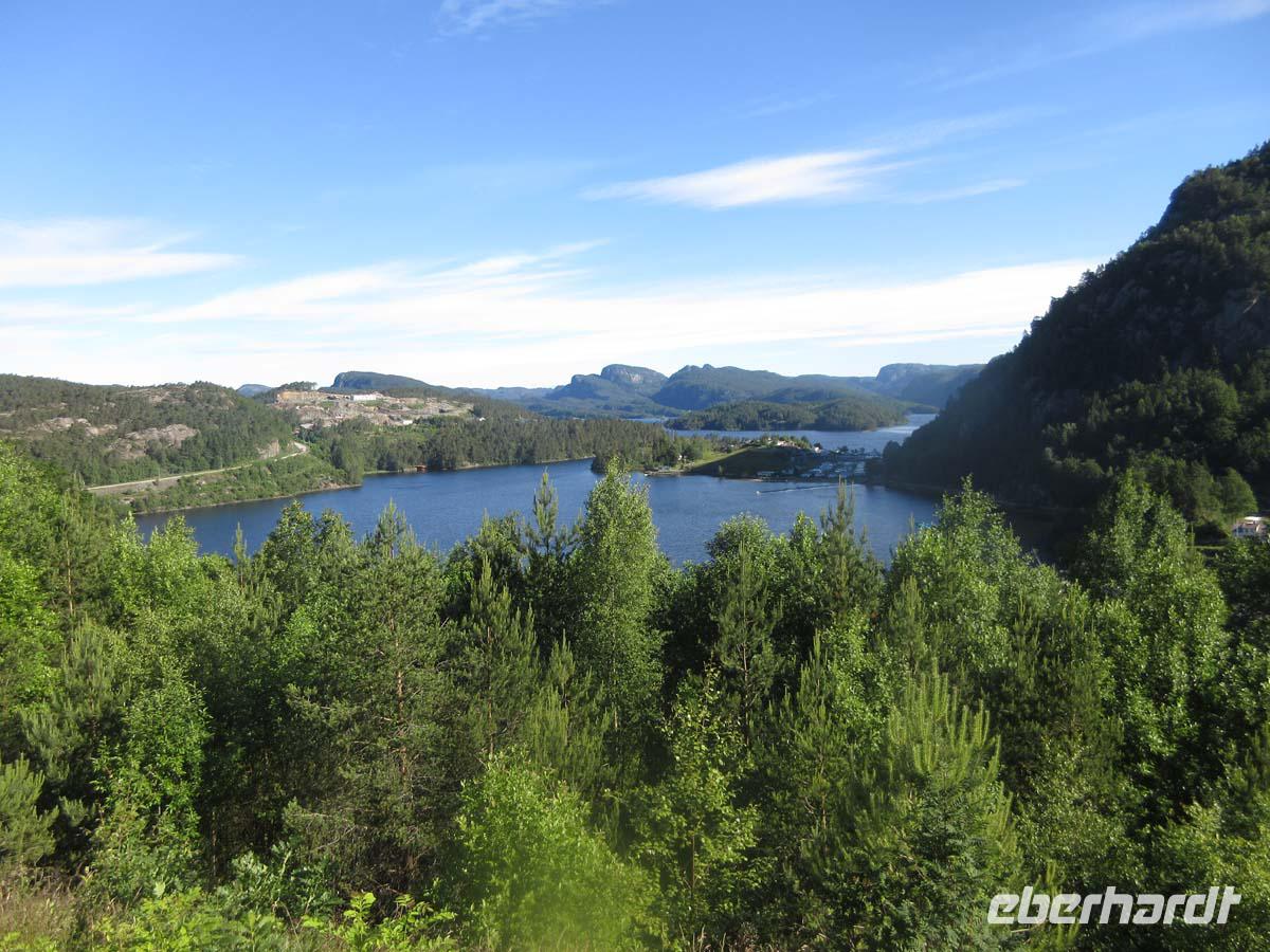 Der Nordsommer macht sich hier schon stark bemerkbar. Es will nachts einfach nicht mehr richtig dunkel werden. Dementsprechend früh sind viele auf den Beinen. Wir begeben uns zunächst nach Flekkefjord. Auch in diesem Städtchen betören wieder wie in Mandal die reinweiß gestrichenen Holzhäuschen, welche mitunter auch reichlich mit Blumen geschmückt sind. Weiße Farbe war ungeheuer teuer und wurde von Stadtbewohnern bewußt eingesetzt, um sich vom Falunrot der Bauernhäuser visuell abzusetzen. Was es mit dem Falunrot auf sich hat, erzähl ich aber nur im Bus. Meine Gäste wissen jetzt Bescheid! Ab 1660 unterhielt die Stadt enge Beziehungen zu den Niederlanden. Zunächst durch Holzhandel, später durch Fischfang. Viele Bewohner verdingten sich als Arbeitskräfte selbst in den Niederlanden und brachten Geld mit nach Haus. Mittags erreichen wir Stavanger und begeben uns zum Hafen. Während ein wenig Freizeit besteht die Möglichkeit den uralten Dom zu besichtigen und mit Ihm die einzige Kirche im echt anglonormannischem Stil. Hieß doch auch der erste Bischof hier Svithun von Winchester - und schon wird die Verbindung klar. Schon betreten wir das Schiff, welches uns durch einen der schönsten Fjorde schippert: Den bis zu 500 m tiefen Lysefjord. Bekannteste Sehenswürdigkeit ist hier natürlich der 600 m hohe Preikestolen, der Predigtstuhl. Die Fjordrundfahrt ist sehr schön gestaltet. Oft mit Musik untermalt, fahren wir bis dicht ans Ufer zu einer alten Höhle von Wegelagerern, die Fantehola und dicht an den Wasserfall Hengjanefossen, dessen klares Wasser etliche in Bechern auffangen, um es gleich zu genießen. Wieder an Land machen wir noch eine Runde durch die alten Gassen bis hinauf zum Valberget mit seinem alten Feuerwachtturm. Sodann erwartet uns im zentral gelegenen Hotel das Abendmenue.