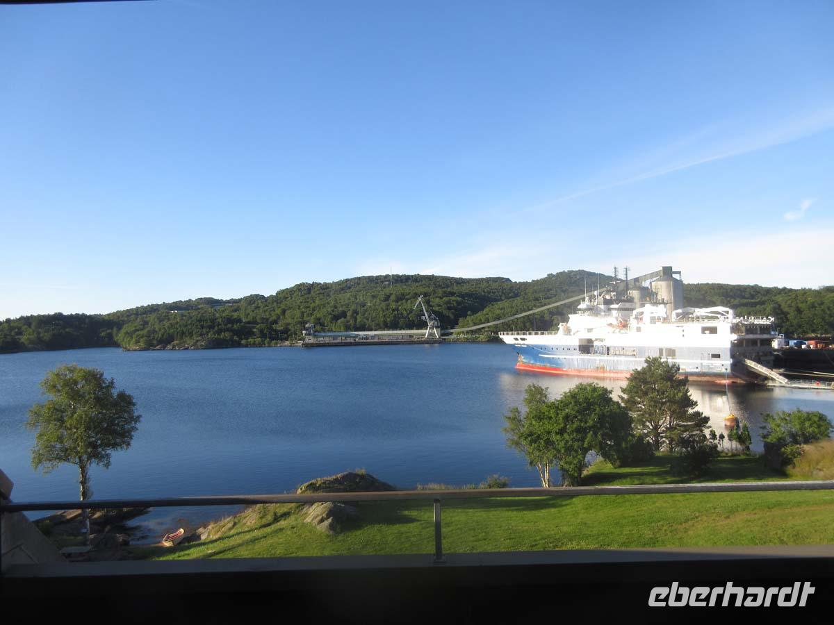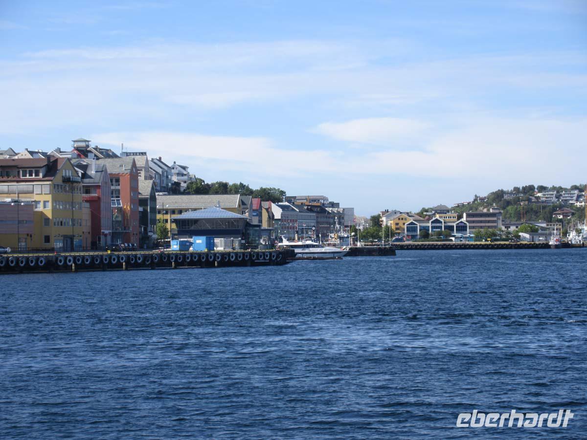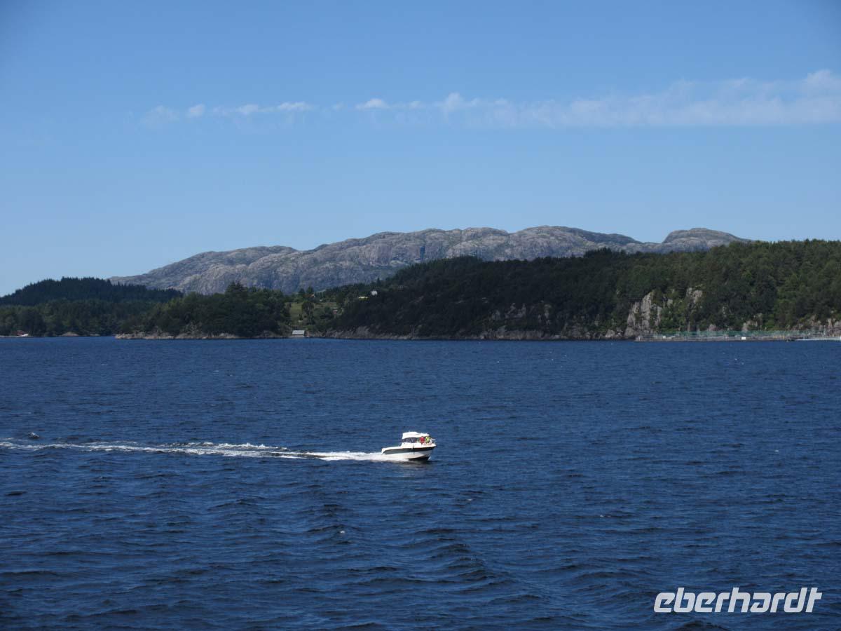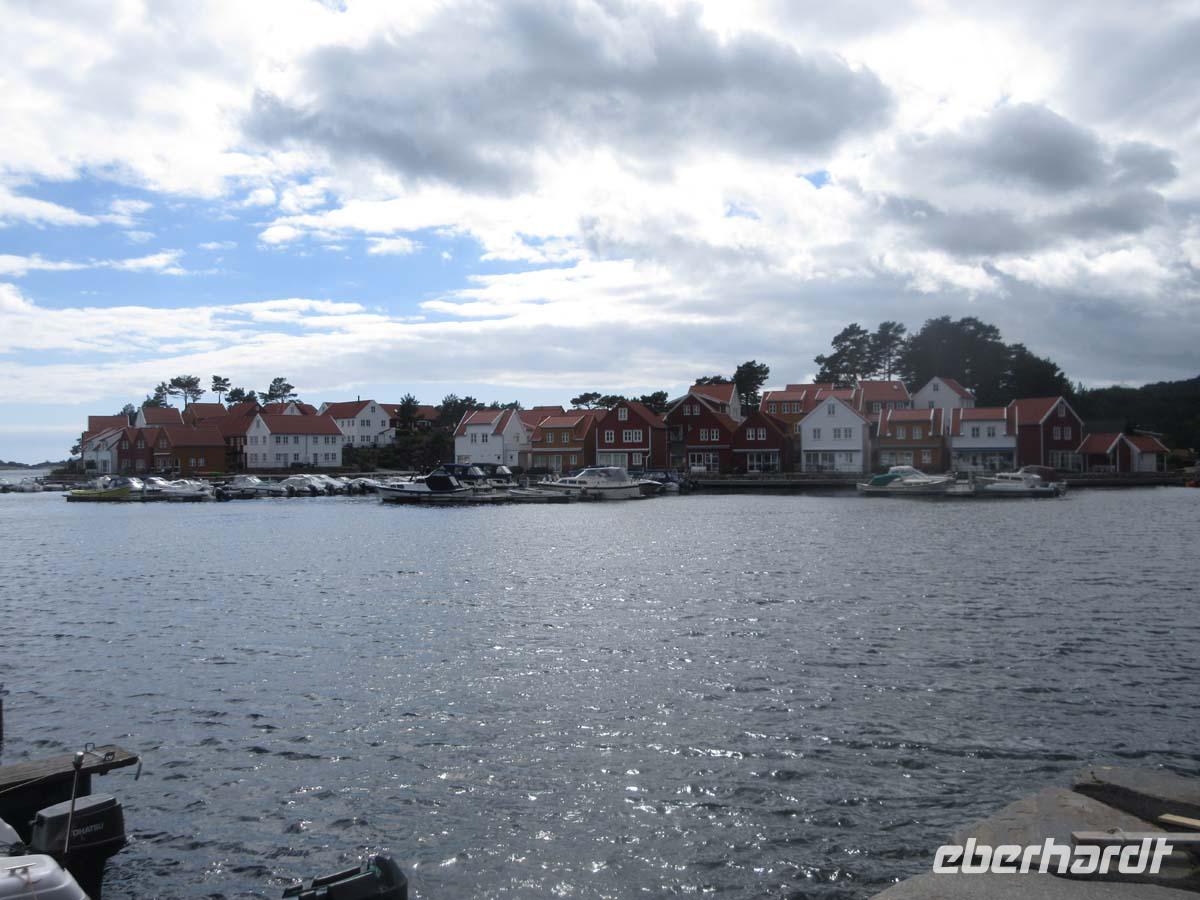 Nach einem recht frühen Morgenmahl befinden wir uns zeitig in Hirtshals vor der Fähre. Von hier aus setzen wir in 2,5 Stunden mit einer Katamaranfähre nach Kristiansand in Norwegen über. Die See ist recht unruhig und es schaukelt ganz gewaltig. Doch schon sind wir angelandet und holen in der Stadt noch 10 Gäste ab, welche mit dem Flugzeug gekommen sind. Einige Gäste nutzen die Gelegenheit auch zum Geld abheben, denn Geldwechsel nehmen norwegische Banken so gut wie gar nicht mehr vor. Man wird freundlichst an die Bankomaten verwiesen. Unser erstes Ziel ist das kleine Städtchen Mandal, welches mit einer schönen Altstadt voller weißer, denkmalgeschützter Häuser besticht. Es verfügt auch über einen neue Kulturhalle mit einer überaus gut sortierten Touristinformation, in der wir uns mit reichlich Infomaterial für die nächsten Ziele eindecken können. Nach einem kleinen Spaziergang durch die Stadt setzen wir unsere Reise zum Kap Lindesnes fort. Vorher jedoch stoppen wir an Rorbuer, den typischen Fischerhütten, von denen in Fururholmen eine ganze Menge zu sehen sind. Dann sind wir am Kap Lindesnes, dem südlichsten in Norwegen auf dem seit 1655 ein Leuchtfeuer existiert. Jedoch sollte man nicht meinen, dass man Dieses ohne Eintritt betreten kann. Ganz geschickt sind Kassenhaus und Visitorcenter so in die schartige Küstenlandschaft gesetzt, dass man das eigentliche Kap entwder gar nicht, oder nach einer halsbrecherischen Klettertour über Granitfelsen nur aus der Ferne sieht. Das soll die Gäste jedoch nicht stören. Eberhardt-travel übernimmt (im Ggs. zu manch anderen) selbstverständlich die Eintrittskosten! Den heutigen Leuchtturm von 1915 kann man besteigen und dort ist es so stürmisch, dass es einen fast wegweht. Zusätzlich sind Kanonenstellungen und Bunker aus dem 2. Weltkrieg zu sehen und eine stattliche Sammlung schicker Miniaturleuchttürme. Für die Eintrittskarte bekommt man im großen Visitorcenter noch einen Kaffee. Unser Tag endet in Farsund. Alle Zimmer unseres Hotels haben einen Balkon mit direktem Blick auf das Wasser. Und dann wieder diese himmlische Ruhe.......