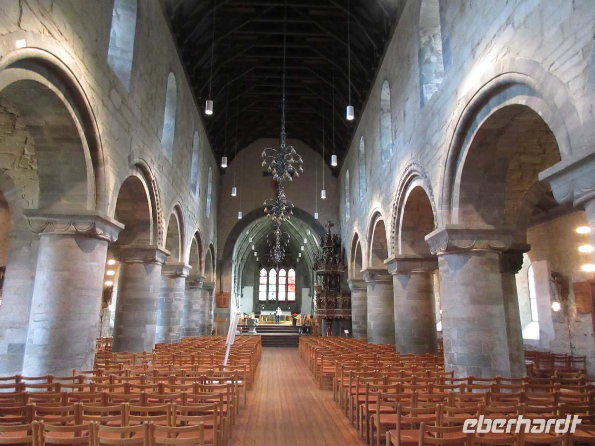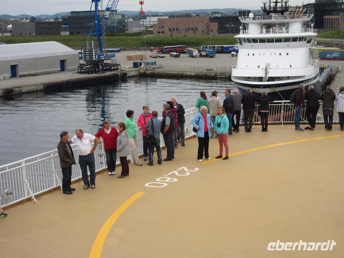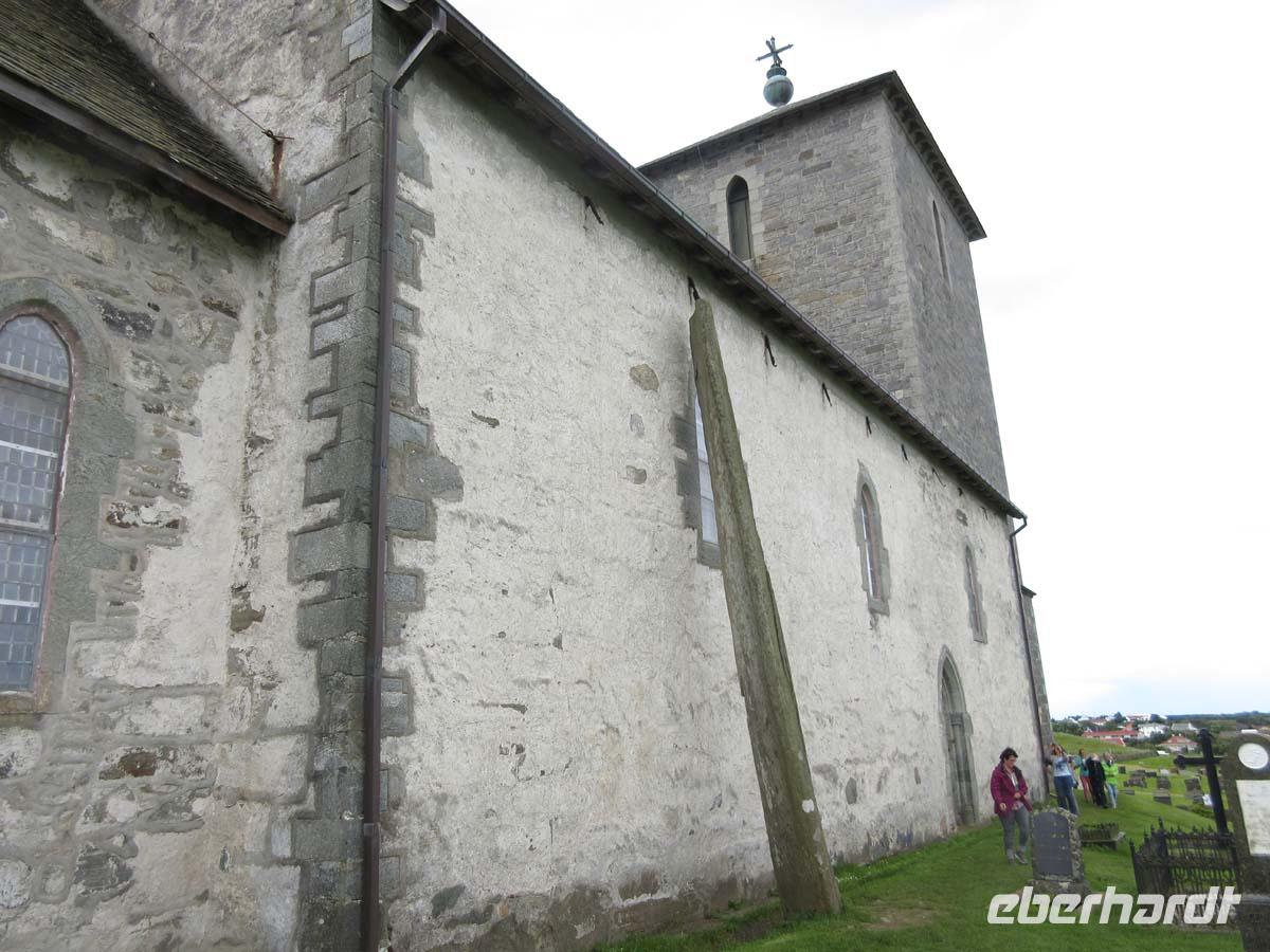 Nach einer Fährfahrt von Halheim nach Sandvik halten wir uns in Haugesund auf. Hier befindet sich das vermeintliche Grab des Reichsgründers Harald Schönhaar, der 972 die südlichen Kleinkönigreiche unterwarf und so die Basis für die mittelalterliche Reichsgründung Norwegens schuf. Der riesige Grabhügel wurde zur 1000 Jahrfeier der Schlacht am Hafrsfjord mit einem großen Obelisken verziert. Drum herum stehen Steine aus allen 29 historischen Provinzen Norwegens. Der Königshof befindet sich nur einige Kilometerweiter in Avaldsnes. Nur die Kirche ist hier noch gut erhalten. Jedoch sind in der Landschaft noch Reste mächtiger Wälle zu erkennen. Neben der Kirche befindet sich ein Bautastein, der sich mit über 7 m Höhe gefährlich nah zur Kirchenwand neigt. Man sagt, dass Norwegen untergeht, wenn er die Kirchenwand berührt. Vielleicht ist deshalb schon ab und zu etwas von seiner Spitze abgeschlagen worden. Scherzhaft wird er auch die Nähnadel Mariens genannt. An Nachmittag erreichen wir wieder Stavanger, wo wir unsere Fluggäste herzlich verabschieden. Nach einem gemeinsamen Abendessen in einem Hotel reisen wir nunmehr mit geringerer Anzahl nach Tananger, wo wir unsere Nachtfähre nach Dänemark besteigen.