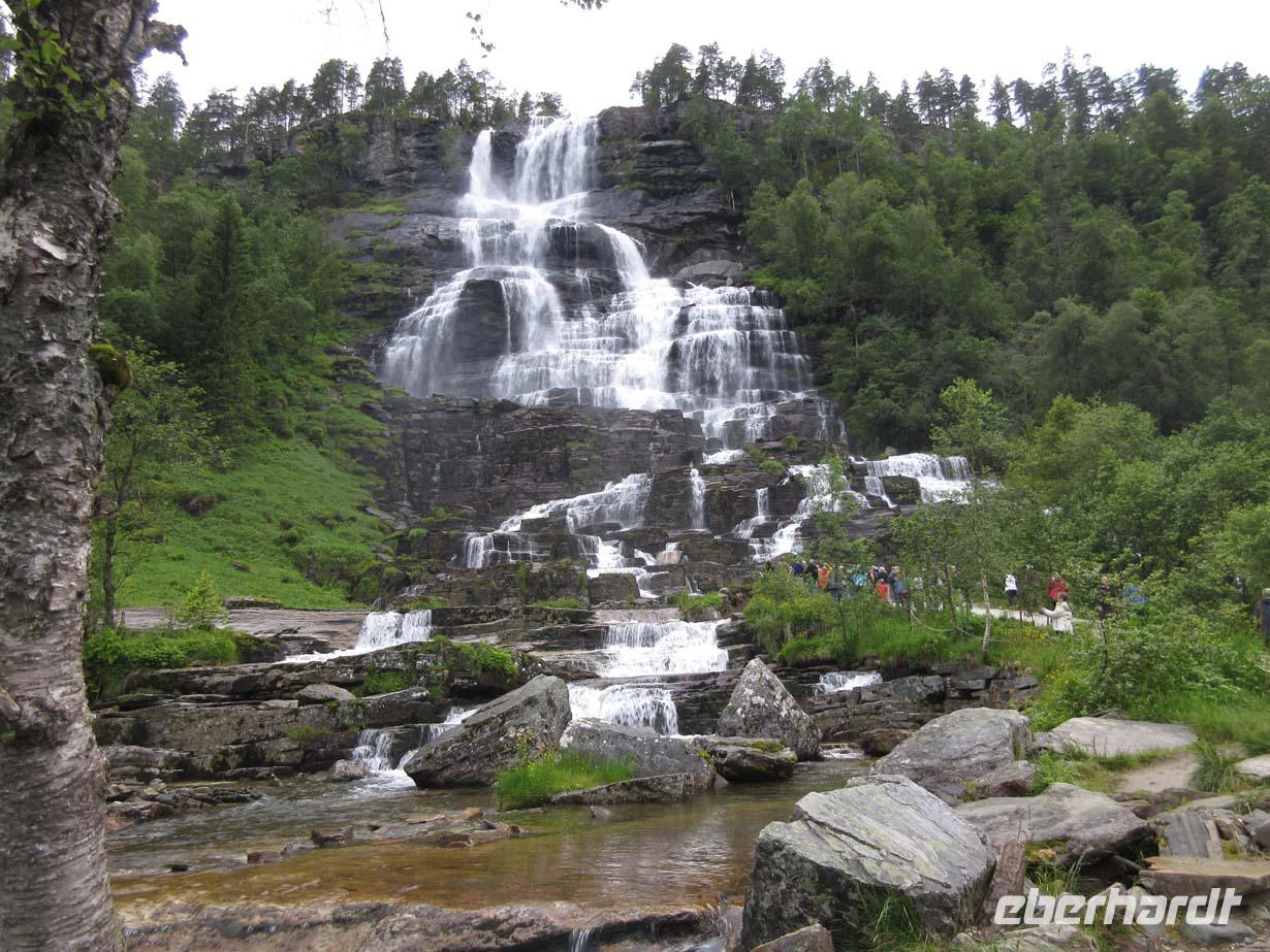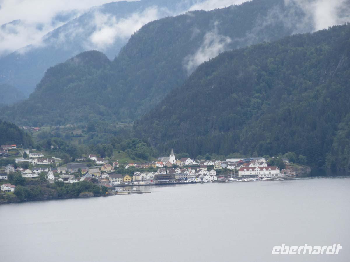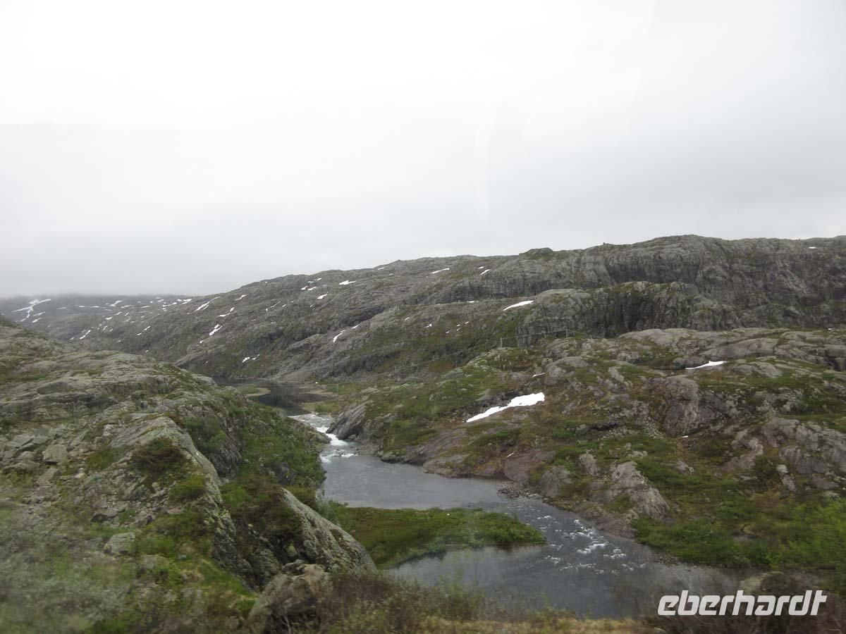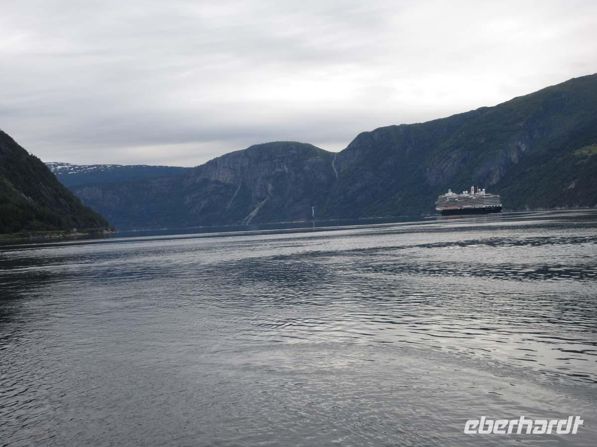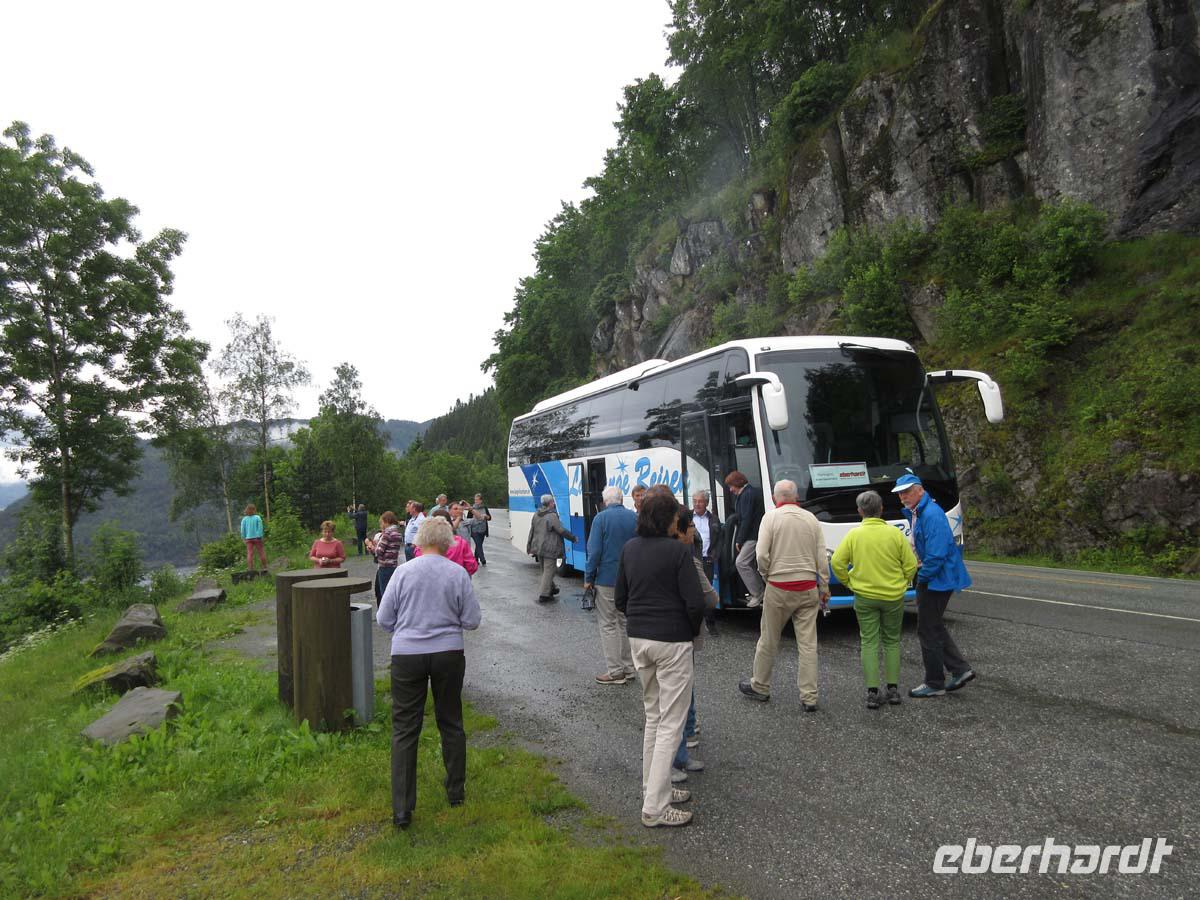 Es gießt Bindfäden. Das hatten wir bisher noch nicht. Und so legen wir den ersten Teil der Strecke inklusive der Fähren Stavanger-Tau und Hjelmeland - Nesvik in einem Stück zurück. Im wesentlichen durchreisen wir heute die Landschaft Ryfylke, die zu den 15 Distrikten von Westnorwegen gehört und deren Ryfylkestrasse zu den „grünen Straßen" Norwegens gehört, touristisch gut erschlossen und landschaftlich wunderschön. Auch beim ersten Stop an der Erfjordbrücke werden alle noch klitschnass. Trocken ist es dann schon am Sandfjord gegenüber von Sand. Hier können wir gleich drei Fjorde erblicken. Den Sand-, den Hyls- und den Saudafjord. Ein paar Minuten weiter erwartet uns dann der mächtige Wasserfall Svandalsfossen. 180 m stürzt er in die Tiefe und nässt die Straße mit seiner mächtigen Gischt ein. Eine Treppe mit über 400 Stufen führt nach oben. Aber sie ist nass und richtig Muße hat auch niemand. Hungrig wie wir sind, legen wir ein Pause in Sauda ein, bevor wir das Saudafjjell, also die Hochebene erklimmen. Hier liegt noch mächtig Schnee und die Temperatur ist entsprechend. Doch an freien Stellen sieht man auch hier recht hübsche Pflanzen, wie z. B. den Pyramidengünsel. Bis zu 978 m sind wir hochgefahren. Auf der Weiterreise machen wir Halt am Latefoss, einem mächtigen Zwillingswasserfall. Neben einem Kiosk mit Imbiss gibt es hier auch Toiletten. Kein Wunder also, dass wir nicht die einzige Reisegruppe sind, welche hier Rast macht. Nach einem weiteren Tankstop erreichen wir die letzte Etappe; unser historisches Hotel in Eidfjord, einer kleinen Ortschaft am gleichnamigen Fjord, dem östlichsten Arm des Hardangerfjords. Kaiser Wilhelm II hat sich hier auch sehr gerne aufgehalten. Der Fjord ist tief genug, dass auch große Kreuzfahrtschiffe bis vor das Hotel fahren können. Aber die sind abends wieder fort und so versinkt die kleine Ortschaft jeden Abend aufs Neue in einen Dornröschenschlaf.