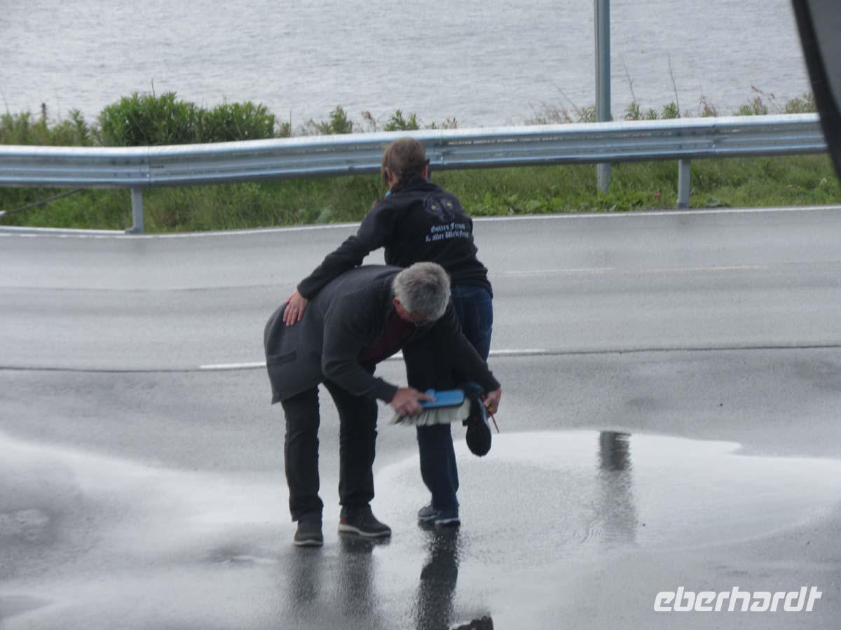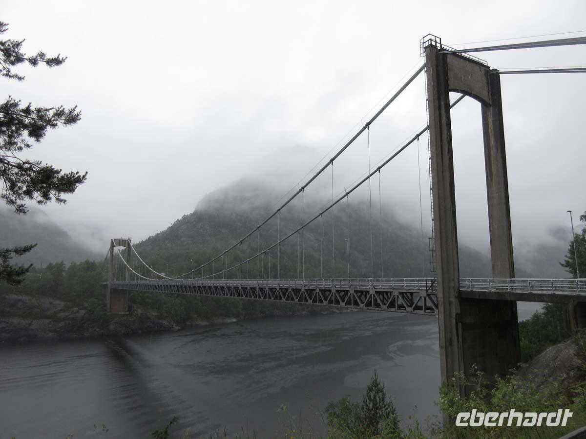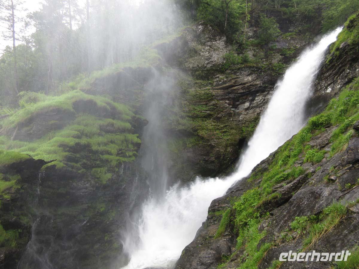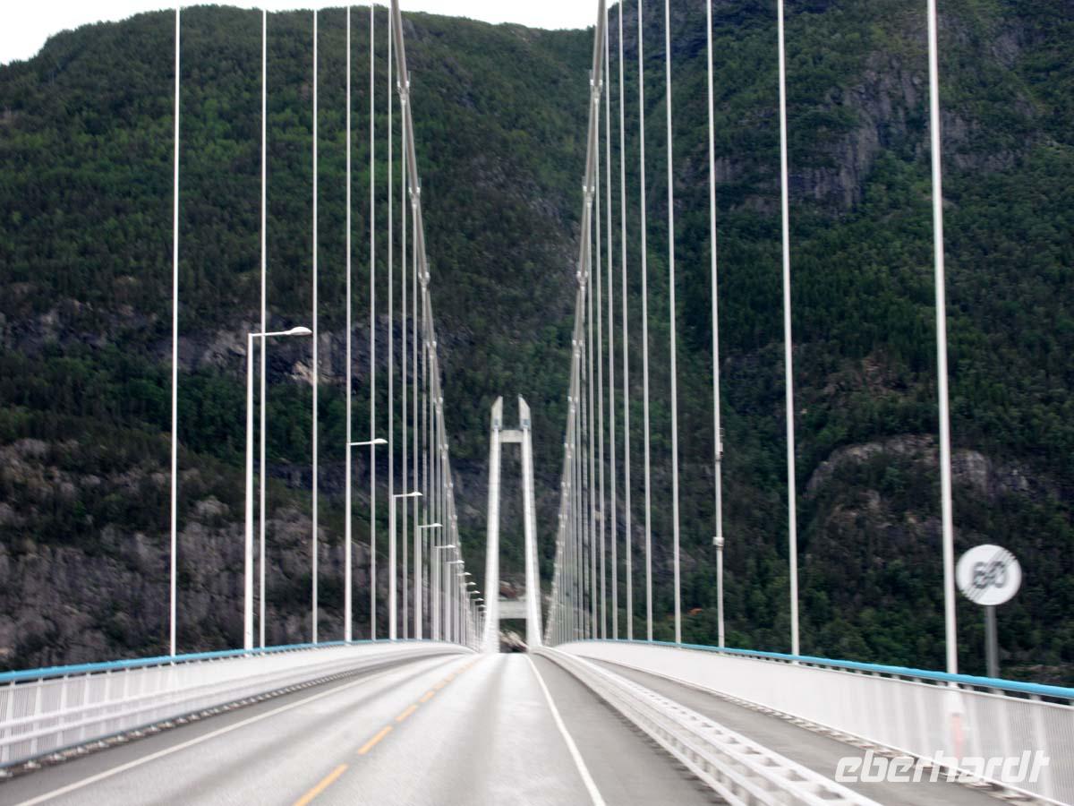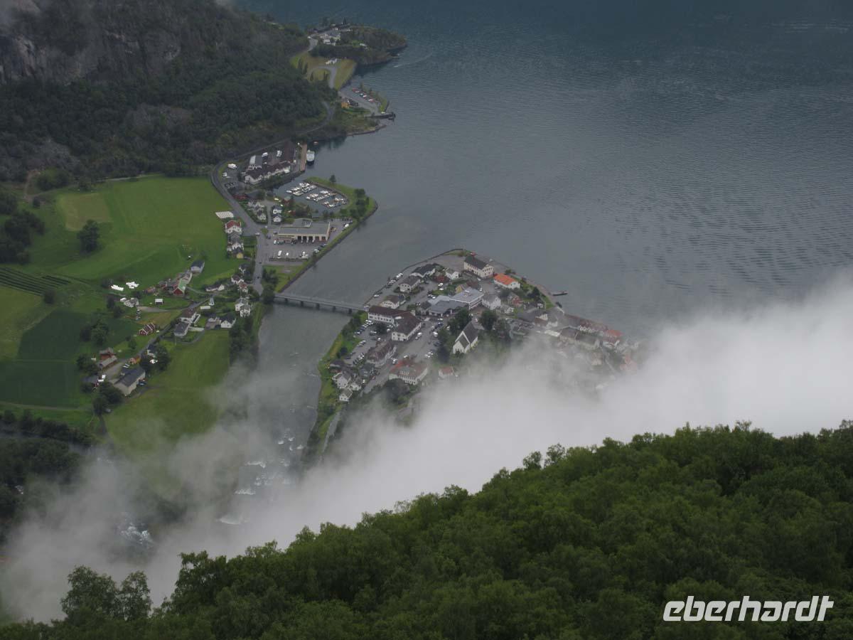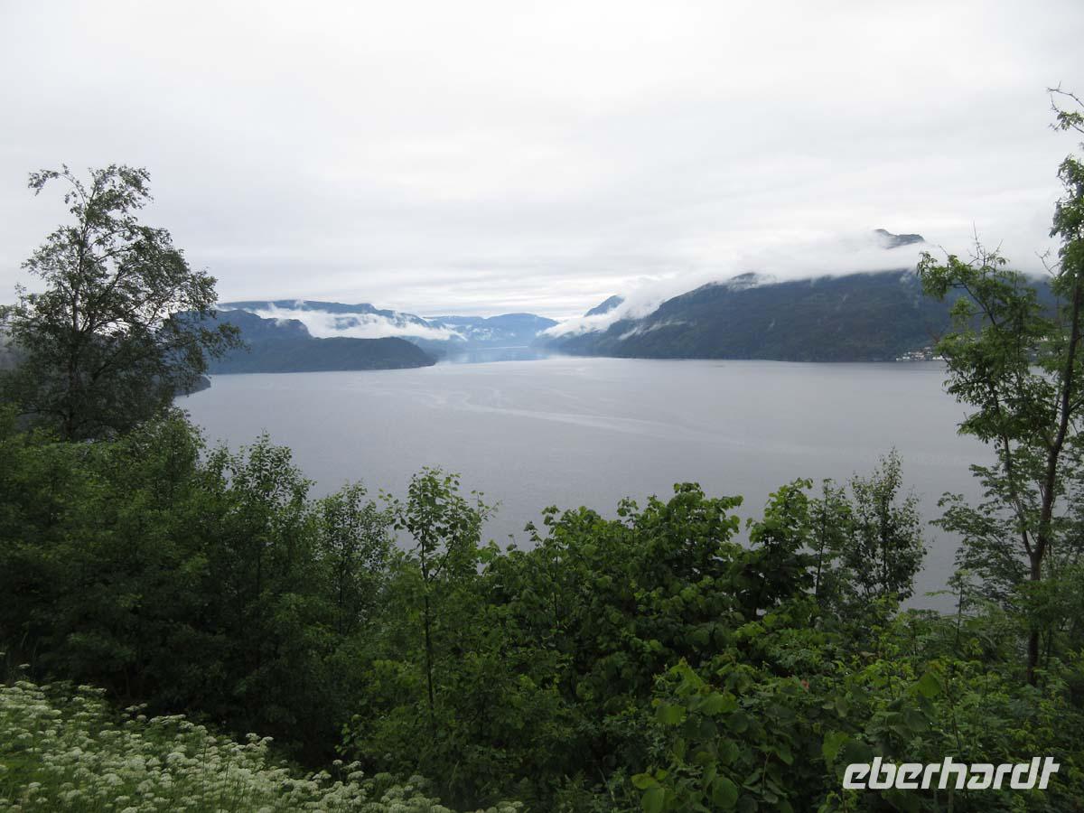 Es gießt Bindfäden. Das hatten wir bisher noch nicht. Und so legen wir den ersten Teil der Strecke inklusive der Fähren Stavanger-Tau und Hjelmeland - Nesvik in einem Stück zurück. Im wesentlichen durchreisen wir heute die Landschaft Ryfylke, die zu den 15 Distrikten von Westnorwegen gehört und deren Ryfylkestrasse zu den „grünen Straßen" Norwegens gehört, touristisch gut erschlossen und landschaftlich wunderschön. Auch beim ersten Stop an der Erfjordbrücke werden alle noch klitschnass. Trocken ist es dann schon am Sandfjord gegenüber von Sand. Hier können wir gleich drei Fjorde erblicken. Den Sand-, den Hyls- und den Saudafjord. Ein paar Minuten weiter erwartet uns dann der mächtige Wasserfall Svandalsfossen. 180 m stürzt er in die Tiefe und nässt die Straße mit seiner mächtigen Gischt ein. Eine Treppe mit über 400 Stufen führt nach oben. Aber sie ist nass und richtig Muße hat auch niemand. Hungrig wie wir sind, legen wir ein Pause in Sauda ein, bevor wir das Saudafjjell, also die Hochebene erklimmen. Hier liegt noch mächtig Schnee und die Temperatur ist entsprechend. Doch an freien Stellen sieht man auch hier recht hübsche Pflanzen, wie z. B. den Pyramidengünsel. Bis zu 978 m sind wir hochgefahren. Auf der Weiterreise machen wir Halt am Latefoss, einem mächtigen Zwillingswasserfall. Neben einem Kiosk mit Imbiss gibt es hier auch Toiletten. Kein Wunder also, dass wir nicht die einzige Reisegruppe sind, welche hier Rast macht. Nach einem weiteren Tankstop erreichen wir die letzte Etappe; unser historisches Hotel in Eidfjord, einer kleinen Ortschaft am gleichnamigen Fjord, dem östlichsten Arm des Hardangerfjords. Kaiser Wilhelm II hat sich hier auch sehr gerne aufgehalten. Der Fjord ist tief genug, dass auch große Kreuzfahrtschiffe bis vor das Hotel fahren können. Aber die sind abends wieder fort und so versinkt die kleine Ortschaft jeden Abend aufs Neue in einen Dornröschenschlaf.