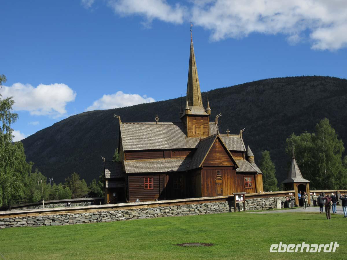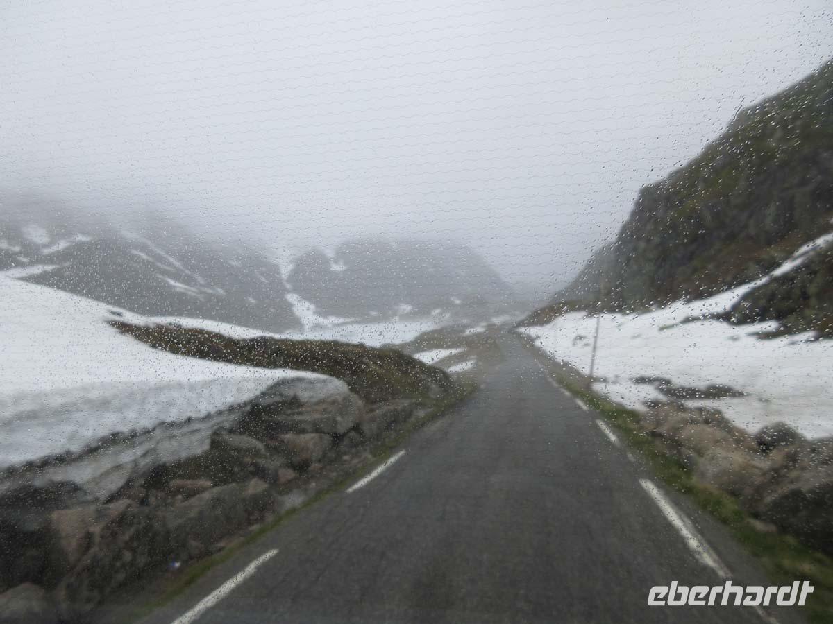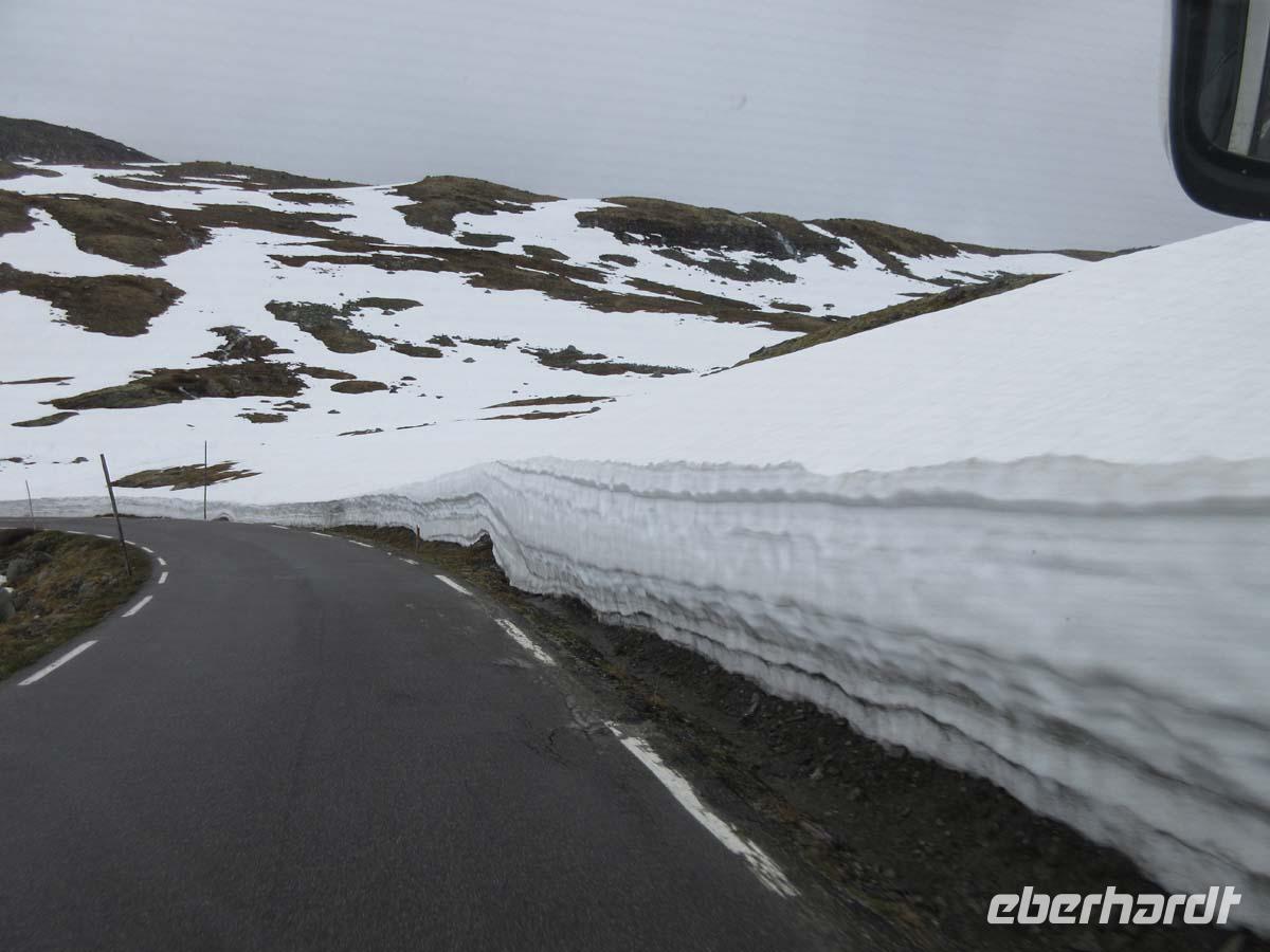 Heute müssen wir pünktlich zu unserer Führung in der Stabkirche in Lom sein, denn schon gegen 11 Uhr ist dort die erste Trauung angesetzt. Das Gotteshaus gehört zu den bliebtesten Attraktionen des Ortes. Sie stammt aus dem 12. Jh. und weißt im Innern sogar zwei Runeninschriften auf. Weiter reisen wir durch schöne Landschaften zu den Donfoss Stromschnellen. Hier ist ein schöner Ort für die Mittagspause. Noch von weitem hört man das tosende Wasser. 1476 m hoch bereisen wir anschließend den Berg Dalsnibba. Über enge Haarnadelkurven schlängelt sich die Straße in die Höhe zum Gipfel, auf dem auch im Juni noch Schnee liegt. Oben gibt es zwar etwas Sonne, aber es schneit zusätzlich. Schnee im Juni hat manch einer noch nicht erlebt. In Norwegen ist das durchaus denkbar.