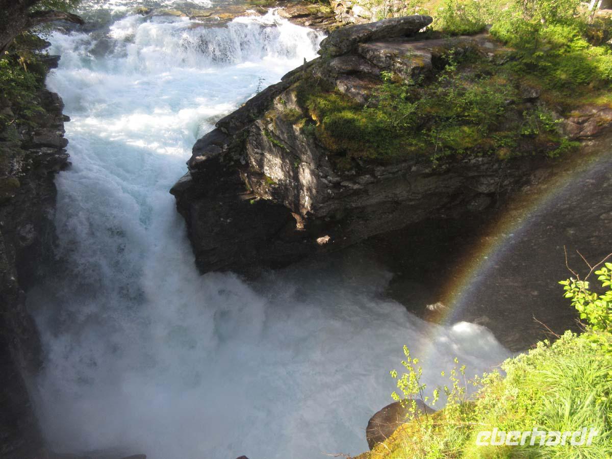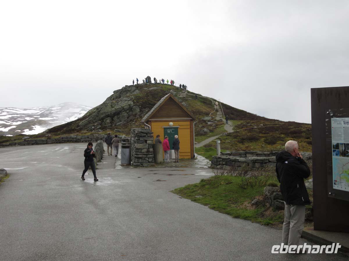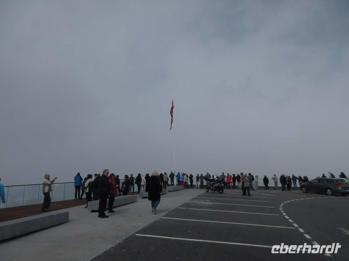 Heute müssen wir pünktlich zu unserer Führung in der Stabkirche in Lom sein, denn schon gegen 11 Uhr ist dort die erste Trauung angesetzt. Das Gotteshaus gehört zu den bliebtesten Attraktionen des Ortes. Sie stammt aus dem 12. Jh. und weißt im Innern sogar zwei Runeninschriften auf. Weiter reisen wir durch schöne Landschaften zu den Donfoss Stromschnellen. Hier ist ein schöner Ort für die Mittagspause. Noch von weitem hört man das tosende Wasser. 1476 m hoch bereisen wir anschließend den Berg Dalsnibba. Über enge Haarnadelkurven schlängelt sich die Straße in die Höhe zum Gipfel, auf dem auch im Juni noch Schnee liegt. Oben gibt es zwar etwas Sonne, aber es schneit zusätzlich. Schnee im Juni hat manch einer noch nicht erlebt. In Norwegen ist das durchaus denkbar.