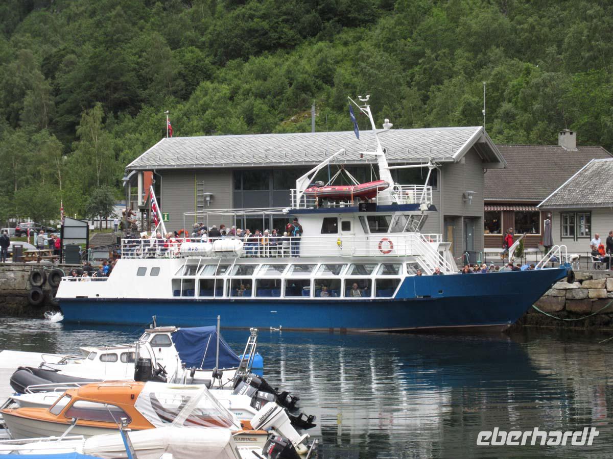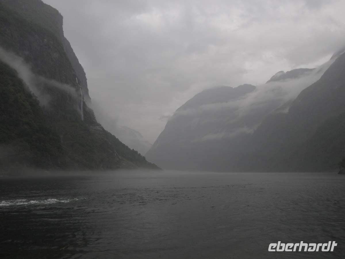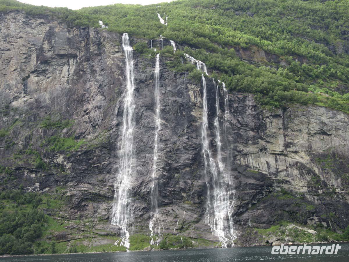 Schemenhaft kann man in der Tiefe schon den Geirangerfjord erkennen. Dorthin begeben wir uns nach unsrem Gipfelsturm und besteigen gleich das schon auf uns wartende Schiff, welches uns auf eine Fahrt über den Fjord bringen wird. Dieser gehört zum Unesco Welterbe, nicht zuletzt wegen seiner Schönheit. Weltberühmt sind auch die Wasserfälle der 7 Schwestern und des gegenüber liegenden Freiers. Unser Hotel liegt direkt am Fjord, in den auch große Kreuzfahrtschiffe fahren können. Hier erwartet uns ein riesiges Abendbueffet.