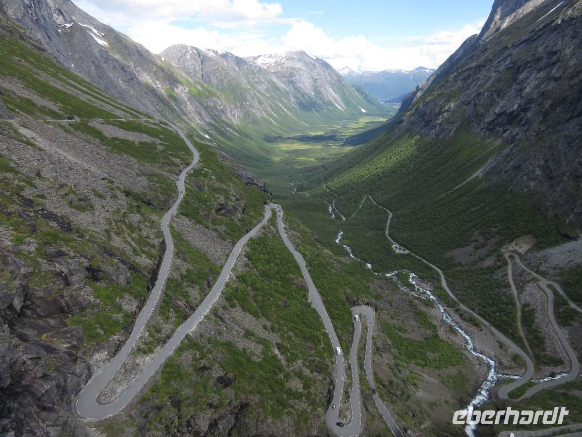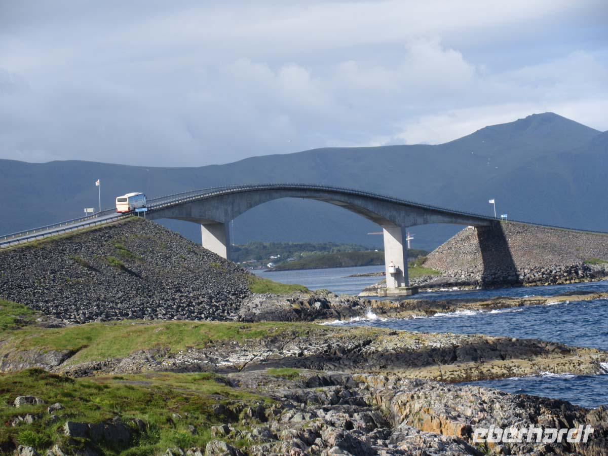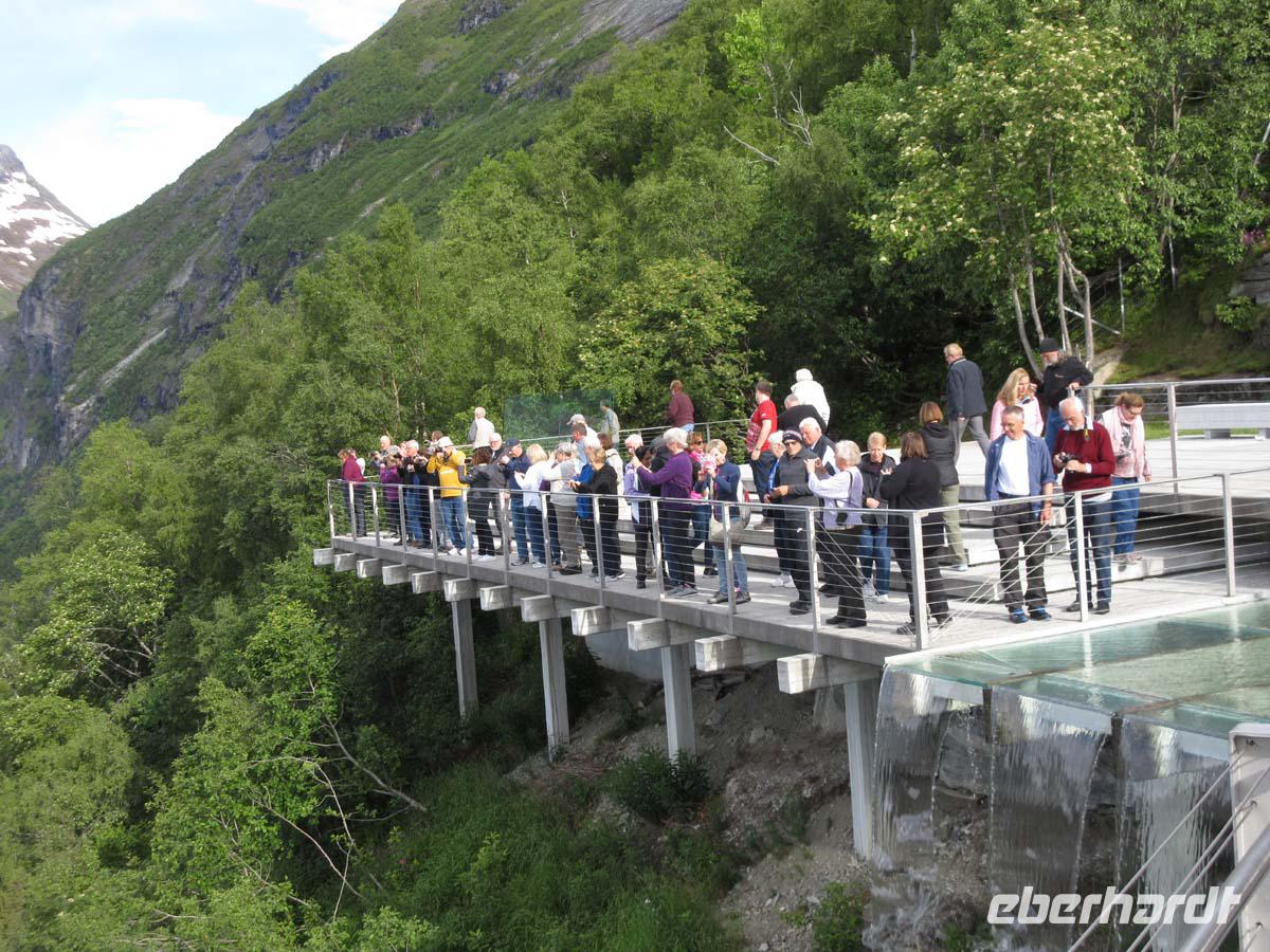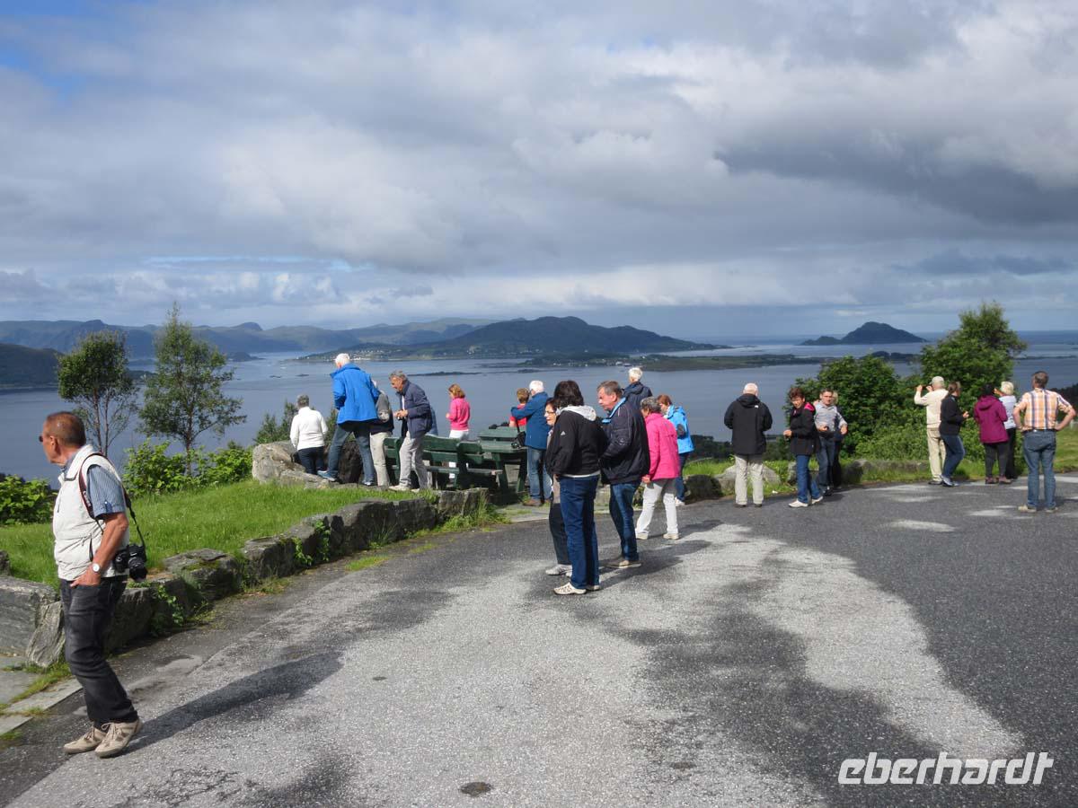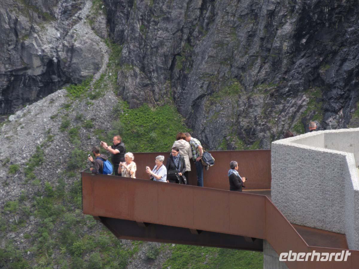 Gleich nach unserer Abfahrt stoppen wir an der Adlerstraße. Vom Aussichtspunkt Oernesvingen hat man einen phantastischen Blick auf den Fjord nach allen Seiten. Vor dem Bau der Strasse nisteten hier tatsächlich Steinadler. Aber jene haben es nach dem Straßenbau vorgezogen, woanders zu brüten. Der Name bllieb jedoch und erinnert an diese gewaltigen Vögel. Wasser satt gibt es für uns auch am Grudbrandsjuvet. Es ist eine Klamm, deren Strudel sich bis 25 m tief in den Felsen eingeschliffen haben. Das Wasser ist noch einmal so tief! Höhepunkt ist jedoch der Besuch des Trollstigen.Von der dortigen Aussichtsplattform blicken wir von einer Höhe bis zu 850 m in die Landschaft und sehen die vielen engen Kurven, die wir demnächst hinabfahren werden. Klar, dass wir auch unten noch einmal einen Stop machen um zu bestaunen, welche Strecke wir gerade bewältigt haben, mit Gefälle bis zu 12 %. Ein Lob an unseren Buschauffuer Jürgen! Unser Mittag nehmen wir unterhalb der Trollwand ein. Bis zu 1000 m erstreckt sich diese höchste Steilwand Europas teilweise senkrecht nach oben. Von Seilschaften ist sie an einem Tag nicht mehr zu bewältigen und diese müssen in der Wand übernachten. An jene, die es nicht geschafft haben, erinnert ein Denkmal auf dem Parkplatz. Die Spitzen der Wand stellen übrigens die Mützen jener Trolle dar, die von einer Hochzeit zu spät nach Hause gingen und von der Sonne getroffen zu Stein erstarrten. An der gewaltigen Gjemnesundbrücke gibt es eine Verkostung von Moltebeermarmelade, aus der teuersten Beere der Welt. Nach dieser Süßspeise muss man in Deutschland lange suchen und bezahlt dann richtig viel Geld. In Norwegen ist sie für umgerechnet "läppische 7 Euro" zu haben. Aber bitte NICHT an touristischen Hotspots kaufen! Am Trollstigen kosten 125 Gramm Moltebeermarmelade umgerechnet 19,95 Euro. Japaner greifen hier beherzt zu. Im coop oder KIWI-niedrigpris bekommt man dieselbe Qualität für 6,70 Euro für 540 Gramm. Dort kauft sie auch "Otto-Normal-Norweger". Als Eberhardt-Reiseleiter weist man seine Gäste selbstverständlich darauf hin, um sie vor finanzieller Übervorteilung zu bewahren. Am späten Nachmittag erreichen wir Kristiansund. Der Name sagt schon dass sie von dem Dänenkönig Kristian (IV) gegründet wurde. Reich wurde sie durch den Klippfisch, der bis in den Mittelmeerraum exportiert wurde und z. B. in Portugal unter dem Namen Bacalao bekannt ist. Das Salzen und Trocknen war reine Frauenarbeit und so hat man diesen im Zentrum der Stadt ein Denkmal gesetzt: Die Klippfischfrau. Unser Hotel liegt direkt am Wasser und fast alle Zimmer haben direkten Blick darauf. Es sind modern umgestaltete alten Hafenspeicher. Hier lässt es sich gut wohnen und vor allem das gute Abendessen genießen.