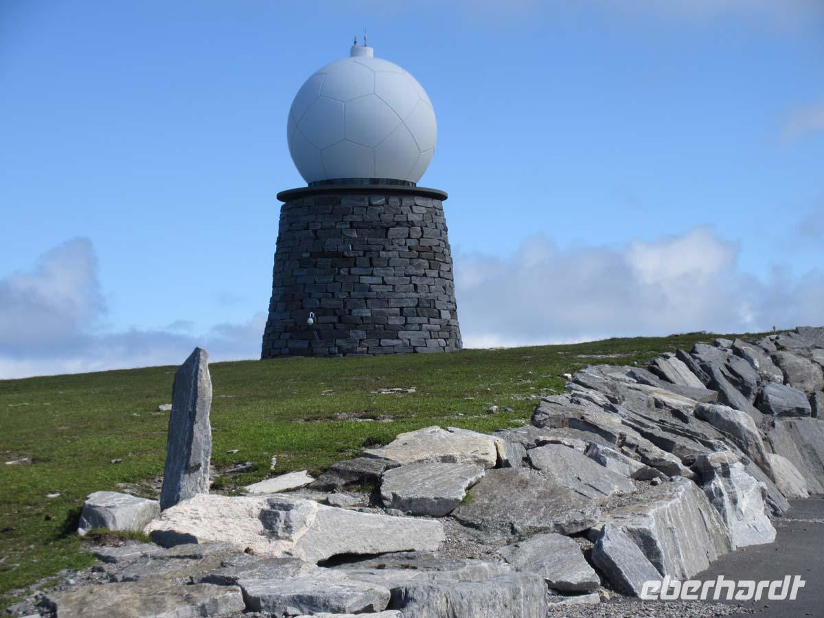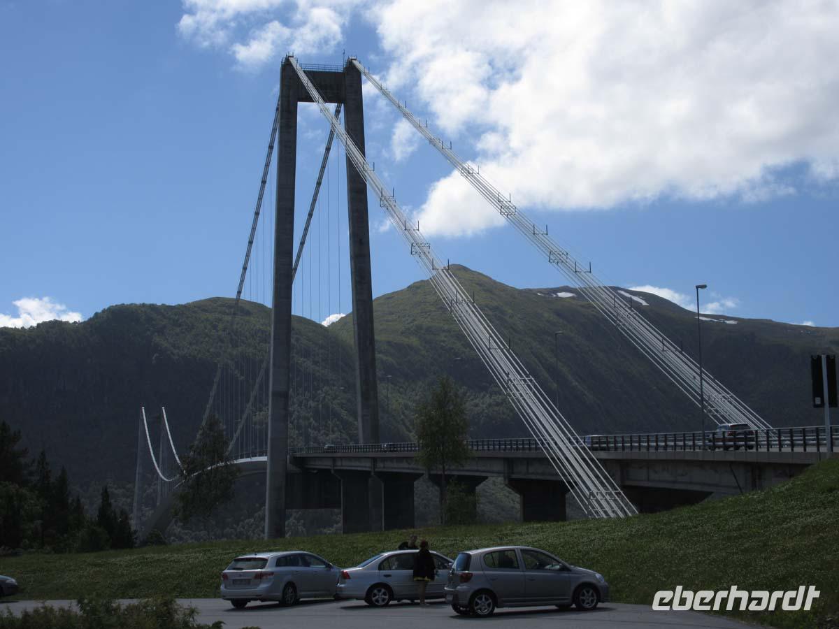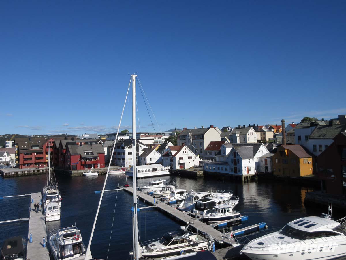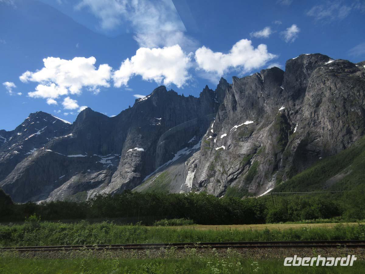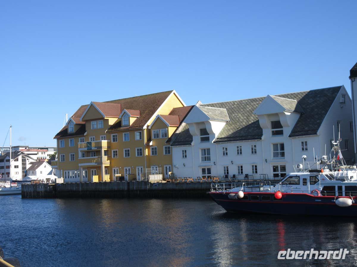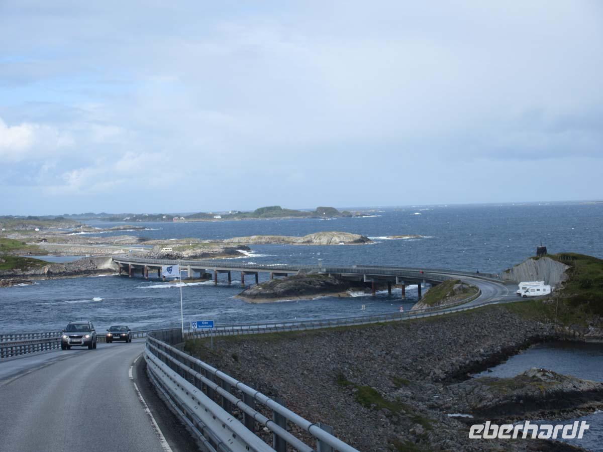 Gleich nach unserer Abfahrt stoppen wir an der Adlerstraße. Vom Aussichtspunkt Oernesvingen hat man einen phantastischen Blick auf den Fjord nach allen Seiten. Vor dem Bau der Strasse nisteten hier tatsächlich Steinadler. Aber jene haben es nach dem Straßenbau vorgezogen, woanders zu brüten. Der Name bllieb jedoch und erinnert an diese gewaltigen Vögel. Wasser satt gibt es für uns auch am Grudbrandsjuvet. Es ist eine Klamm, deren Strudel sich bis 25 m tief in den Felsen eingeschliffen haben. Das Wasser ist noch einmal so tief! Höhepunkt ist jedoch der Besuch des Trollstigen.Von der dortigen Aussichtsplattform blicken wir von einer Höhe bis zu 850 m in die Landschaft und sehen die vielen engen Kurven, die wir demnächst hinabfahren werden. Klar, dass wir auch unten noch einmal einen Stop machen um zu bestaunen, welche Strecke wir gerade bewältigt haben, mit Gefälle bis zu 12 %. Ein Lob an unseren Buschauffuer Jürgen! Unser Mittag nehmen wir unterhalb der Trollwand ein. Bis zu 1000 m erstreckt sich diese höchste Steilwand Europas teilweise senkrecht nach oben. Von Seilschaften ist sie an einem Tag nicht mehr zu bewältigen und diese müssen in der Wand übernachten. An jene, die es nicht geschafft haben, erinnert ein Denkmal auf dem Parkplatz. Die Spitzen der Wand stellen übrigens die Mützen jener Trolle dar, die von einer Hochzeit zu spät nach Hause gingen und von der Sonne getroffen zu Stein erstarrten. An der gewaltigen Gjemnesundbrücke gibt es eine Verkostung von Moltebeermarmelade, aus der teuersten Beere der Welt. Nach dieser Süßspeise muss man in Deutschland lange suchen und bezahlt dann richtig viel Geld. In Norwegen ist sie für umgerechnet "läppische 7 Euro" zu haben. Aber bitte NICHT an touristischen Hotspots kaufen! Am Trollstigen kosten 125 Gramm Moltebeermarmelade umgerechnet 19,95 Euro. Japaner greifen hier beherzt zu. Im coop oder KIWI-niedrigpris bekommt man dieselbe Qualität für 6,70 Euro für 540 Gramm. Dort kauft sie auch "Otto-Normal-Norweger". Als Eberhardt-Reiseleiter weist man seine Gäste selbstverständlich darauf hin, um sie vor finanzieller Übervorteilung zu bewahren. Am späten Nachmittag erreichen wir Kristiansund. Der Name sagt schon dass sie von dem Dänenkönig Kristian (IV) gegründet wurde. Reich wurde sie durch den Klippfisch, der bis in den Mittelmeerraum exportiert wurde und z. B. in Portugal unter dem Namen Bacalao bekannt ist. Das Salzen und Trocknen war reine Frauenarbeit und so hat man diesen im Zentrum der Stadt ein Denkmal gesetzt: Die Klippfischfrau. Unser Hotel liegt direkt am Wasser und fast alle Zimmer haben direkten Blick darauf. Es sind modern umgestaltete alten Hafenspeicher. Hier lässt es sich gut wohnen und vor allem das gute Abendessen genießen.