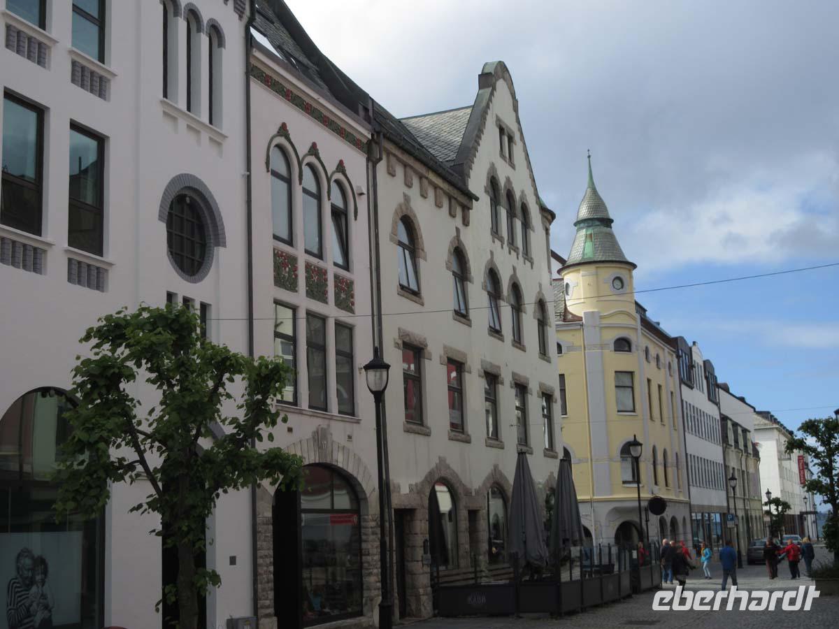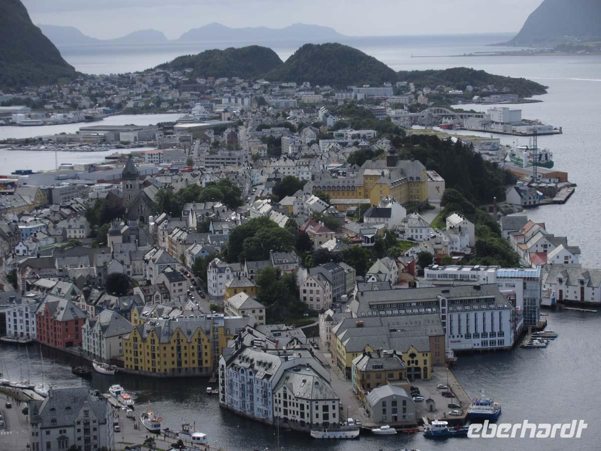 Die Atlantikstraße war eigentlich als Bahnlinie geplant. Im Grunde bezeichnet sie einen knapp 9 km langen Weg mit mehr als 8 Brücken durch Schären und kleine Inselchen. Mitunter weiß man nicht, wo das Land beginnt und das Meer endet. Stops legen wir auf den Inseln Haholmen und Eidhysöya ein mit Blick auf die Storseisundbrücke. Über das Fischerdorf Bud führt uns unser Weg in die Rosenstadt Molde. Hier ist es noch so mild, dass diese Pflanzen hier gedeihen, wie auch Kastanien und Erlen. Ein Blick ringsum in die Berge zeigt, dass dort oben die Sicht gleich Null ist, und so verzichten wir auf den beschwerlichen Waldweg hoch zum Hausberg Varden, der zudem nur in Teilen asphaltiert ist. Das lohnt aus Erfahrung nur bei guter Sicht und ich weiß aus Erfahrung, dass wir die z. T. nur als Waldweg im Schlamm gestaltete Auffahrt hinunter mehr rutschen als fahren würden. Molde ist quirlig und es lässt sich in der ausgedehnten Innenstadt prima bummeln. Irgendwie besticht es, dass wir plötzlich in einer stark belebten Statd sind. Das hatten wir ja schon lange nicht mehr. Bevor wir zum Abschluß des Tages nach Alesund hinein fahren erklimmen wir per Bus erst einmal dessen Hausberg, den Aksla. Von hier kann man die gesamte Stadt hervorragend überblicken und gleich schauen, wohin man am Abend noch gehen möchte. Alesund ist die Stadt des Jugendstils. Nach einem verheerenden Brand leistete Kaiser Wilhelm II, der sich sehr gerne dort aufhielt eine Menge Wiederaufbauhilfe finanzieller und praktischer Art. Eine Straße in der Stadt ist nach wie vor nach ihm benannt und in der Stadtkirche prangt in einem Fenster das preußische Wappen. Wir beziehen unser Hotel im Zentrum. Vor und nach dem Abendessen ziehen es alle vor, individuell die Stadt zu erkunden und kommen zu unterschiedlichsten Zeiten wieder zum Hotel.