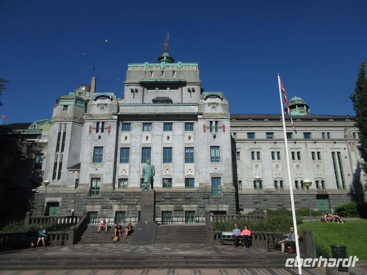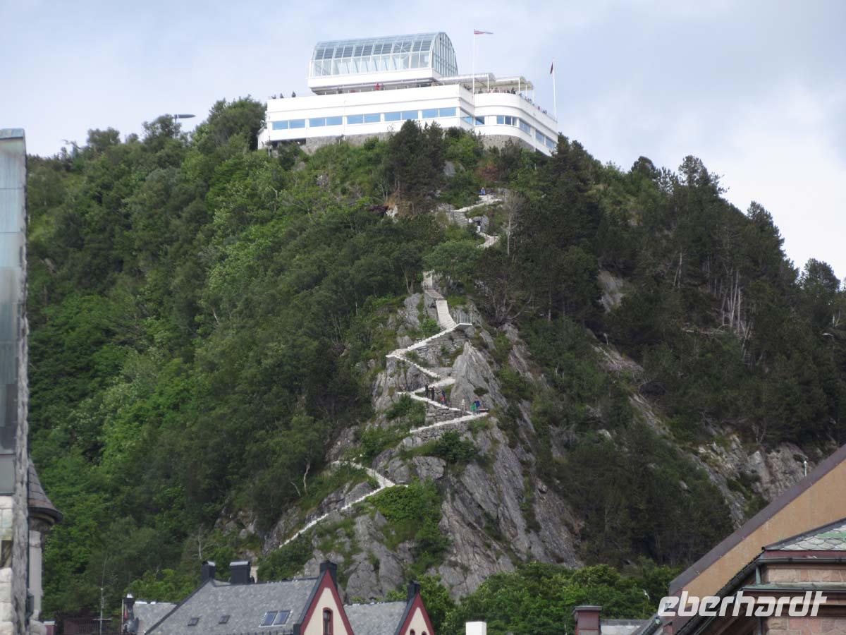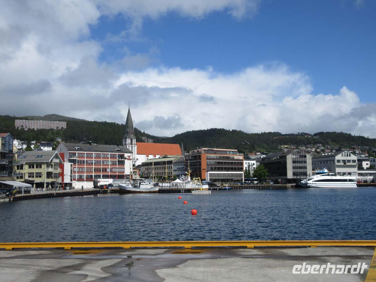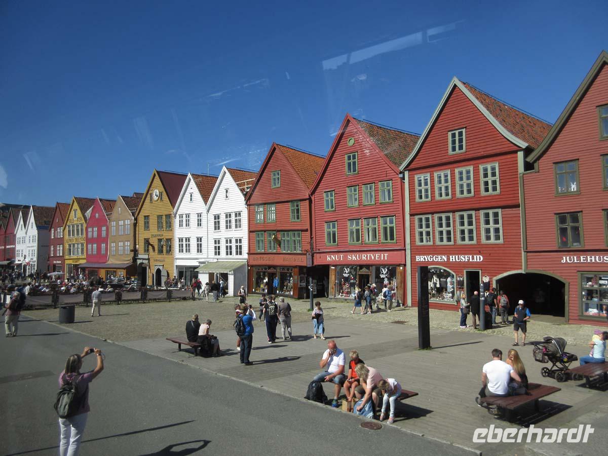 Der Hurtigrutenkai liegt nur 5 Gehminuten vom Hotel entfernt. 1893 wurde die Hurtigrutenlinie von Richard With gegründet und stellte bis in die 70er Jahre die einzige Verbindung von vielen Ortschaften im Norden zu Außenwelt dar. Mit neuen Straßen und Flugverkehr sanken die Passagierzahlen und man besann sich mehr und mehr auf Touristen, die mittlerweile das Groß der Passagiere ausmachen. Auch die letzten Poststationen an Bord wurden 1984 geschlossen. Man reist schon sehr entspannt und bequem an Bord. Schnell sind von uns gute Liegestühle auf dem Sonnendeck in Beschlag genommen, denn die Kabinenpassagiere sind noch beim Frühstück. Erst danach wird es voller. Bei vollem Sonnenschein steuern wir knapp 7 Stunden lang durch eine abwechslungsreiche Schären- und Fjordlandschaft auf Bergen zu. In der alten Hauptstadt angekommen, beginnen wir nach einer kurzen Weile die Stadtrundfahrt. Kreuz und quer durchreisen wir mit unserer Gästeführerin Andrea die Stadt und stoppen sowohl am Wohnhaus des Königs, wie auch am Hafen. Wir sehen die alten und neuen Häuser, die neue Kirche, den Dom, den Fischmarkt, den Eingang zur Flöyenbahn und enden an der Tysken Brygge, dem alten Hansekontor, das auf der Unesco Welterbeliste steht. Dahinter befindet sich die Marienkirche, die älteste Kirche der Stadt und gleichzeitig jene der deutschen Kaufleute. Nach dem Bezug unseres Hotels gibt es nach dem Abendessen noch Gelegenheit, mit der Bahn auf den Hausberg Bergens, den Flöyen zu fahren. Von hier aus hat man eine phantastische Sicht über die gesamte Stadt.