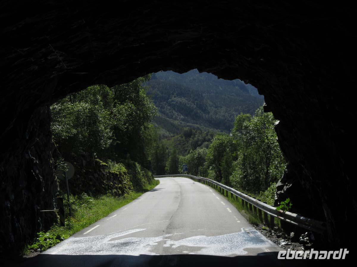 Ein erster Stop an der Hardangerbrücke ist Pflicht. Die größte Brücke Norwegens und die zehntlängste Hängebrücke der Welt besticht durch ihre über 202 m hohen Pylone. Erreichen kann man sie nur durch einen Tunnel, in welchem sich die Reichsstraße 16 mit einer weiteren in einem futuristisch lila angestrahlten Kreisel unter Tage trifft. Am Tvinnefossen gleich der nächste Halt. Es geht die Mähr, dass sein Wasser gut gegen Potenzstörungen sei. Gerade Besucher aus Japan und Russland sollen sich gerne Flaschen mit diesem Nass abfüllen. Plötzlich ist er wieder da. Dieser Starkregen, den niemand von uns bestellt hat. Er hält an bis zu unseren Stopps in Gudvangen und Flam, wo gar niemand mehr aus dem Bus steigen möchte. Also reisen wir weiter nach Auerlandsvangen am Naeroyfjord. Einmal falsch abgebogen erreichen wir einen Aussichtspunkt mit Blick auf den Vassbygdevatnet, einem schwarzblau schimmernden See. Hier machen wir erst einmal Mittag bevor wir dann den Aussichtspunkt Stegasteinen über engste Haarnadelkurven erreichen. Tatsächlich ist die Sicht von hier oben spektakulär. Alle freuen sich. Nur nicht unser Chauffeur, denn der muss die Kurven wieder hinab, weil die Fahrt für Busse unserer Länge seit diesem Jahr auf der weiterführenden Schneestraße verboten ist. Nach einem schweren Unfall hat die norwegische Regierung sehr schnell und überraschend die Reißleine gezogen. Im noch recht verschneiten Sognefjell mit seiner kargen, nur von Steinen, Moosen und Flechten überzogenen Landschaft biegen wir ab ins Leirdalen. Hier führt eine schmale Piste zu unserem urtümlichen Hotel direkt unter dem Massiv des Galdhöppigen, dem höchsten Berg Skandinaviens. Urwüchsige Natur pur umfängt uns. Sämtliche Zivilisationsgeräusche sind verschwunden. Nur die Geräusche von Wind und rauschendem Wasser hört man des Nachts. Ein Erlebnis, das recht selten geworden ist.