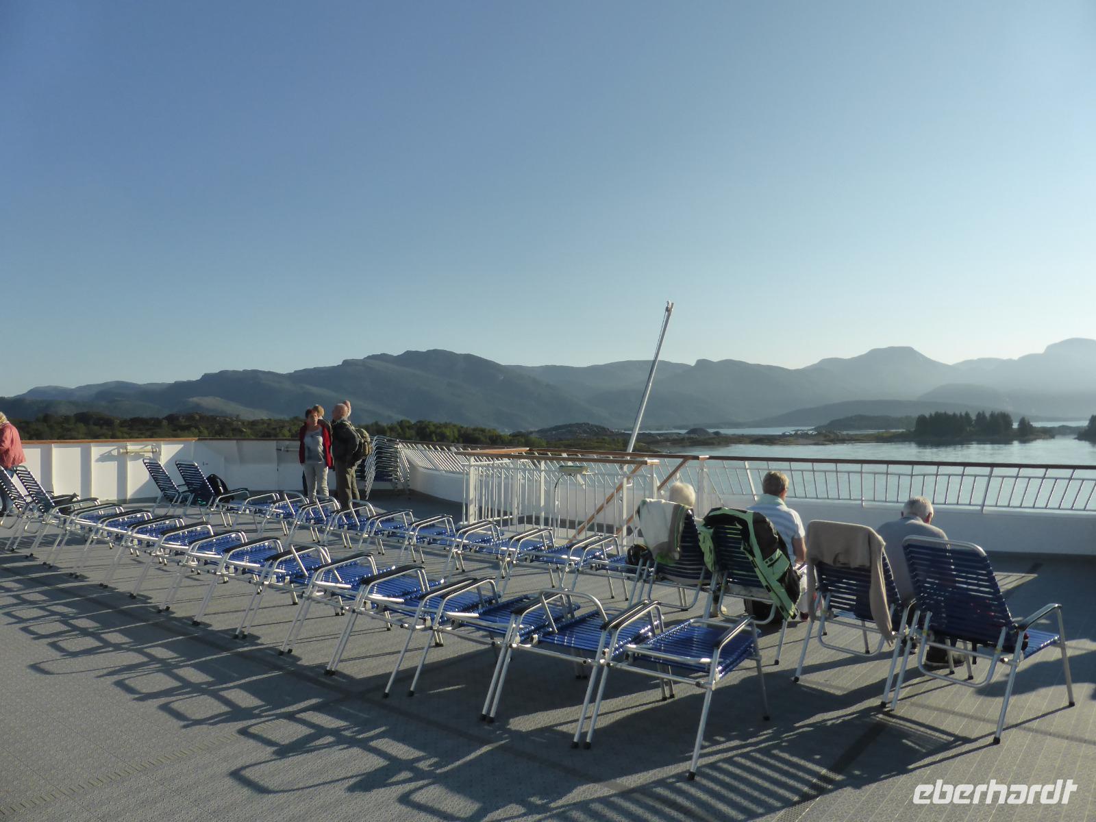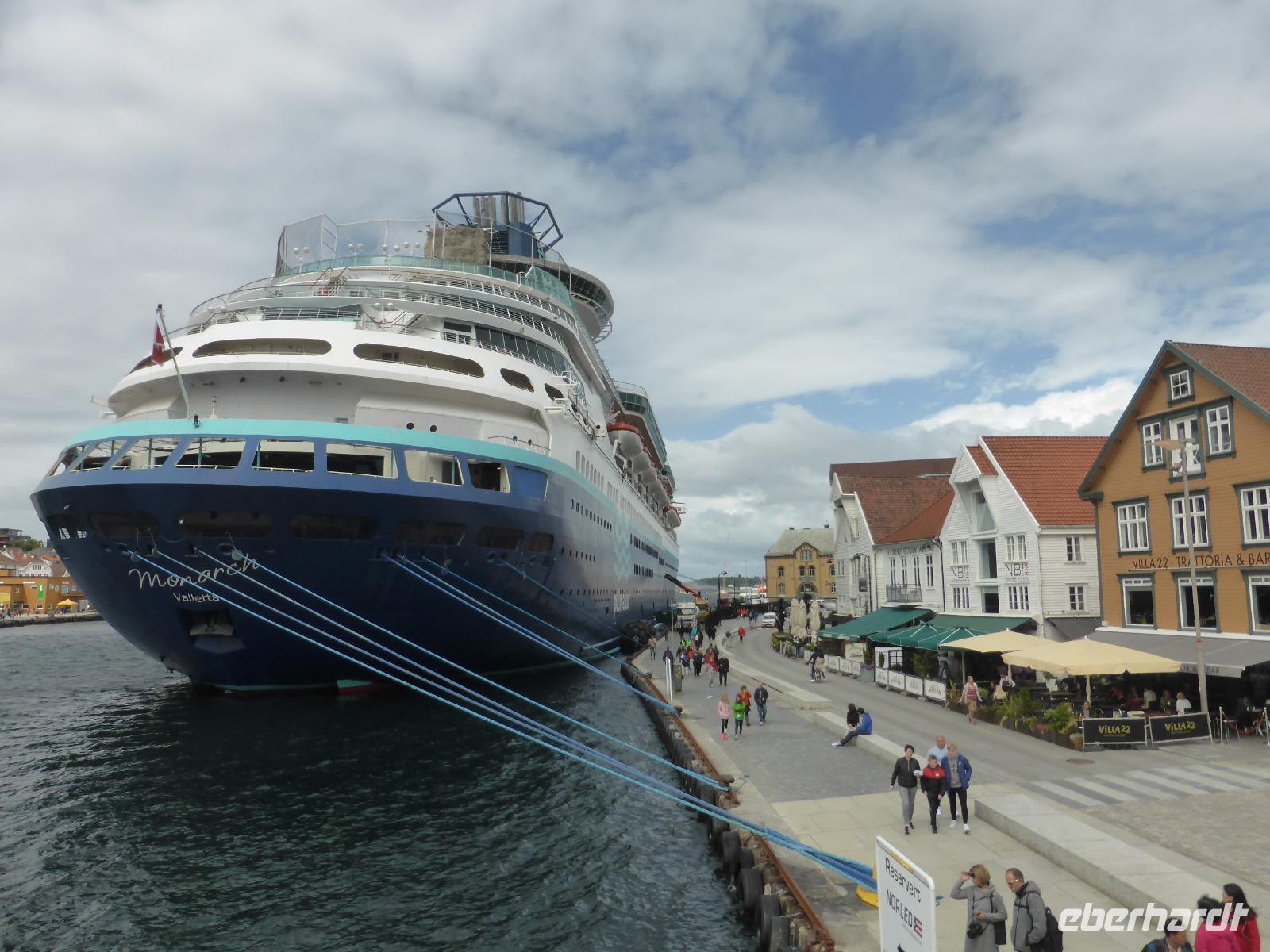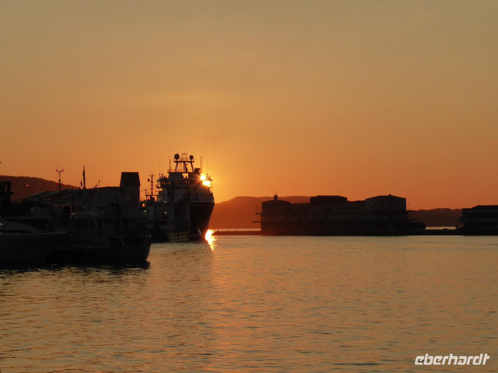 Gegen 16.30 Uhr kamen wir in Stavanger an und wurden im „Thon-Hotel Maritim" zum letzten gemeinsamen Abendessen erwartet. Danach verabschiedeten wir unsere Fluggäste. Sie blieben im Hotel und flogen am nächsten Tag von Stavanger nach Deutschland zurück. Alle anderen Gäste fuhren mit dem Bus zum Fährterminal in Tananger. Nach der Abholung und Ausgabe der Kabinenschlüssel ging es sofort an Bord. Kurz vor 21.00 Uhr legte das Schiff in Richtung Dänemark ab.