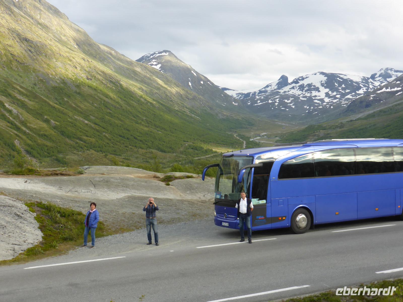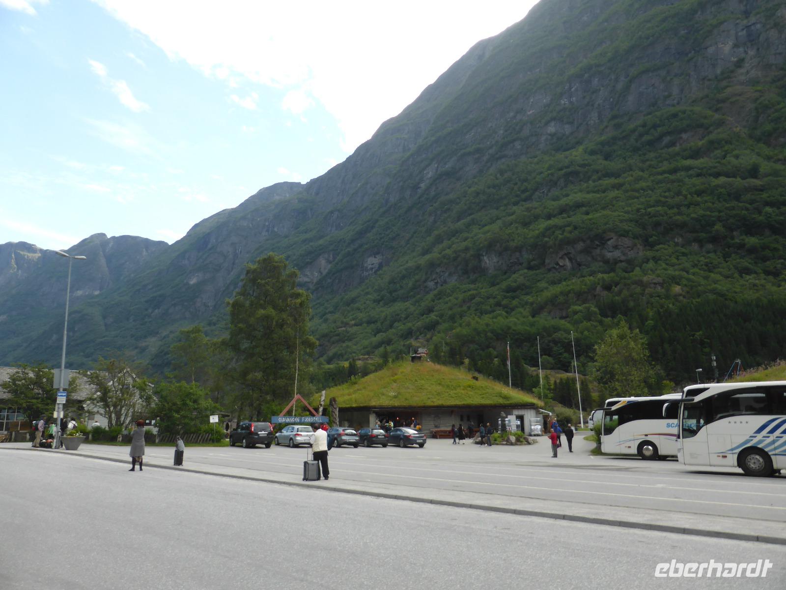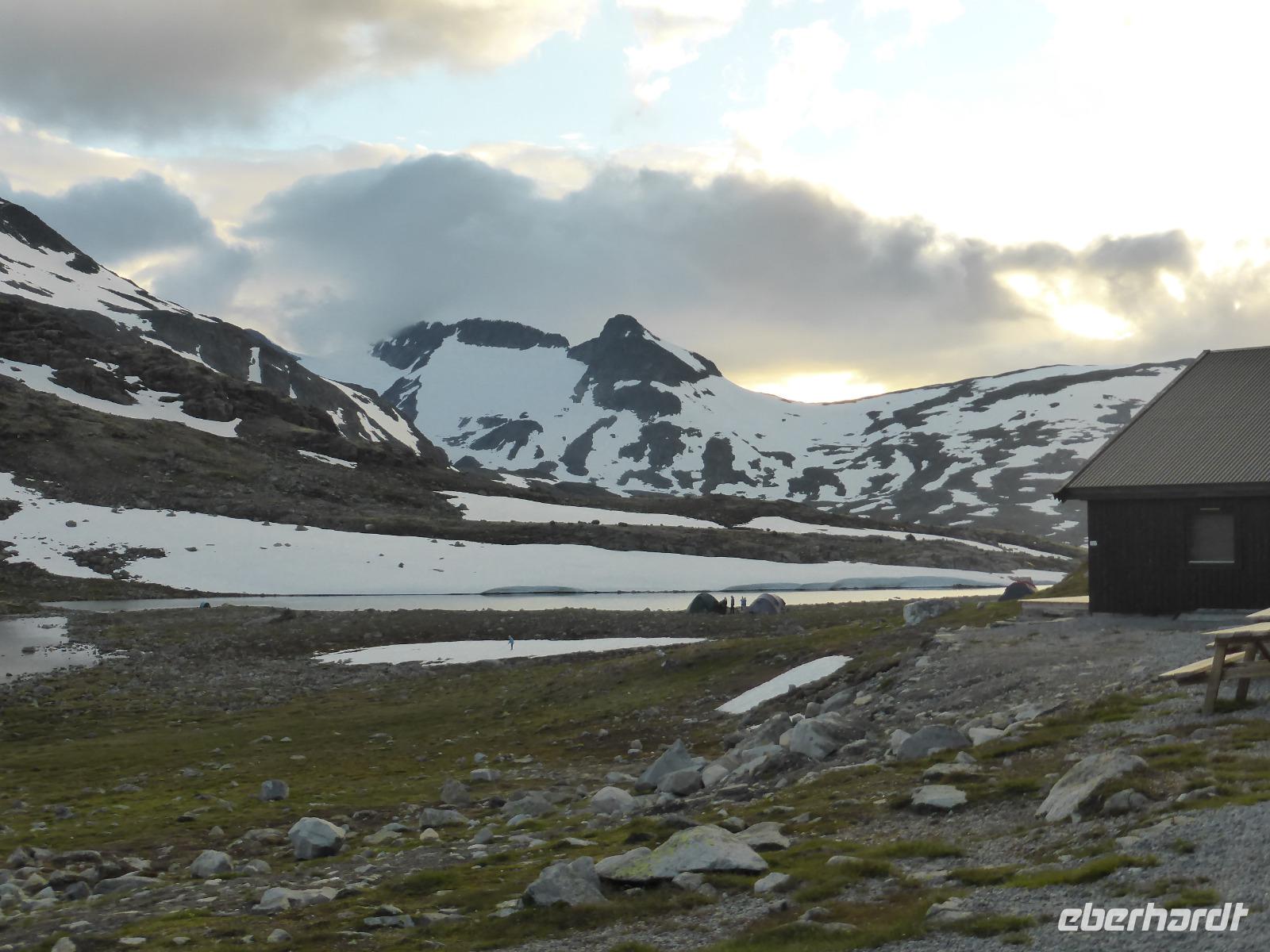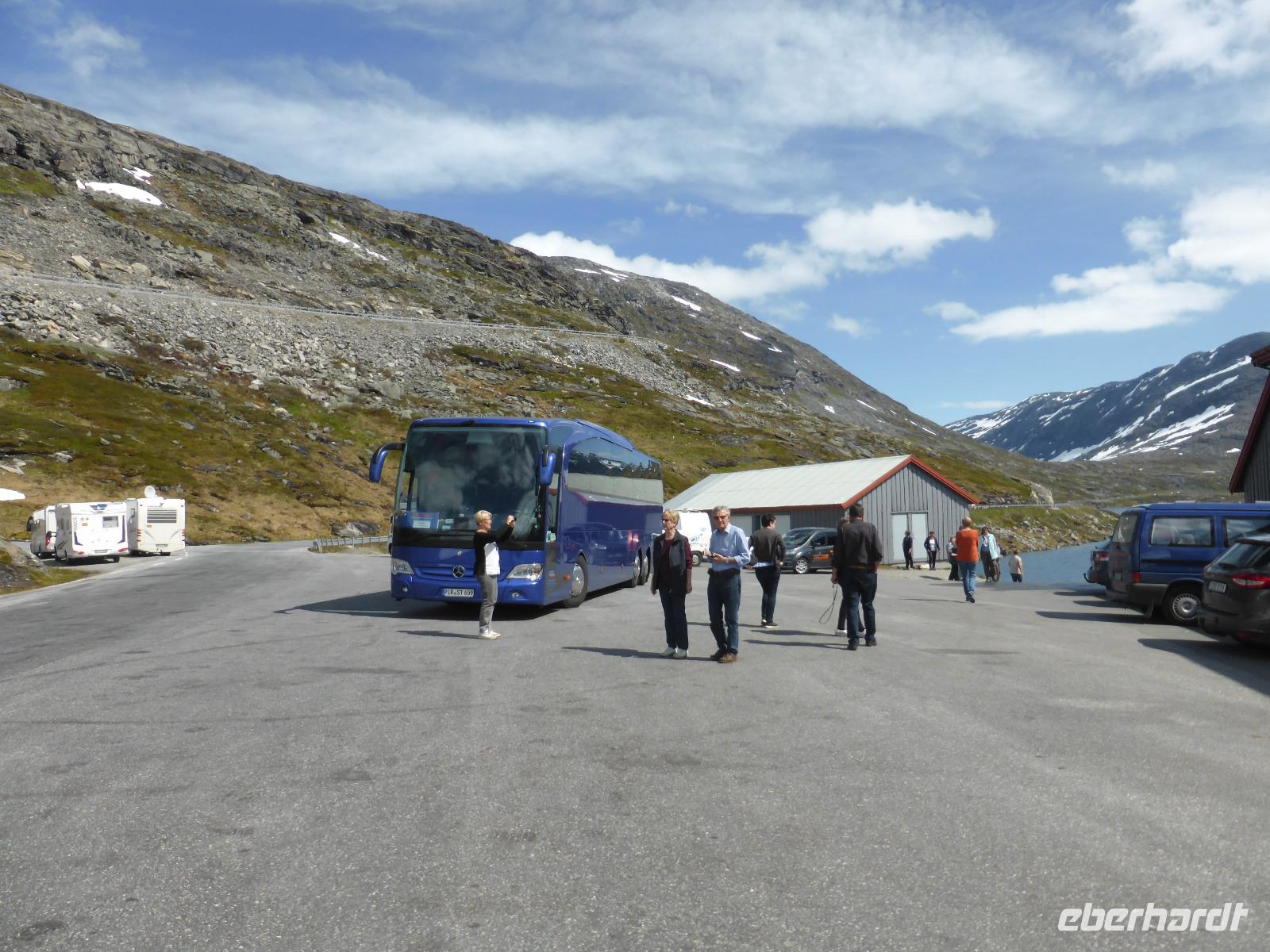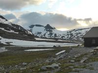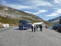 Nach unserer Abfahrt von Eidfjord ging es durch den Vavalik-Tunnel, in welchem sich gleich zwei, durch blaue Lichtinstallationen beleuchtete, Kreisverkehre befinden. Unser erster Fotostopp war am Tvindefossen-Wasserfall, in dessen Nähe sich auch ein großer Campingplatz befindet. Unvorstellbar, wie man bei dieser Lautstärke überhaupt nachts schlafen kann. Vom Tvindefossen ging es zum Naeroyfjord und damit auch nach Gudvangen, wo wir eine kleine Pause einlegten. Zu beiden Seiten ragten spektakuläre, über 1200 Meter steil aufragende Felswände empor! Zusammen mit dem Geirangerfjord steht der Naeroyfjord auf der Liste des UNESCO Weltnaturerbes. Anschließend fuhren wir zu unserer Mittagspause nach Flam und von dort hinauf zur Aussichtsplattform „Stegastein", die sich in 640 Meter Höhe befindet. Die Sicht auf den Aurlandsfjord war fantastisch! Vom Aussichtspunkt ging es dann wieder hinunter nach Aurland. Unterwegs begegneten wir an der engsten Stelle der Serpentinen weiteren Reisebussen. Durch das zeitaufwändige Rangieren kamen wir eine Stunde später als geplant in Aurland an und fuhren gleich weiter durch den Laerdalstunnel. Er ist mit 24,5 km der derzeit längste Pkw-Tunnel der Welt. Pausen legten wir anschließend am Vossabakken Wasserfall und an der Sognfjell-Hütte auf 1434 m Höhe ein. Hier lagen sogar noch richtige Eisfelder mit bläulichem Gletschereis und kleinen Schmelzseen. Der weitere Weg war ein unbefestigter Steinweg, welcher an der „Leirvassbu Mountain Lodge" inmitten der Berge und am Rand des Jotunheimen Nationalparks endete. Die Lodge war urig und rustikal sowie gut besucht von unzähligen Wanderfreunden.