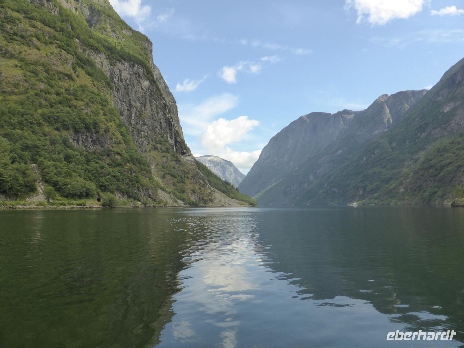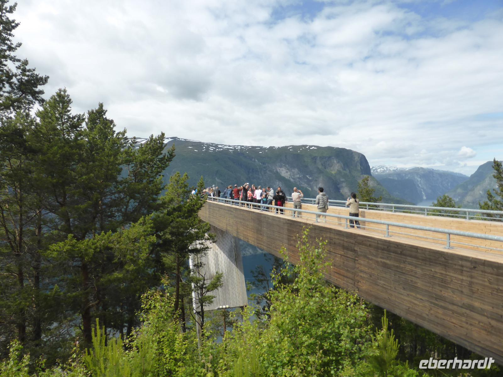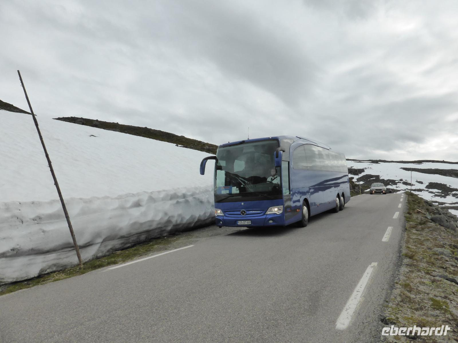 Nach unserer Abfahrt von Eidfjord ging es durch den Vavalik-Tunnel, in welchem sich gleich zwei, durch blaue Lichtinstallationen beleuchtete, Kreisverkehre befinden. Unser erster Fotostopp war am Tvindefossen-Wasserfall, in dessen Nähe sich auch ein großer Campingplatz befindet. Unvorstellbar, wie man bei dieser Lautstärke überhaupt nachts schlafen kann. Vom Tvindefossen ging es zum Naeroyfjord und damit auch nach Gudvangen, wo wir eine kleine Pause einlegten. Zu beiden Seiten ragten spektakuläre, über 1200 Meter steil aufragende Felswände empor! Zusammen mit dem Geirangerfjord steht der Naeroyfjord auf der Liste des UNESCO Weltnaturerbes. Anschließend fuhren wir zu unserer Mittagspause nach Flam und von dort hinauf zur Aussichtsplattform „Stegastein", die sich in 640 Meter Höhe befindet. Die Sicht auf den Aurlandsfjord war fantastisch! Vom Aussichtspunkt ging es dann wieder hinunter nach Aurland. Unterwegs begegneten wir an der engsten Stelle der Serpentinen weiteren Reisebussen. Durch das zeitaufwändige Rangieren kamen wir eine Stunde später als geplant in Aurland an und fuhren gleich weiter durch den Laerdalstunnel. Er ist mit 24,5 km der derzeit längste Pkw-Tunnel der Welt. Pausen legten wir anschließend am Vossabakken Wasserfall und an der Sognfjell-Hütte auf 1434 m Höhe ein. Hier lagen sogar noch richtige Eisfelder mit bläulichem Gletschereis und kleinen Schmelzseen. Der weitere Weg war ein unbefestigter Steinweg, welcher an der „Leirvassbu Mountain Lodge" inmitten der Berge und am Rand des Jotunheimen Nationalparks endete. Die Lodge war urig und rustikal sowie gut besucht von unzähligen Wanderfreunden.