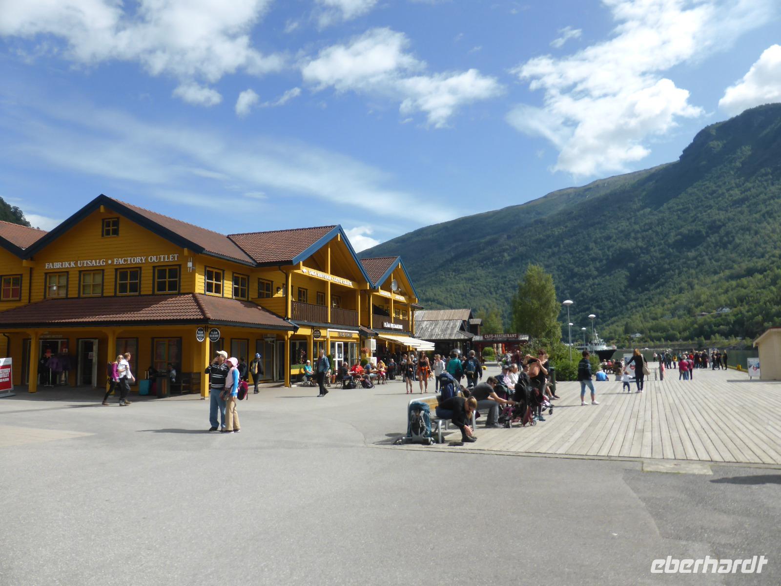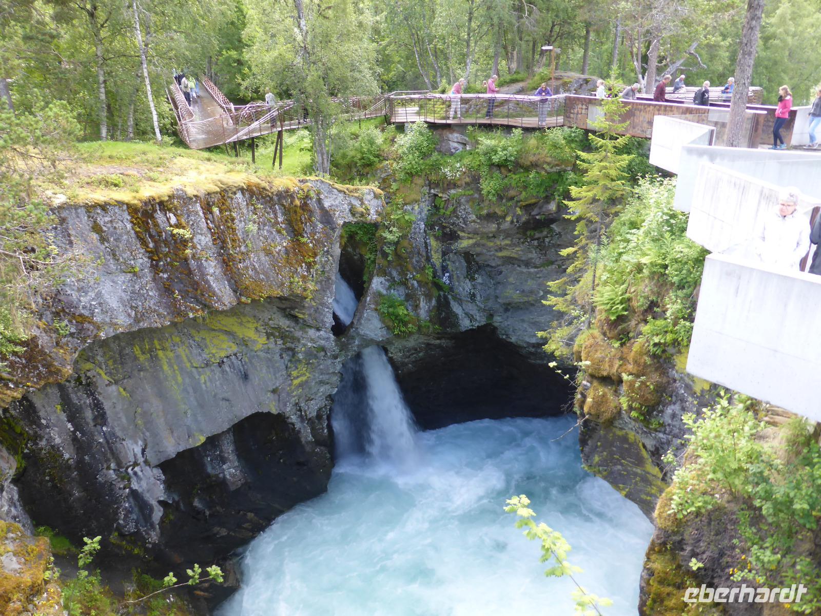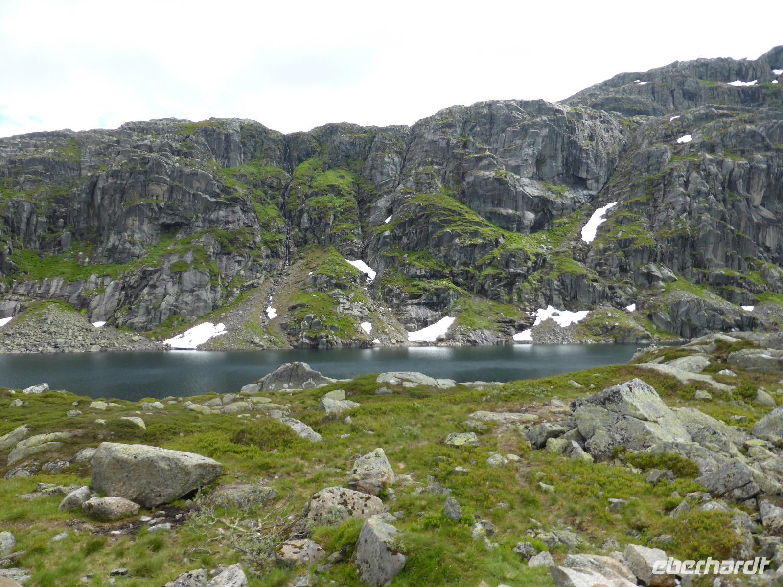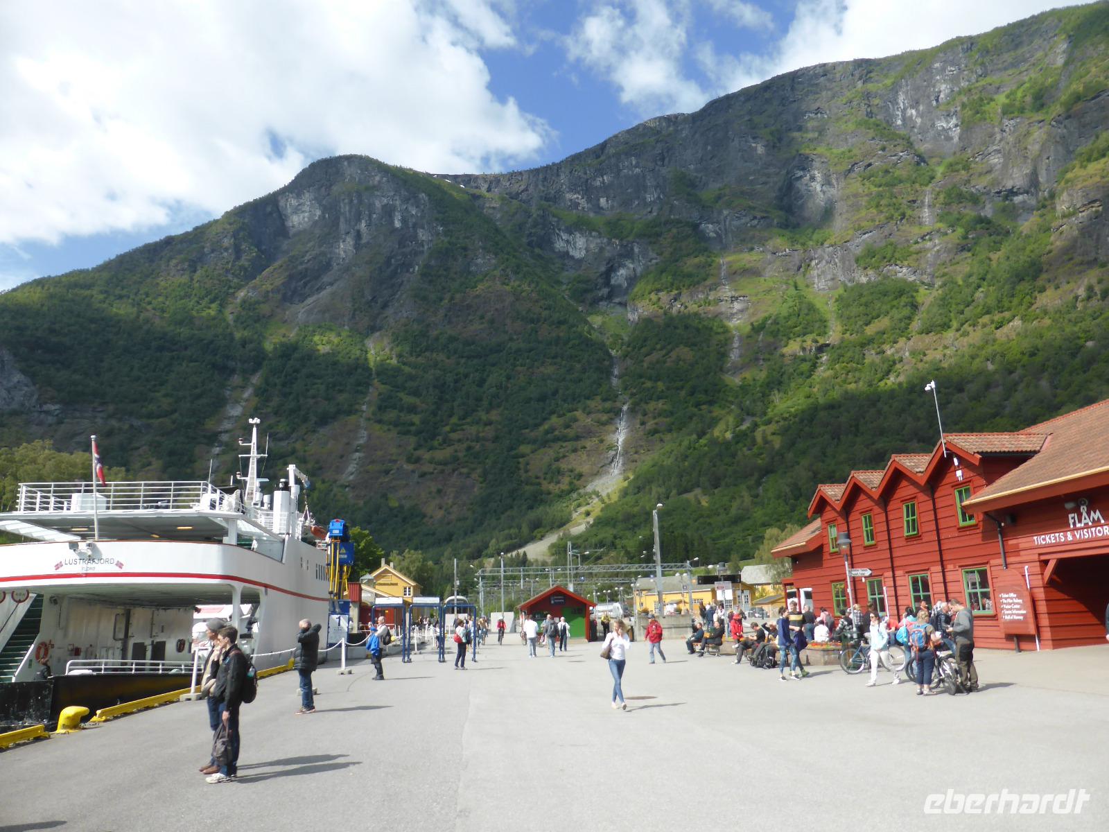 Nach unserer Abfahrt von Eidfjord ging es durch den Vavalik-Tunnel, in welchem sich gleich zwei, durch blaue Lichtinstallationen beleuchtete, Kreisverkehre befinden. Unser erster Fotostopp war am Tvindefossen-Wasserfall, in dessen Nähe sich auch ein großer Campingplatz befindet. Unvorstellbar, wie man bei dieser Lautstärke überhaupt nachts schlafen kann. Vom Tvindefossen ging es zum Naeroyfjord und damit auch nach Gudvangen, wo wir eine kleine Pause einlegten. Zu beiden Seiten ragten spektakuläre, über 1200 Meter steil aufragende Felswände empor! Zusammen mit dem Geirangerfjord steht der Naeroyfjord auf der Liste des UNESCO Weltnaturerbes. Anschließend fuhren wir zu unserer Mittagspause nach Flam und von dort hinauf zur Aussichtsplattform „Stegastein", die sich in 640 Meter Höhe befindet. Die Sicht auf den Aurlandsfjord war fantastisch! Vom Aussichtspunkt ging es dann wieder hinunter nach Aurland. Unterwegs begegneten wir an der engsten Stelle der Serpentinen weiteren Reisebussen. Durch das zeitaufwändige Rangieren kamen wir eine Stunde später als geplant in Aurland an und fuhren gleich weiter durch den Laerdalstunnel. Er ist mit 24,5 km der derzeit längste Pkw-Tunnel der Welt. Pausen legten wir anschließend am Vossabakken Wasserfall und an der Sognfjell-Hütte auf 1434 m Höhe ein. Hier lagen sogar noch richtige Eisfelder mit bläulichem Gletschereis und kleinen Schmelzseen. Der weitere Weg war ein unbefestigter Steinweg, welcher an der „Leirvassbu Mountain Lodge" inmitten der Berge und am Rand des Jotunheimen Nationalparks endete. Die Lodge war urig und rustikal sowie gut besucht von unzähligen Wanderfreunden.