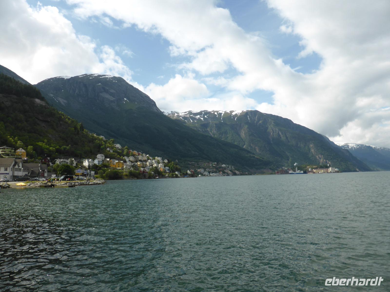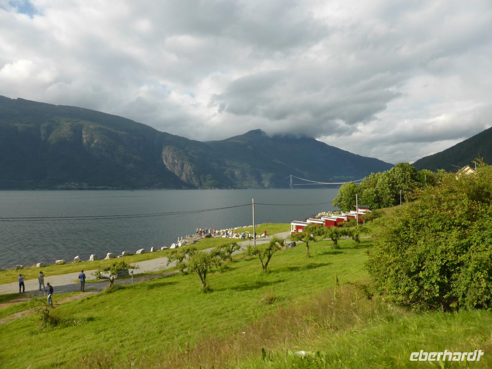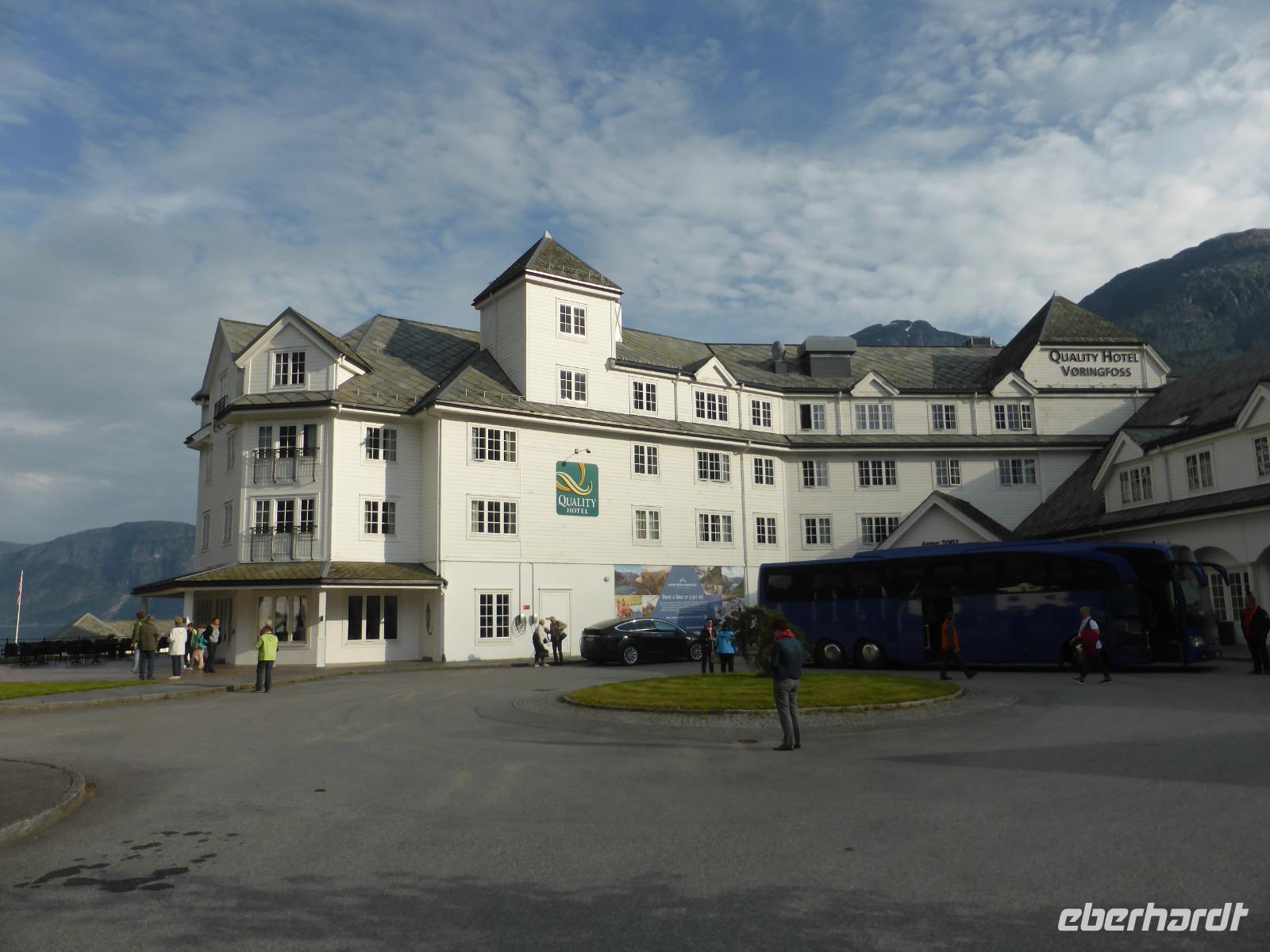 Am Morgen standen zunächst zwei Fährüberfahrten, von Stavanger nach Tau und von Hjelmeland nach Nesvik, auf dem Programm. Nach mehreren Fotostopps wählten wir einen Parkplatz mit Blick auf den Saudafjord für unsere Mittagspause. Anschließend fuhren wir über das Saudafjell und bewältigten die Passhöhe auf etwa 980 Metern. Die Sicht war ausgesprochen gut. Ein weiterer Höhepunkt war unser Halt am Wasserfall „Latefoss". Obwohl es nicht regnete, wurden wir nass. Dieses Mal vom Sprühnebel des Wasserfalls. Danach fuhren wir nach Odda, machten dort Pause und fuhren anschließend an der Ostseite des Soerfjorden entlang, einer ertragreichen Obstregion, in der vor allem Kirschen, Äpfel und Erdbeeren angebaut werden. Unsere Übernachtung war in Eidfjord und wie der Name schon vermuten lässt, lag unser Hotel direkt am Wasser.