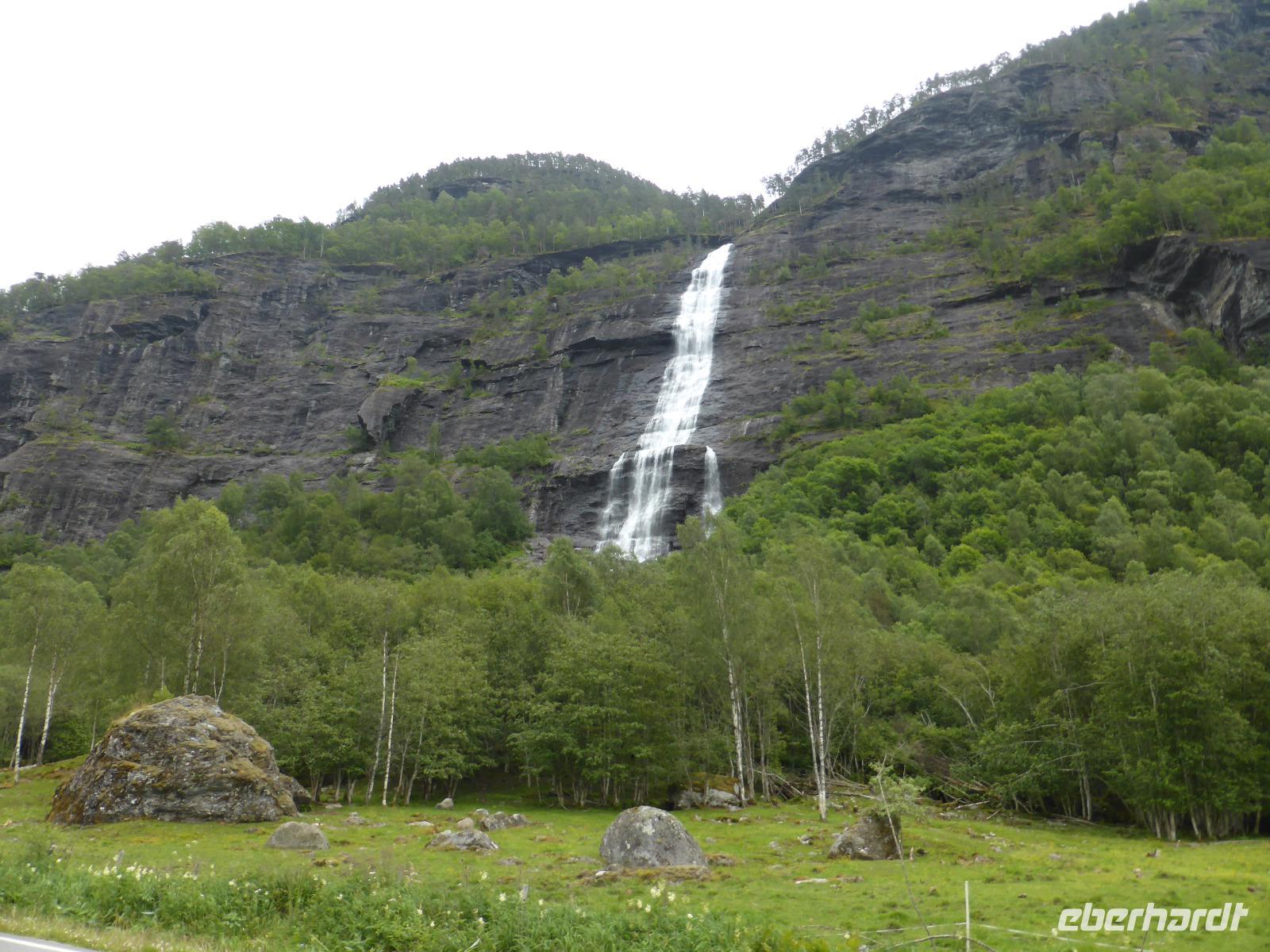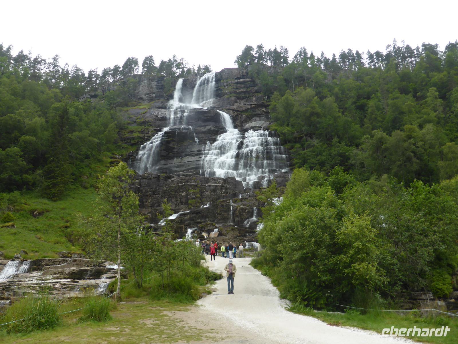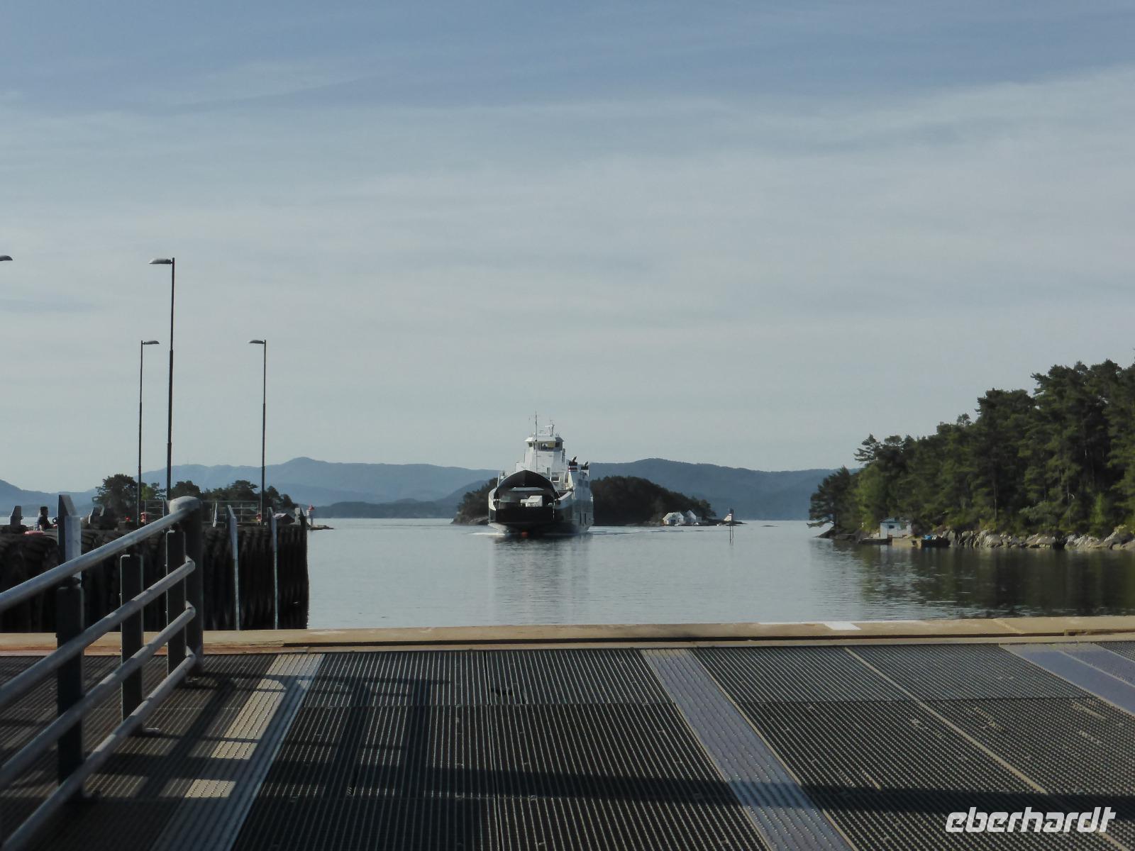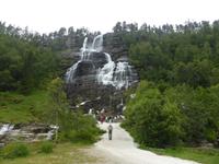 Am Morgen standen zunächst zwei Fährüberfahrten, von Stavanger nach Tau und von Hjelmeland nach Nesvik, auf dem Programm. Nach mehreren Fotostopps wählten wir einen Parkplatz mit Blick auf den Saudafjord für unsere Mittagspause. Anschließend fuhren wir über das Saudafjell und bewältigten die Passhöhe auf etwa 980 Metern. Die Sicht war ausgesprochen gut. Ein weiterer Höhepunkt war unser Halt am Wasserfall „Latefoss". Obwohl es nicht regnete, wurden wir nass. Dieses Mal vom Sprühnebel des Wasserfalls. Danach fuhren wir nach Odda, machten dort Pause und fuhren anschließend an der Ostseite des Soerfjorden entlang, einer ertragreichen Obstregion, in der vor allem Kirschen, Äpfel und Erdbeeren angebaut werden. Unsere Übernachtung war in Eidfjord und wie der Name schon vermuten lässt, lag unser Hotel direkt am Wasser.